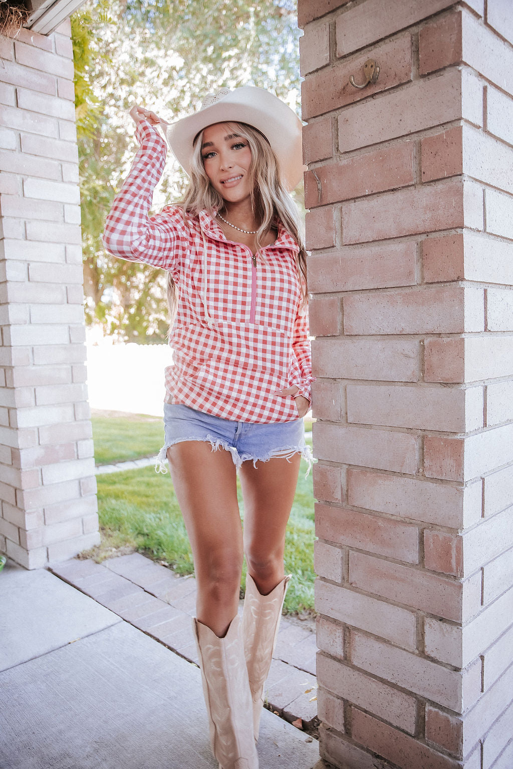 Ampersand Avenue ~ Halfzip Sweatshirt ~ Ladybug Picnic ~ Red and White Checkered Print ~ Available in CURVY!