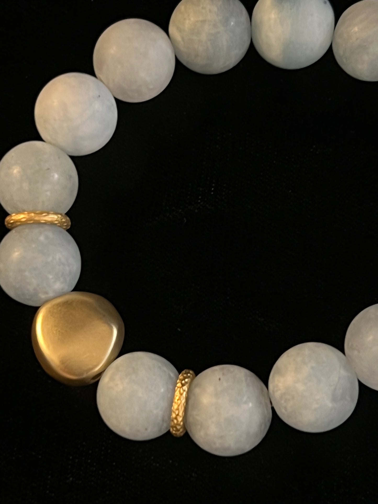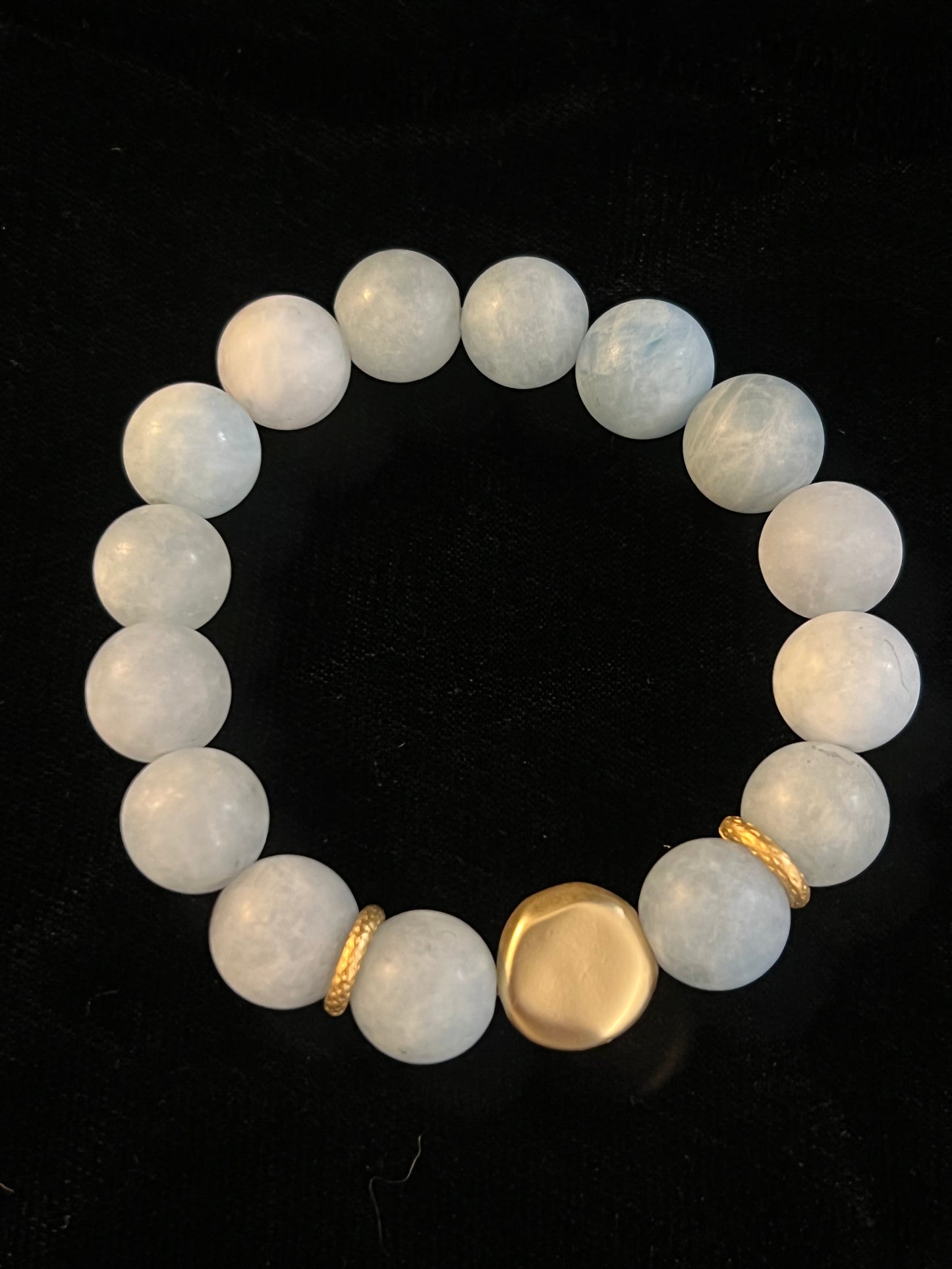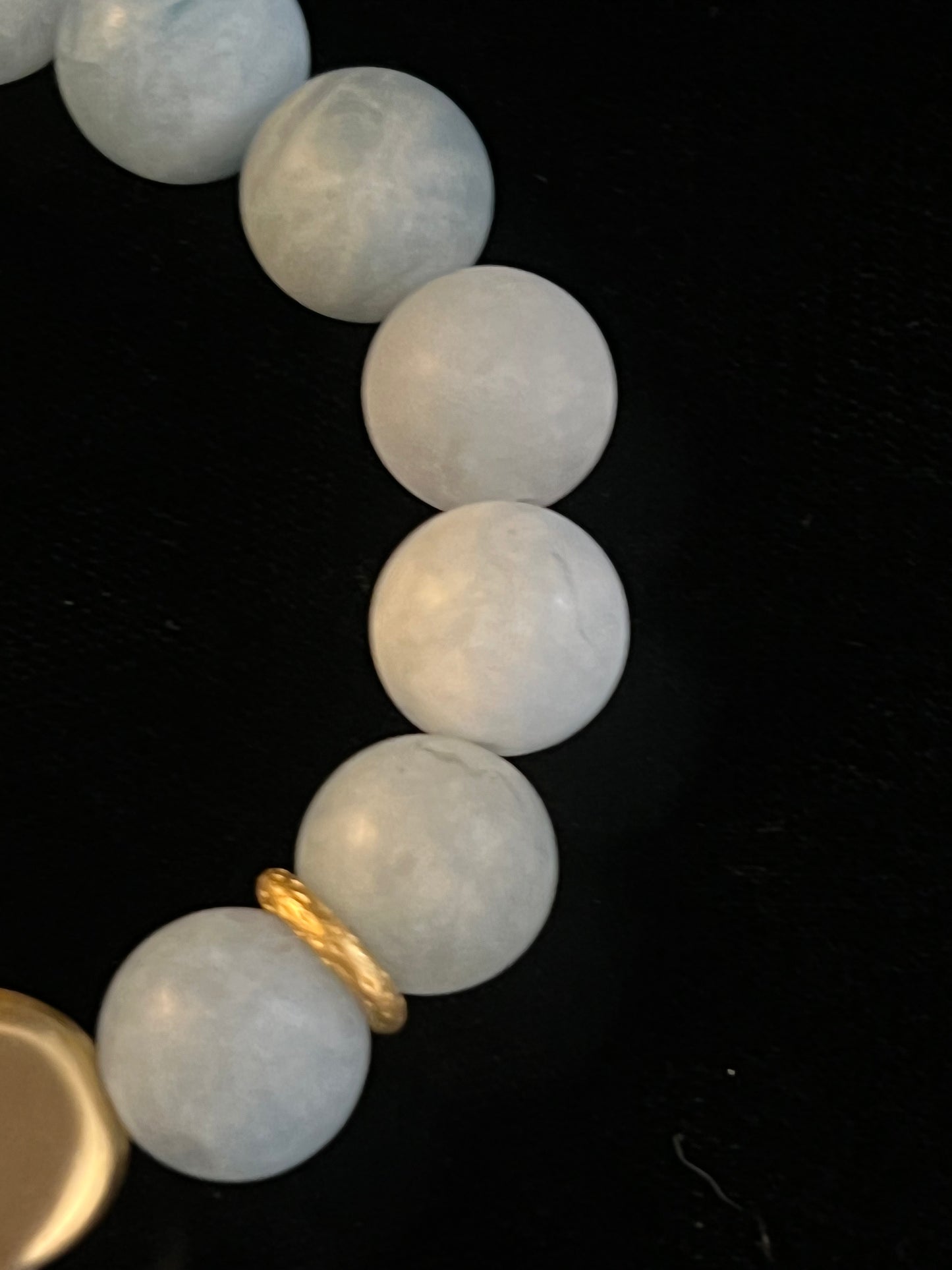 This matte aqua marine 12 mm bracelet features a matte golden nugget charm with textured golden loops on either side. These stones are natural, not plastic! Bracelet stretches - so one size fits most. This bracelet is one of a kind - the bracelet you see will be the bracelet you receive!