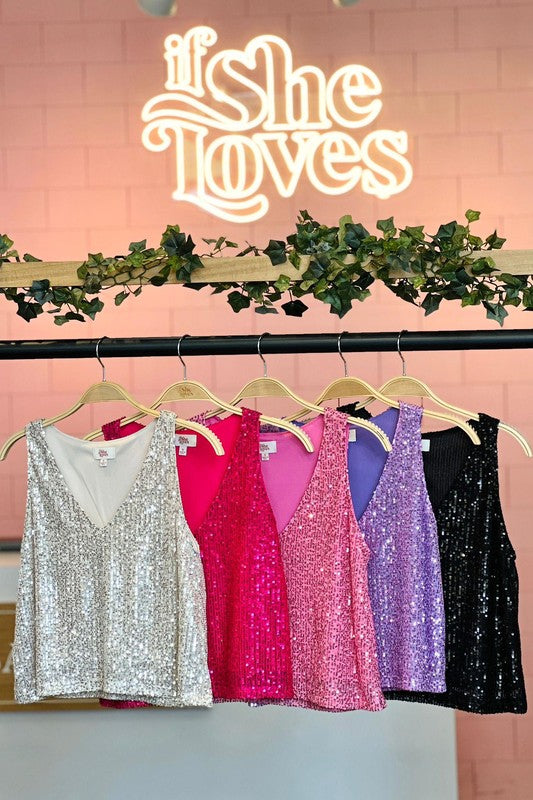 This If She Loves Shining Star Sequin Top is exclusively crafted with a V-Neckline, tank top silhouette and glimmering sequin embellishments throughout. Fully lined with a luxe feel, this look is proudly made in the USA!