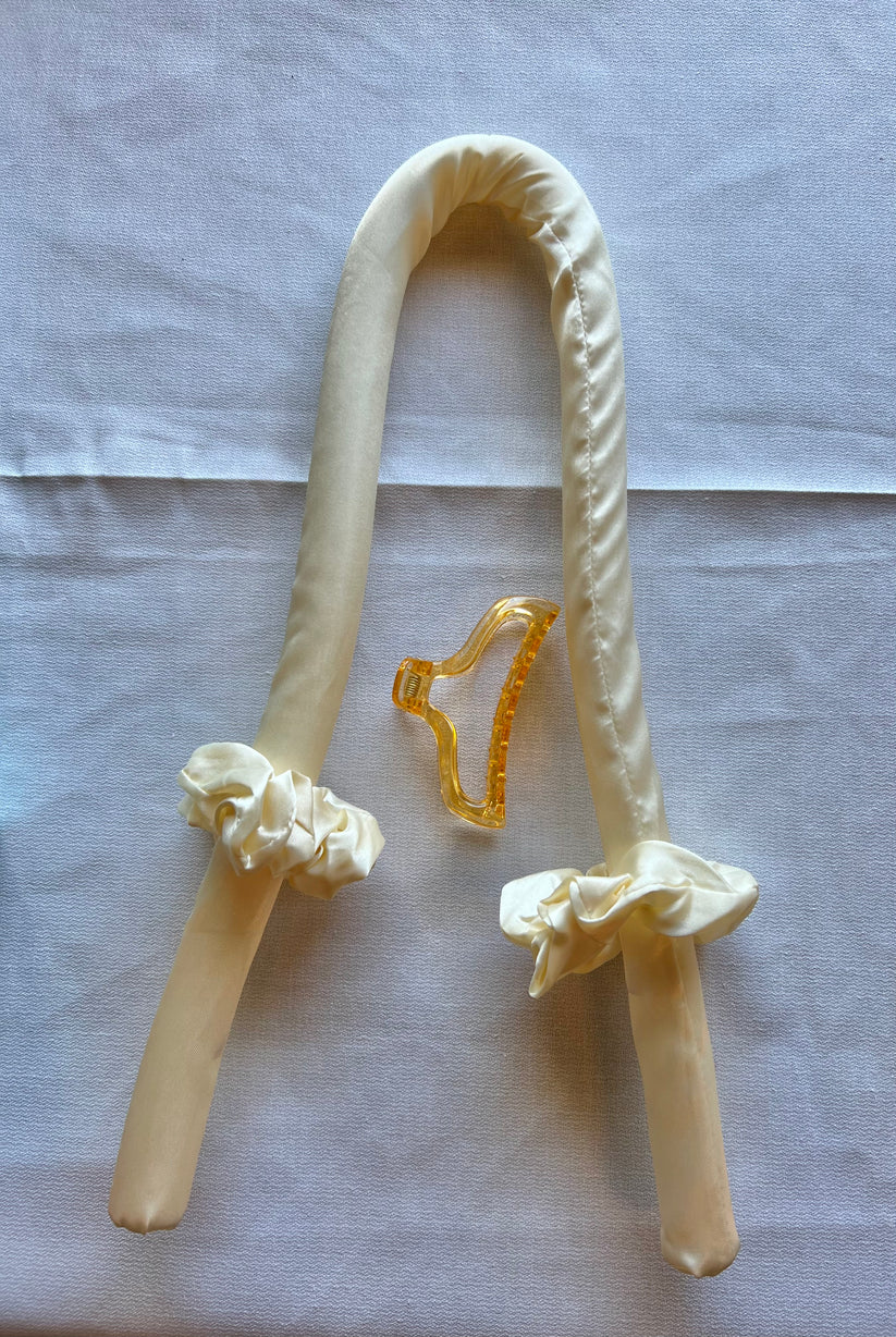 Kit includes 1 satin heatless rod curler, 1 hair clip, and 2 satin hair scrunchies, as well as step by step instructions!