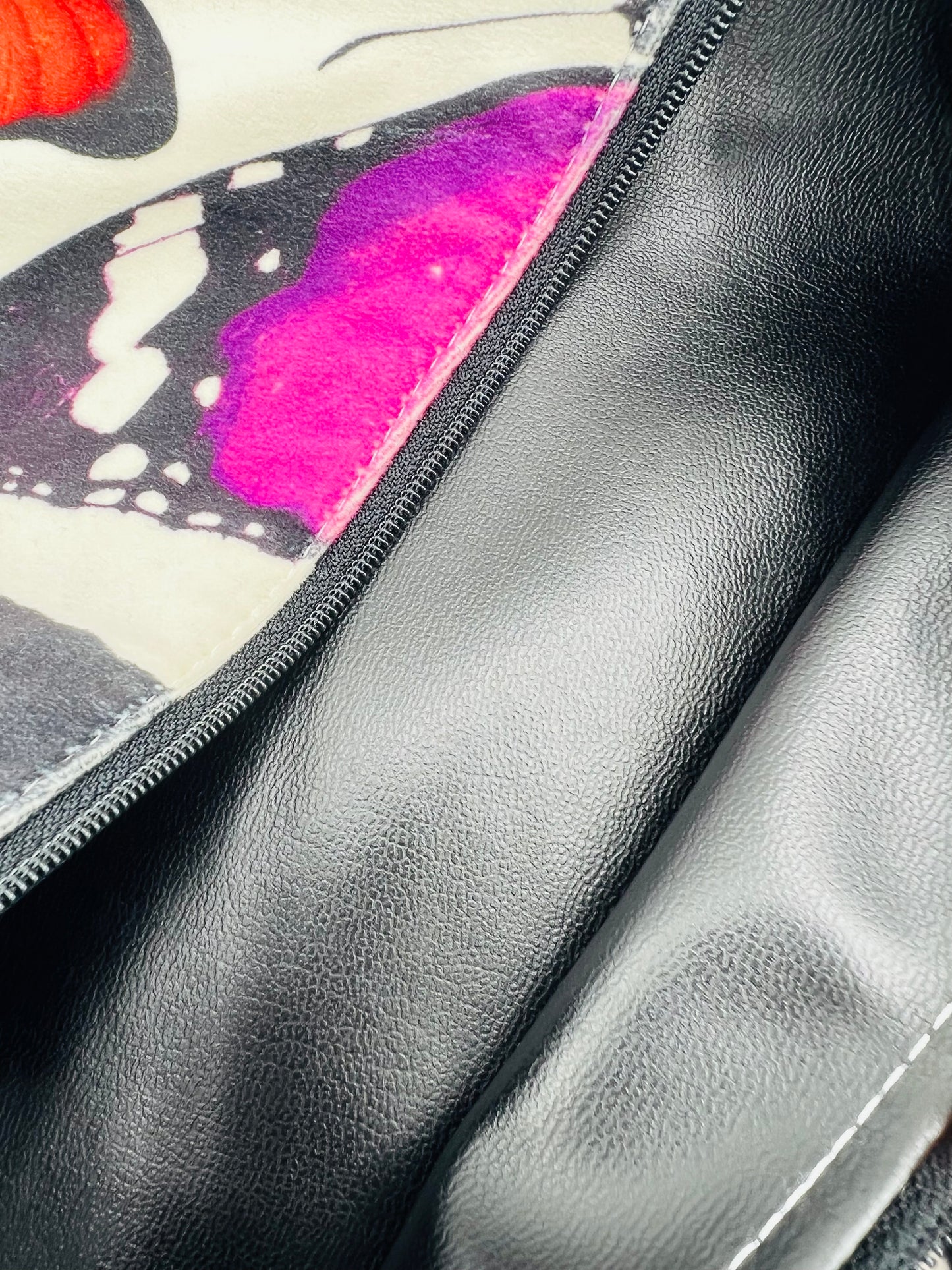 There is a story behind this design - Elena went to a trade show and saw a tote bag with this fabric and asked if she could order Mini & Medium bags. I was told that the tote bag was the last item in existence with that fabric/print, BUT, they could custom make some for her with the absolute last of the material. SCORE! As individual as butterflies, the layout of the butterflies are unique to each bag. No two bags are the same. What they will have are vibrant butterfly designs on a soft velveteen exterior. Once they are gone, they are gone forever!