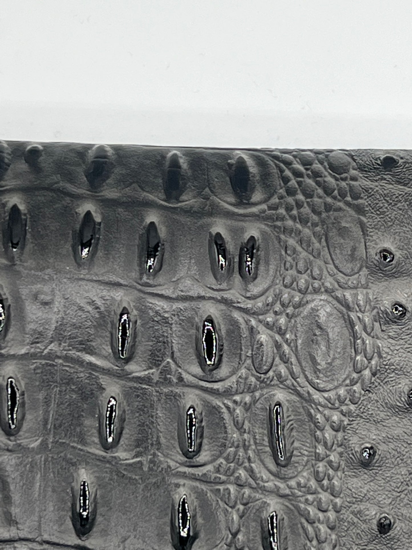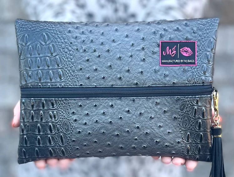The Steel bag is a Ostrich vegan leather exterior with a onyx wipeable interior.