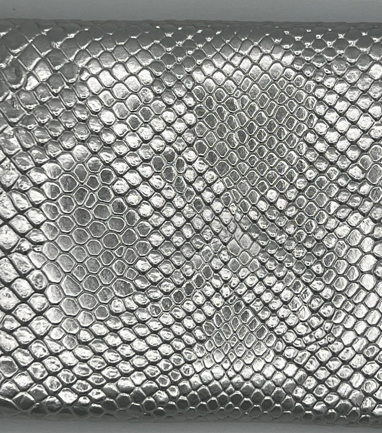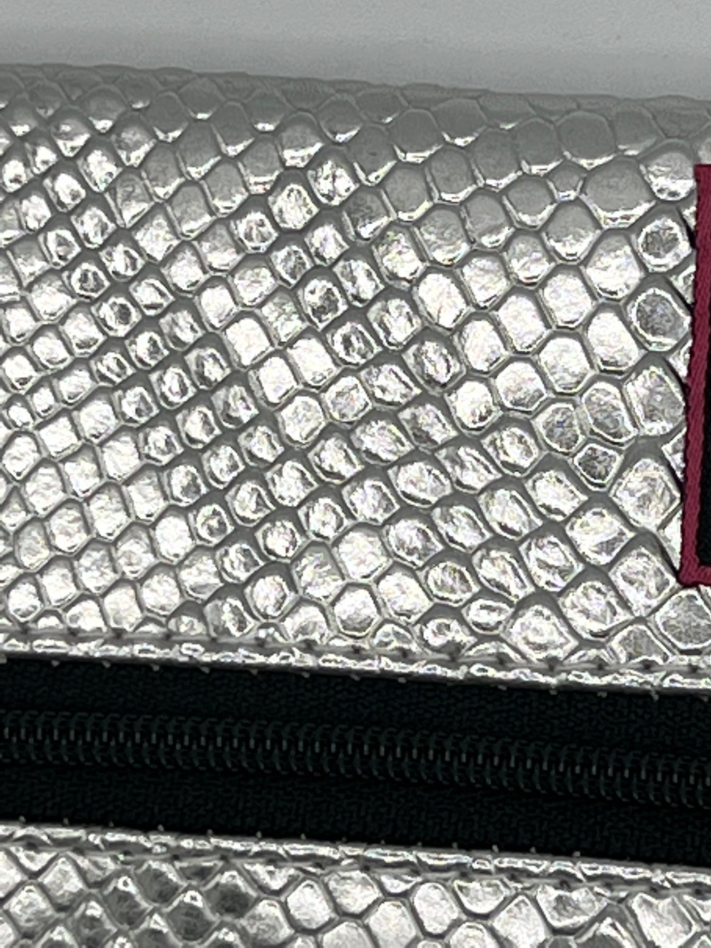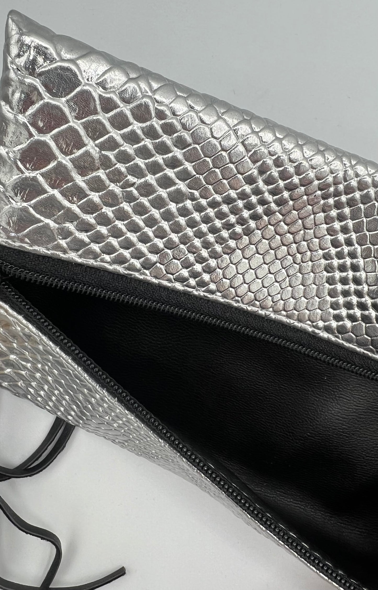The Silver Serpent Onyx bag is a silver metallic vegan snakeskin exterior with our MJ Signature black wipeable interior.