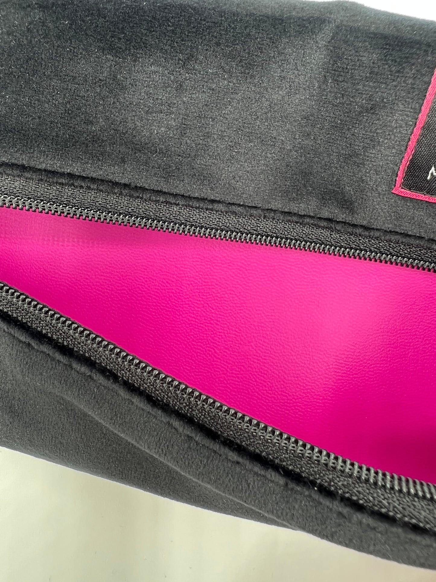 The Sienna bag has a black velvet exterior. It features our MJ Signature designer pink wipeable interior.