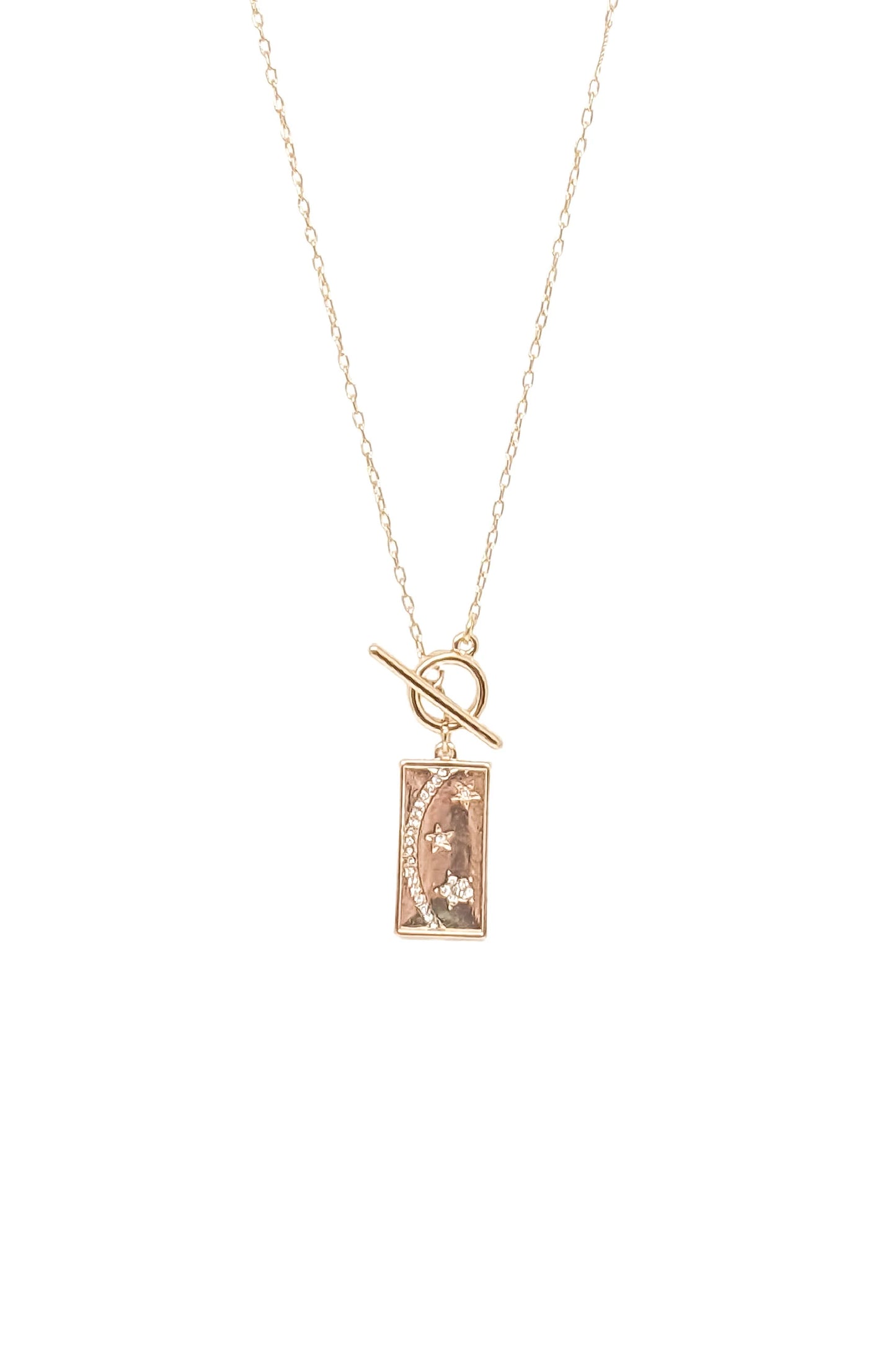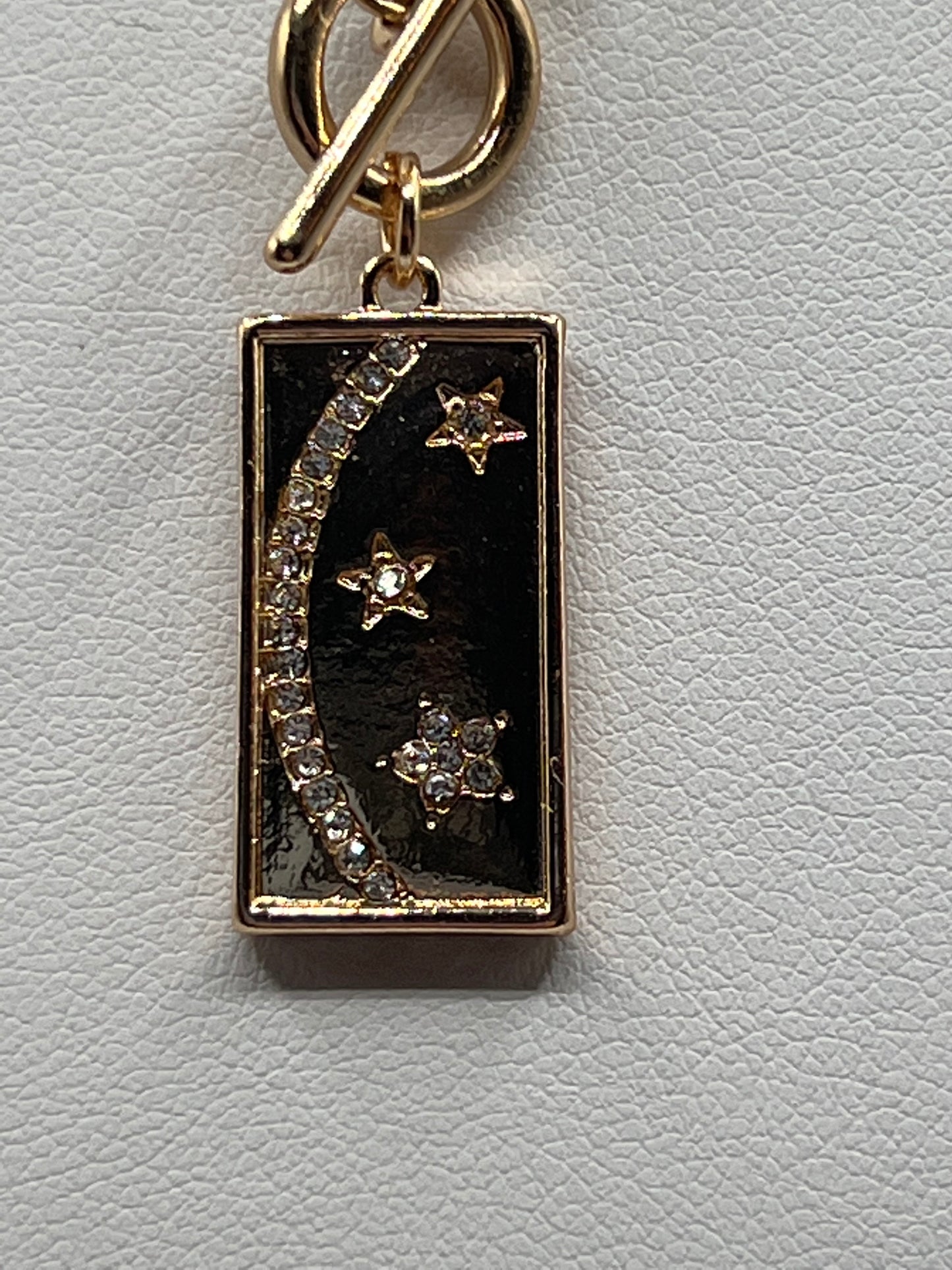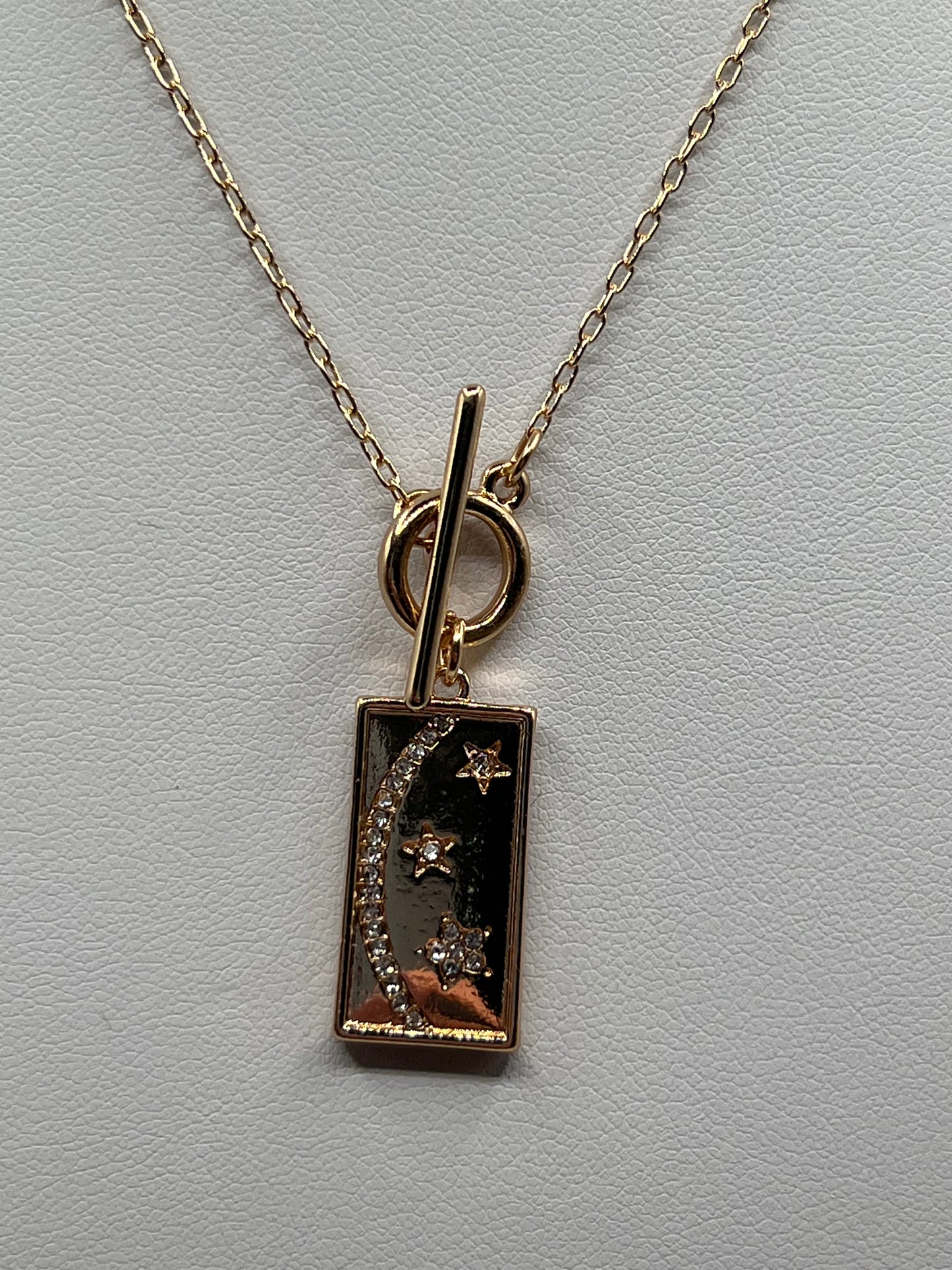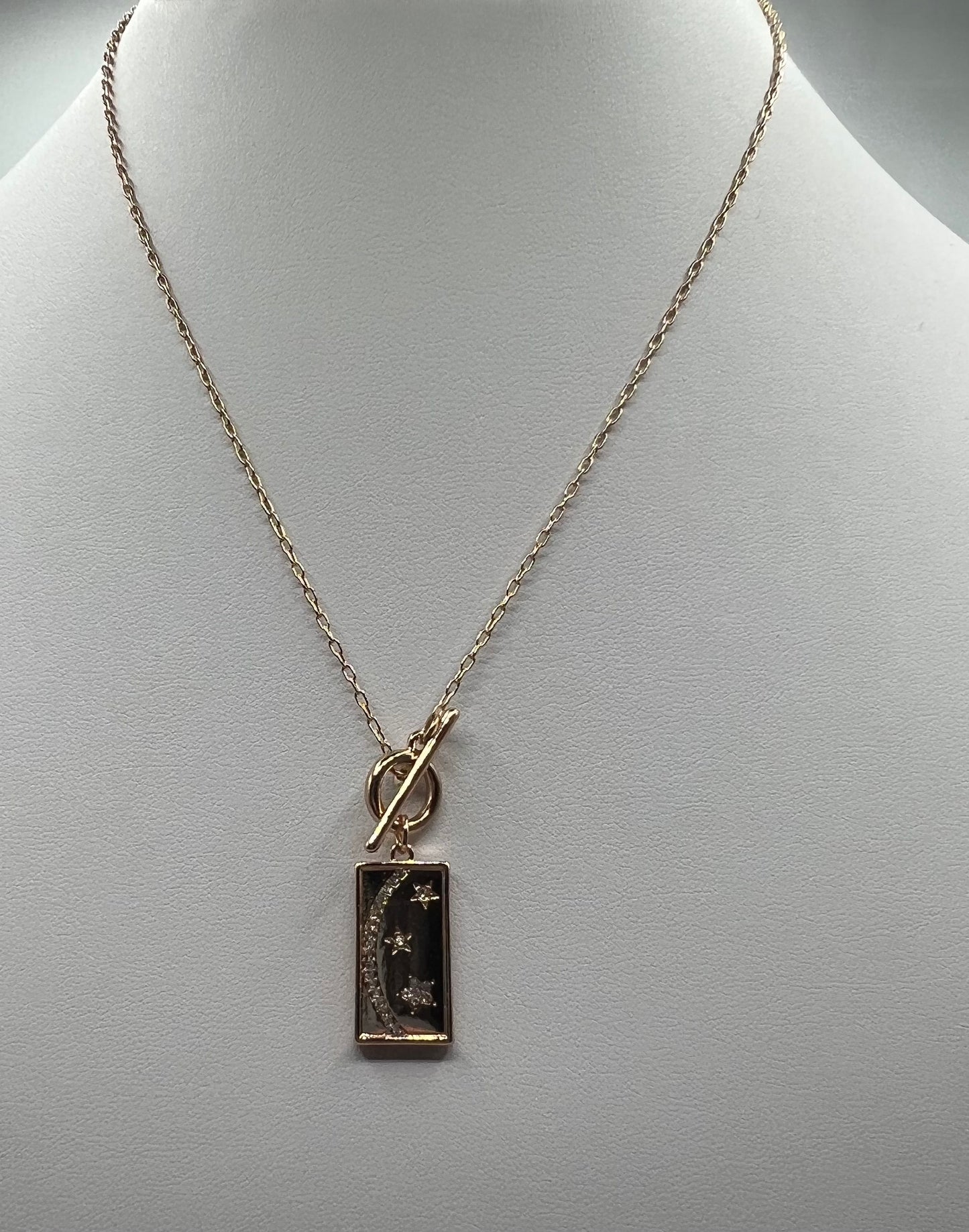 The Alondra Necklace is simple but yet has intricate detail to look like a designer piece! The chain forms a thin goldtone rope that is pulled through a circular finding. Attached to the circular finding is a rectangular reversible charm (measures ~ 3/4") with a slice of moon and 3 stars adorned in crystals on one side and on the other side of the charm is a textured sunburst-like design.