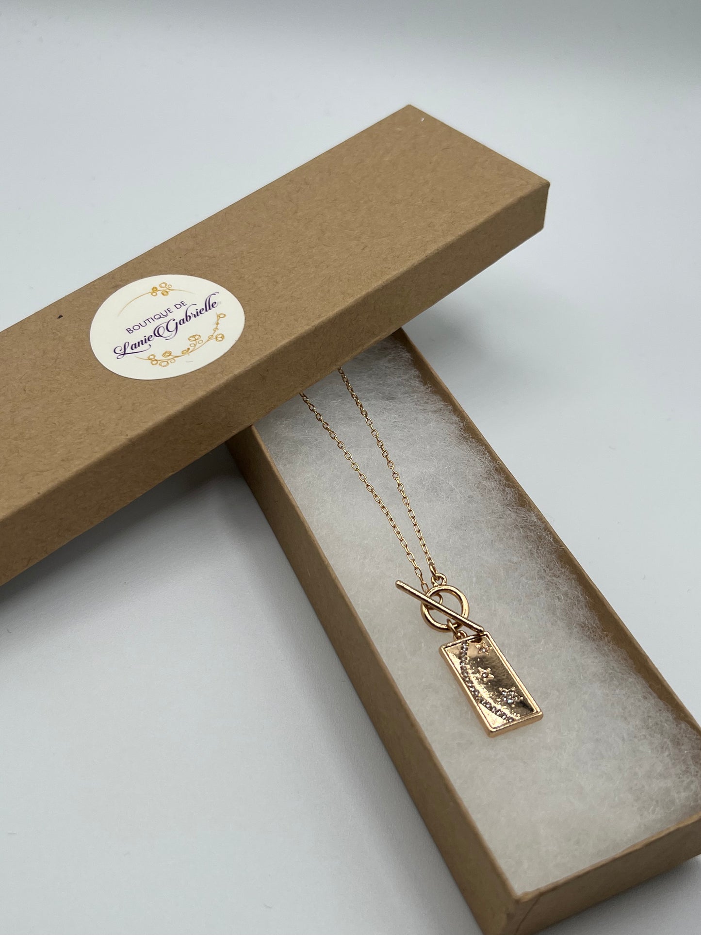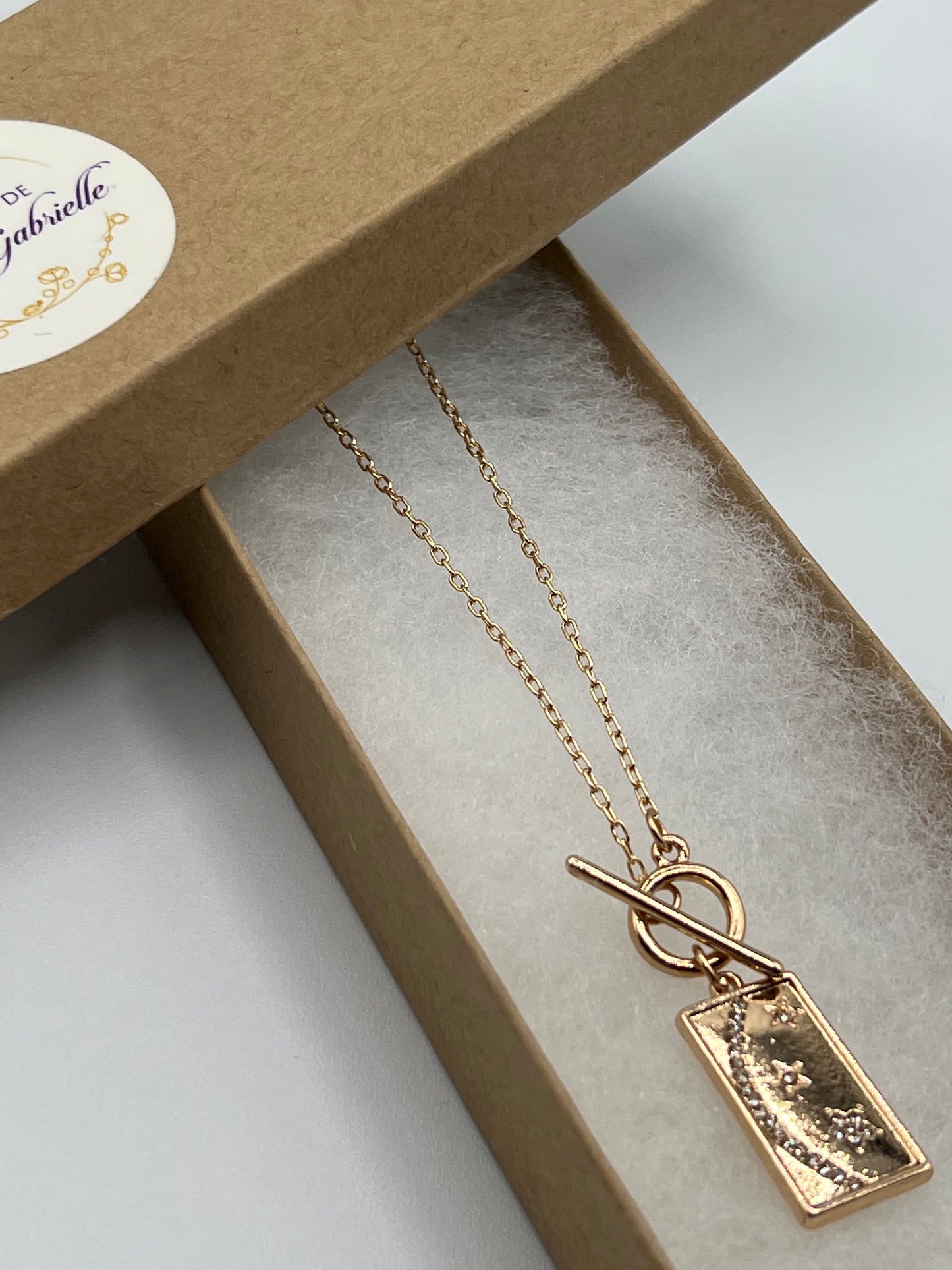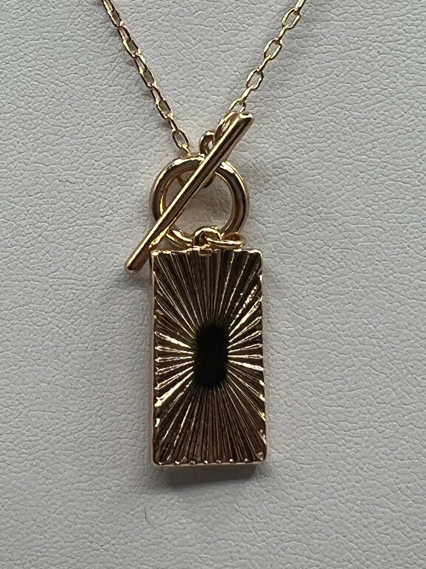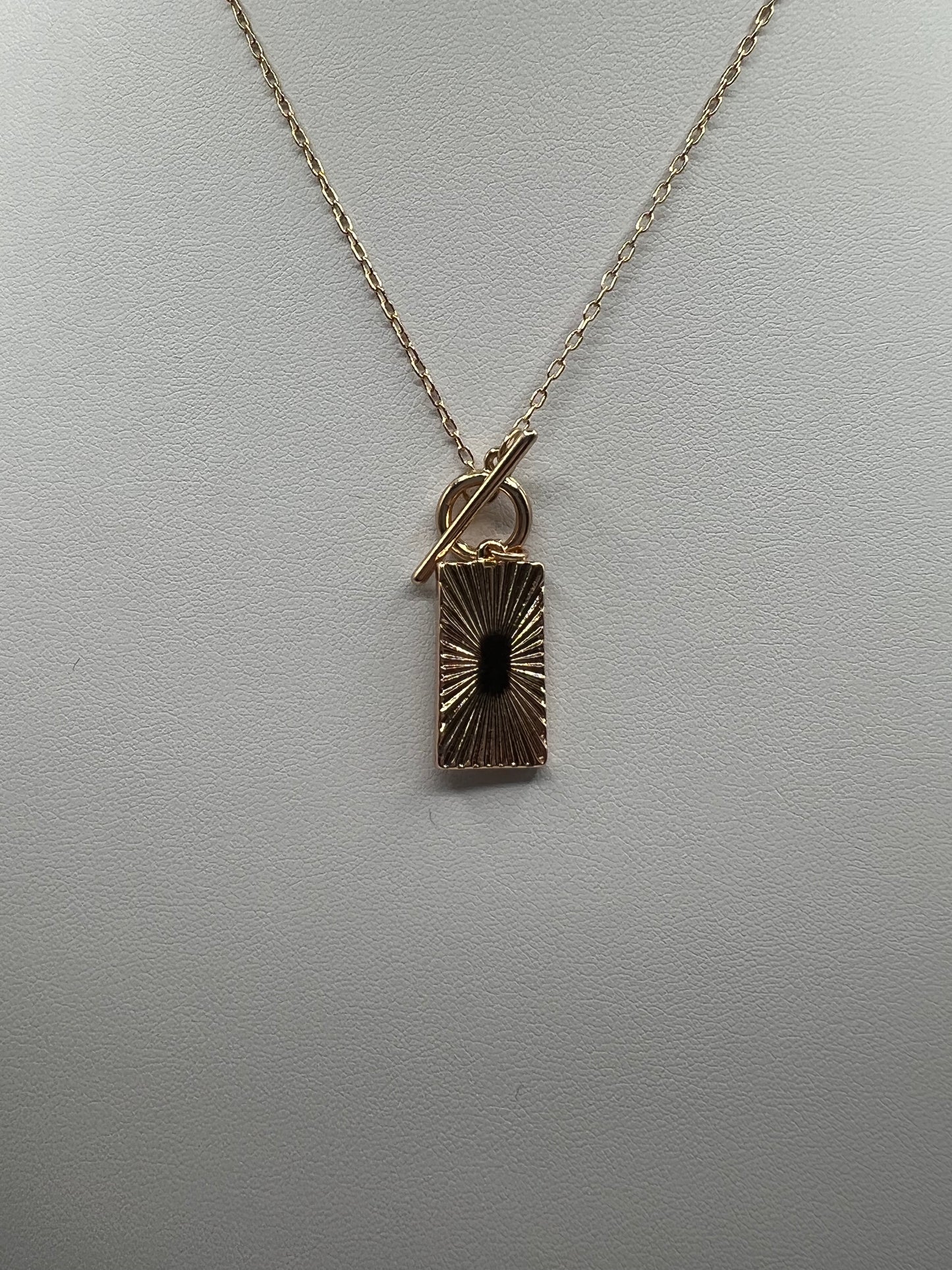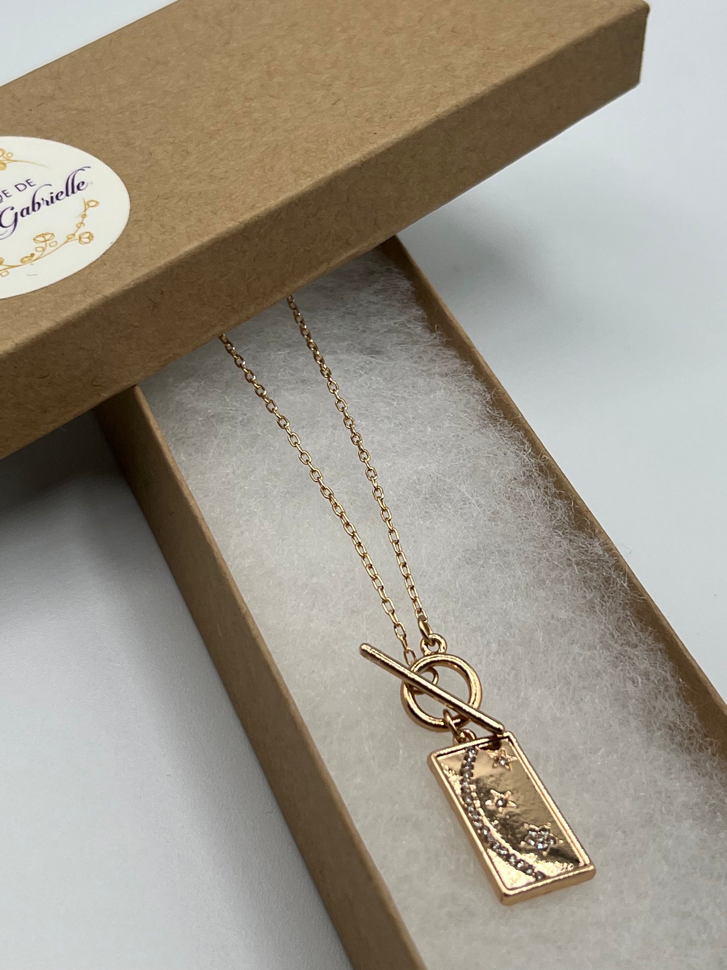 The Alondra Necklace is simple but yet has intricate detail to look like a designer piece! The chain forms a thin goldtone rope that is pulled through a circular finding. Attached to the circular finding is a rectangular reversible charm (measures ~ 3/4") with a slice of moon and 3 stars adorned in crystals on one side and on the other side of the charm is a textured sunburst-like design.