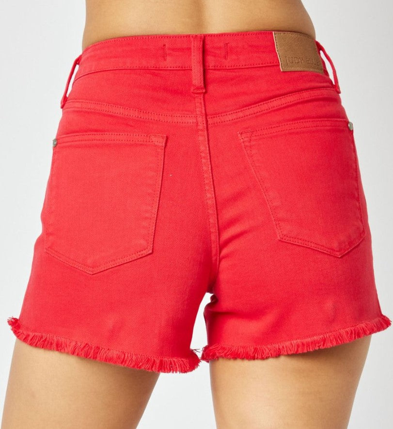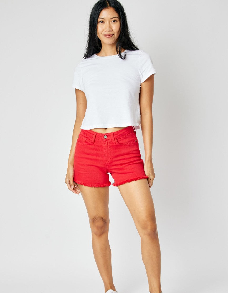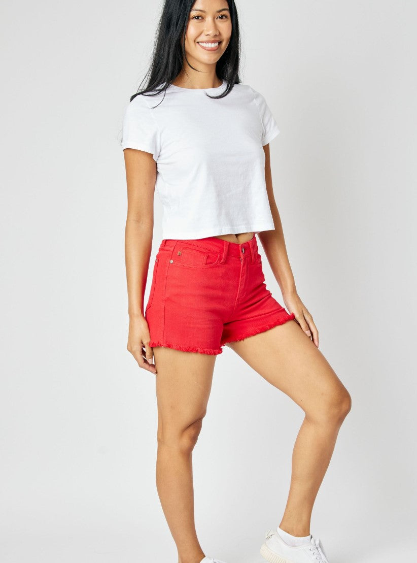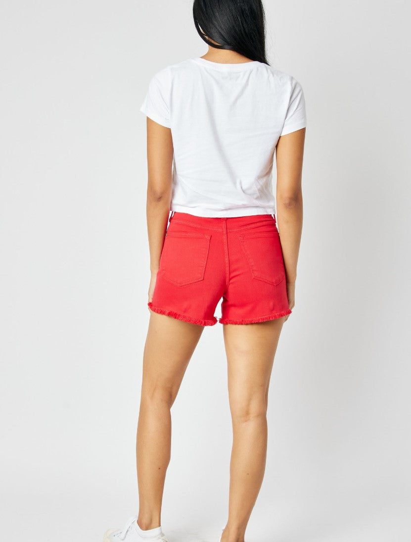 Judy Blue Mid Rise Garment Dyed Fray Hem Shorts - Style 150242 ~ RED!