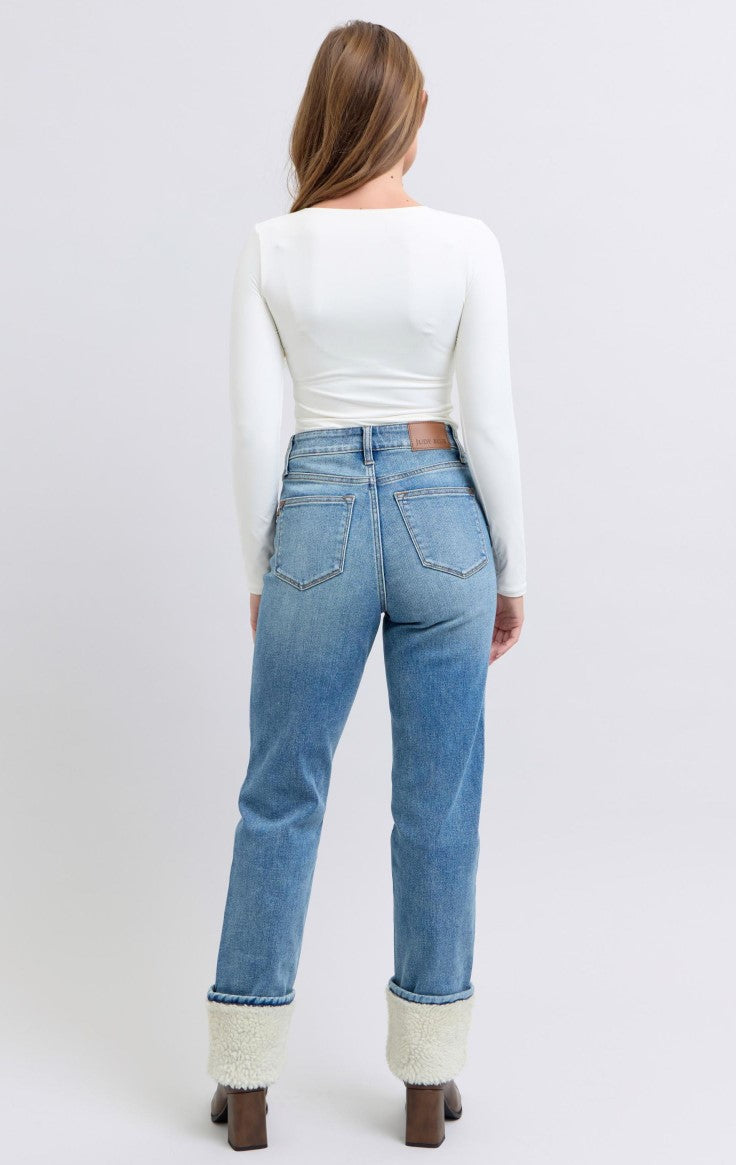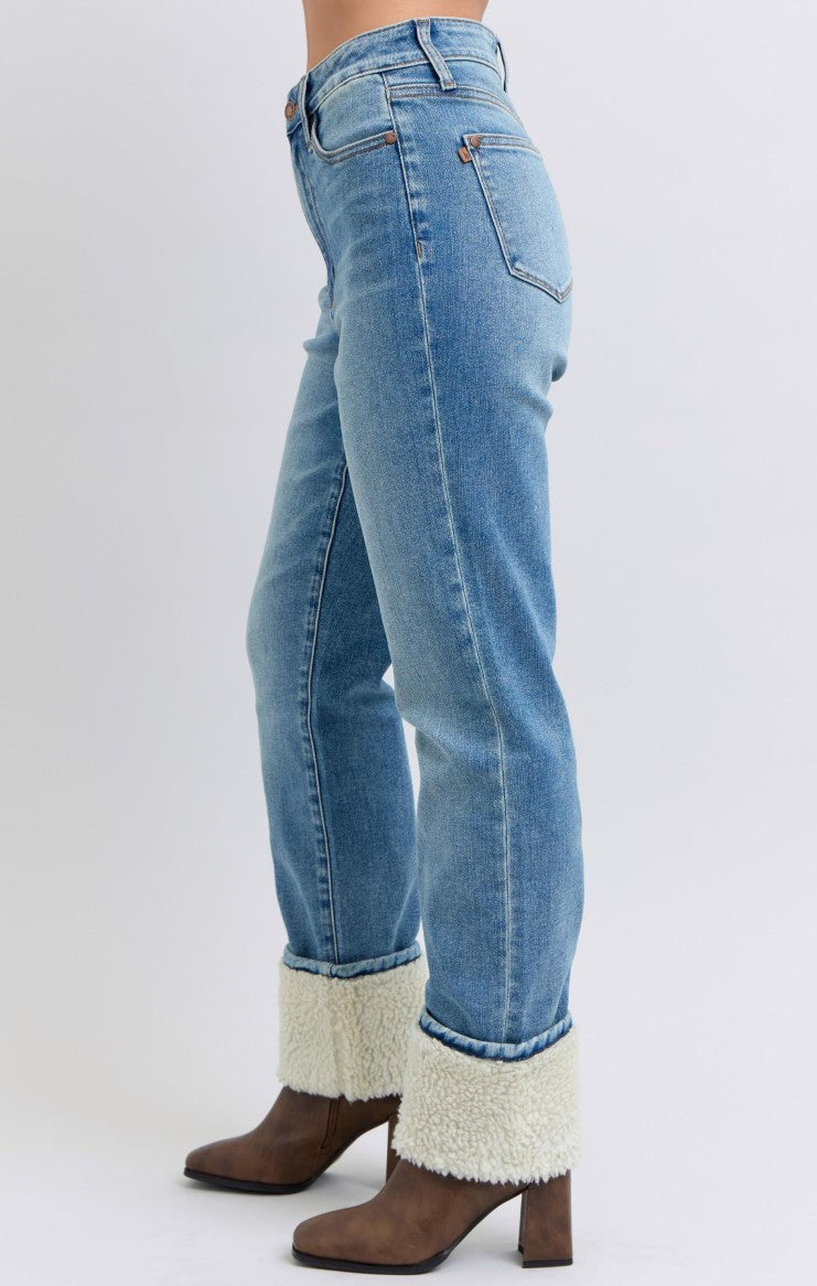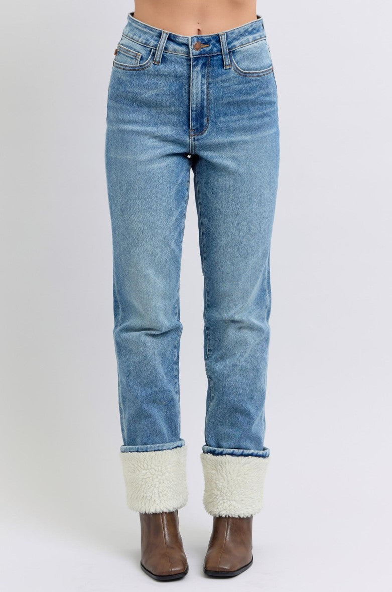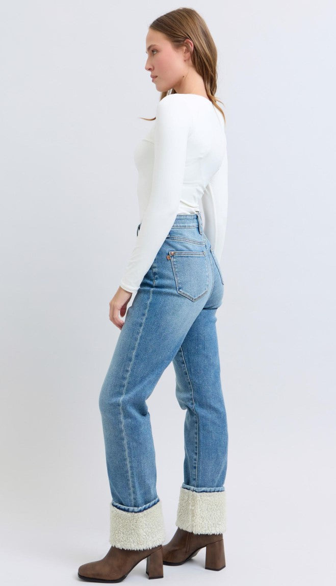 Judy Blue ~ High Waisted Shearling Cuff Straight Jeans ~ Medium Wash ~ Available in CURVY!