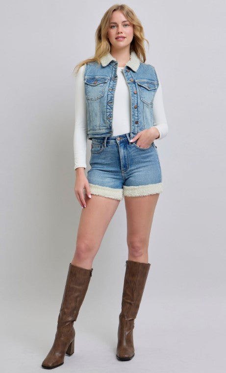 Adding to Judy Blue's Shearling Collection - the High Waist Tummy Control Shearling Cuff Shorts! Matches perfectly with the Shearling Vest from Judy Blue - or if you want shearling in jeans, we have them too!