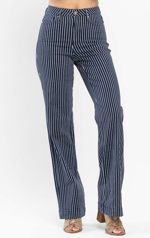 Denim with a twist! Judy Blue's signature stretch in a dark denim with white stripe. Comfortable and different!