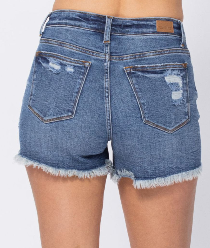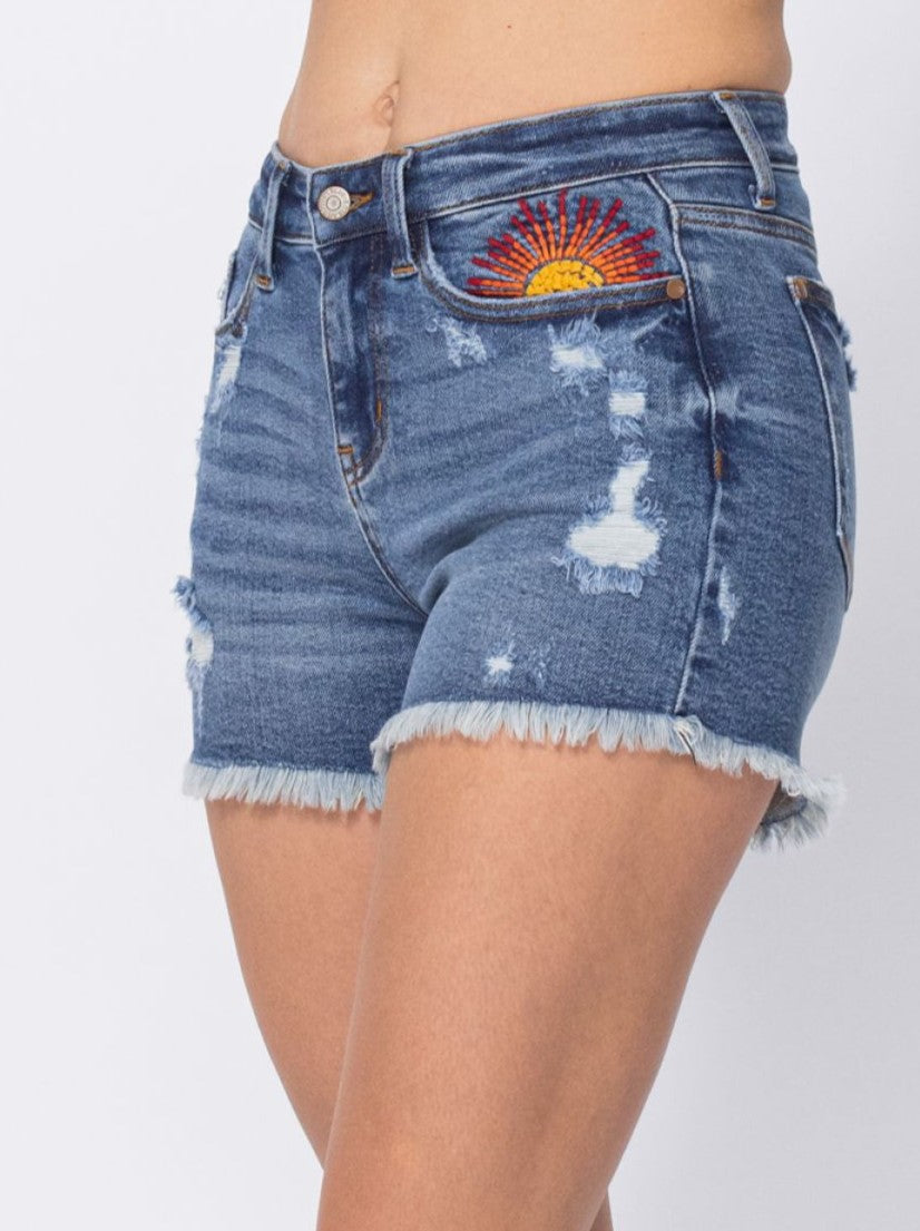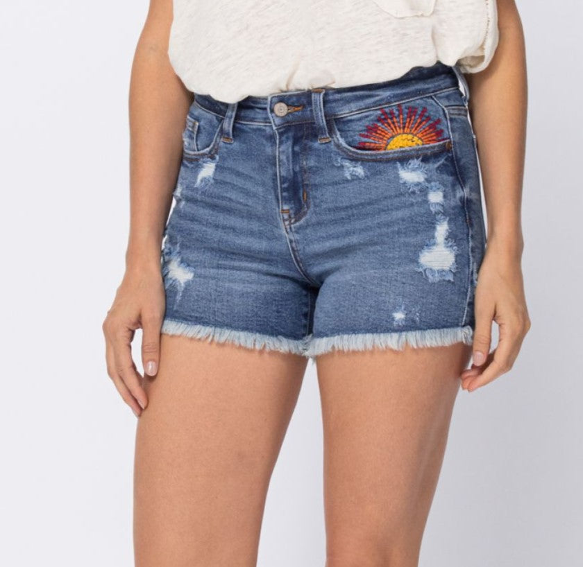 Judy Blue Medium Wash Hi-Rise Sun Embroidery Cut Off Shorts ~ Style 150112