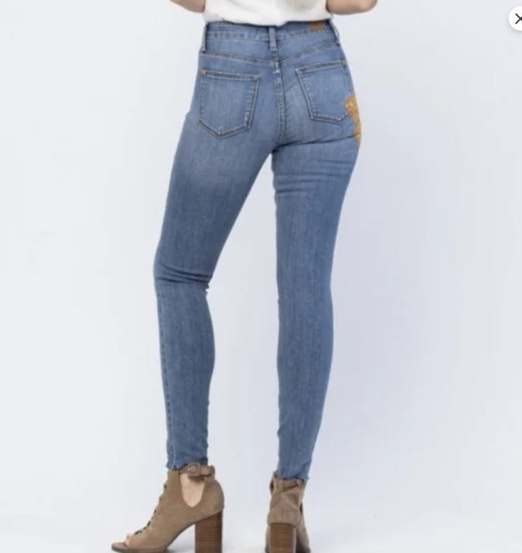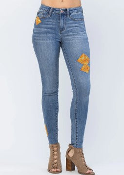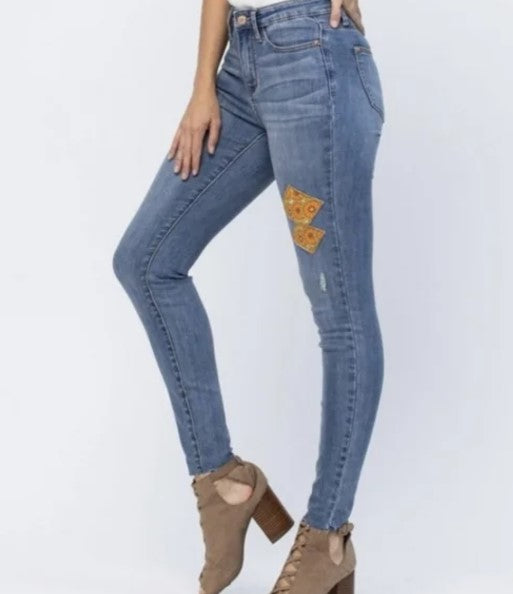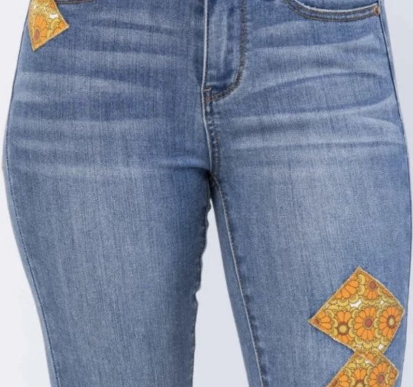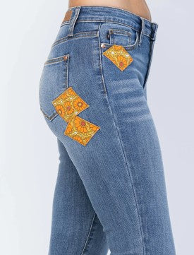 Judy Blue Mid-Rise 70s Orange Patch Skinny Jeans ~ Style 88507