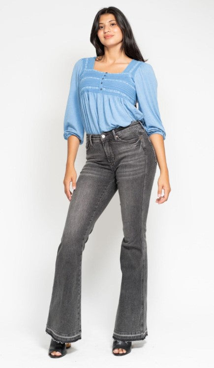 Judy Blue - MidRise Tummy Control Washed Gray Release Hem Flare Jeans. Tired of the everyday blue jeans? We were - and we adore these washed gray flare jeans from Judy Blue. Soft, stylish and stretchy!