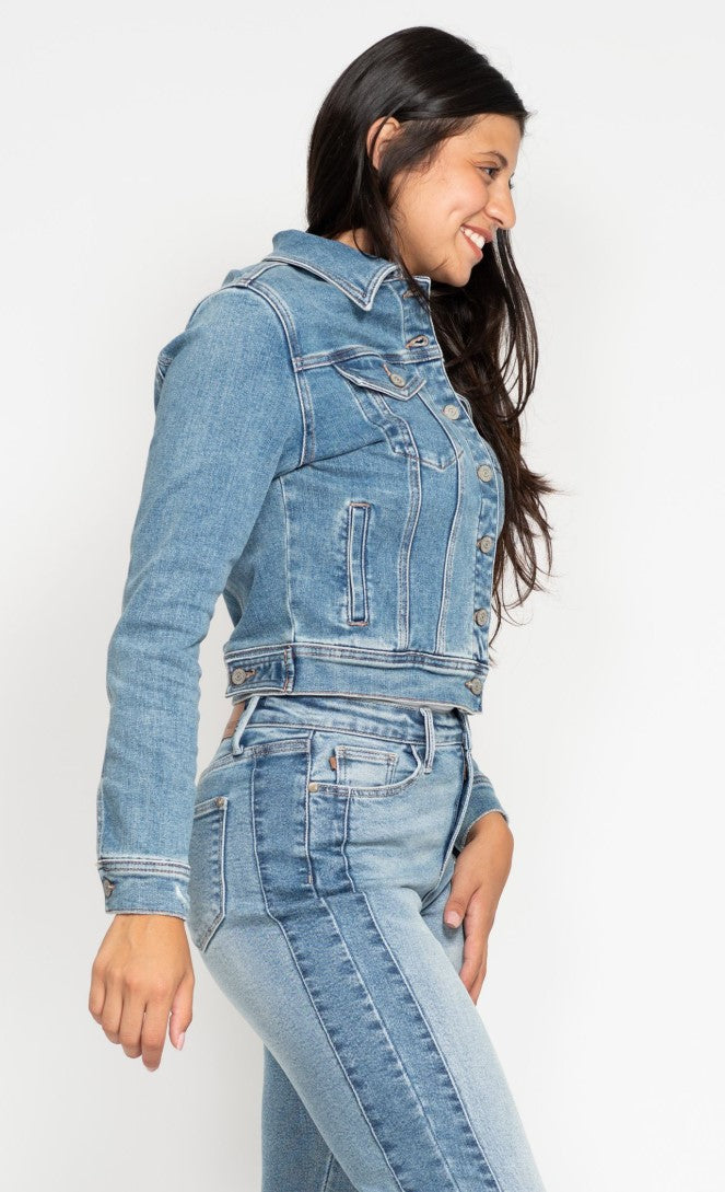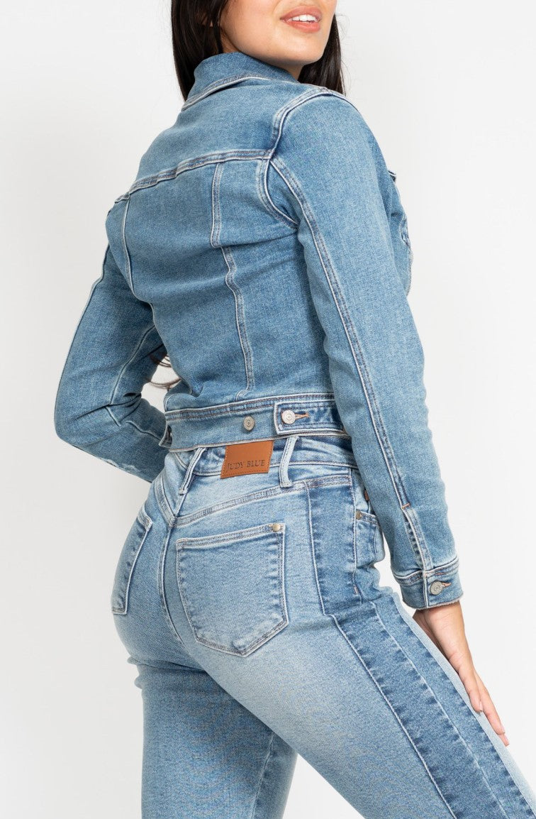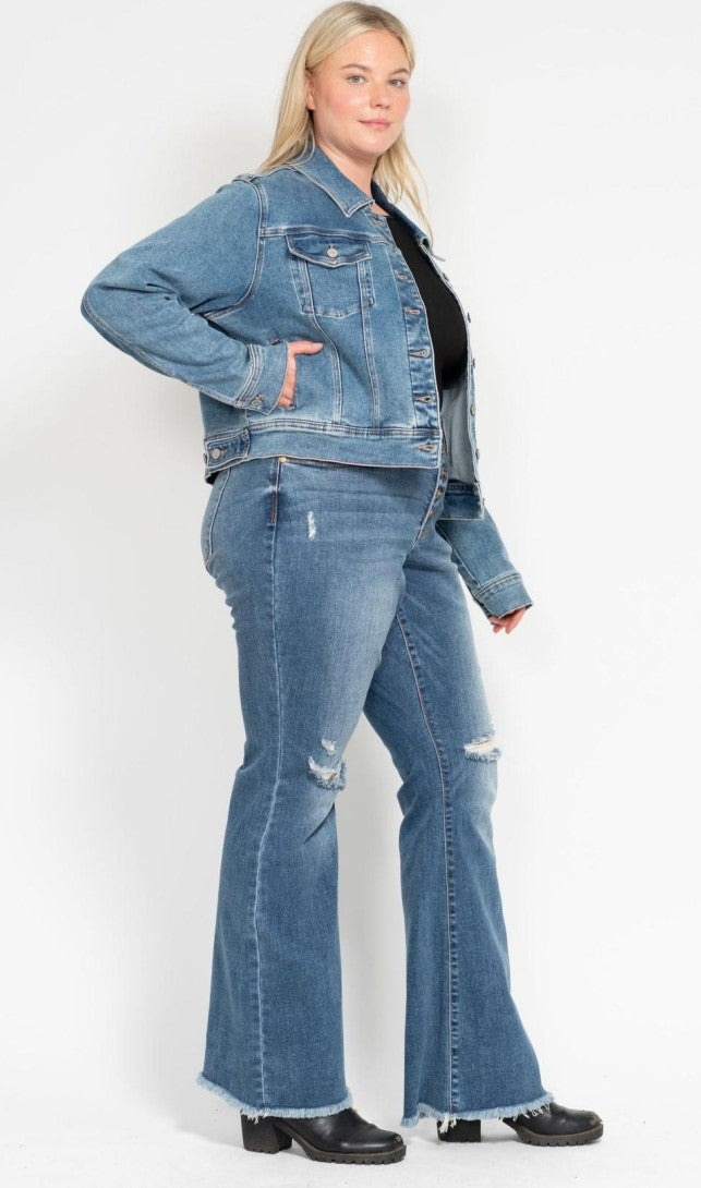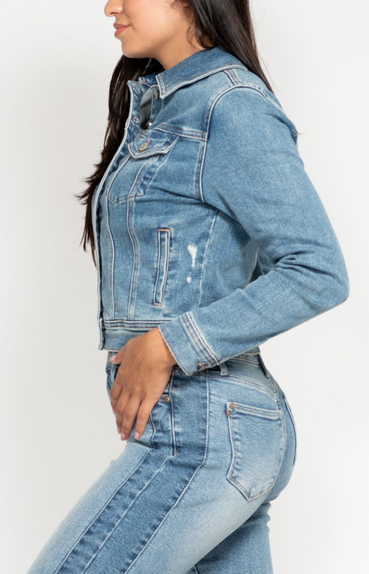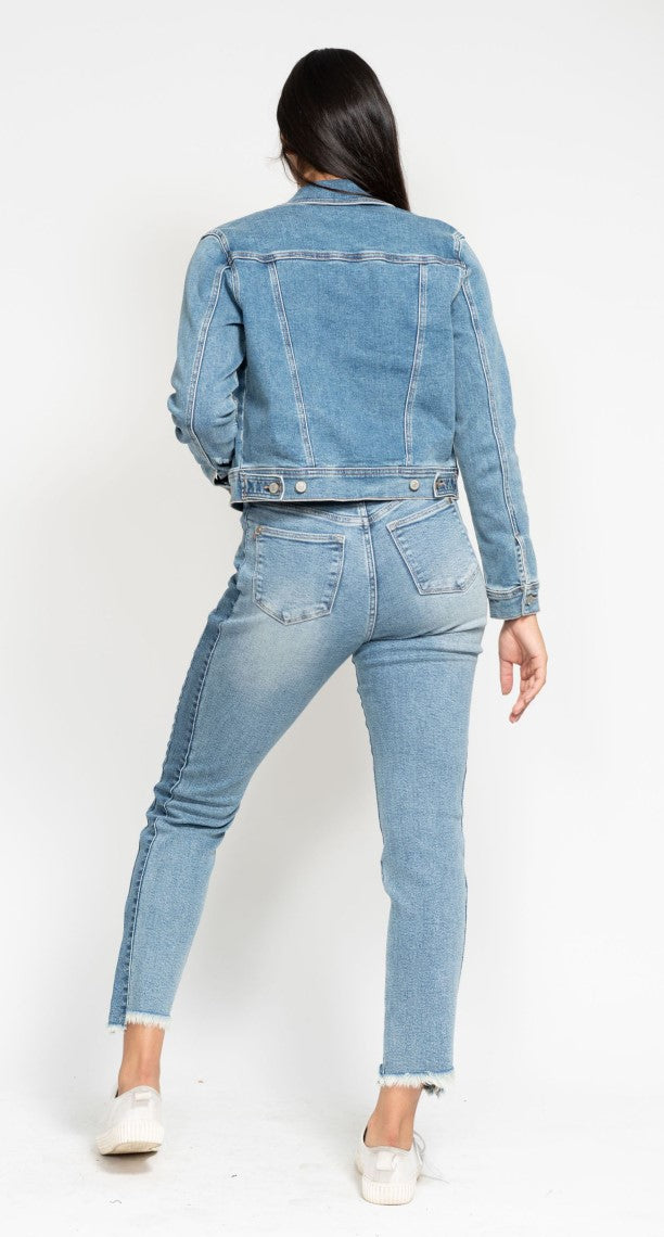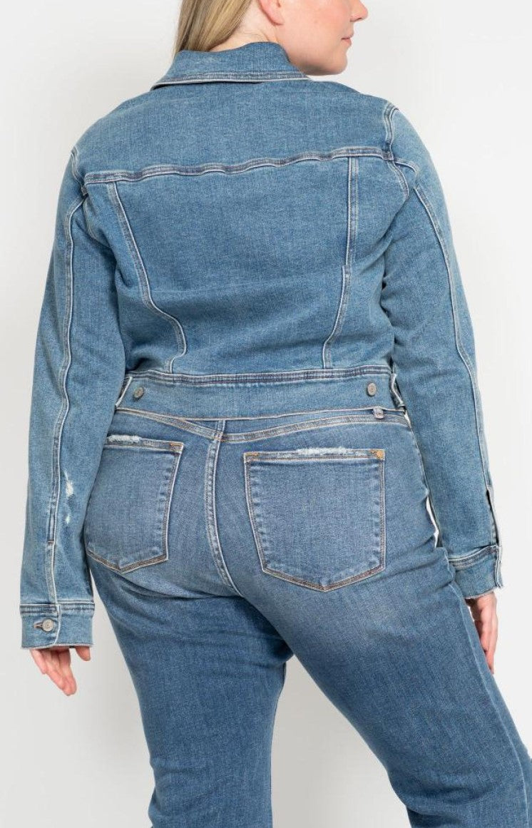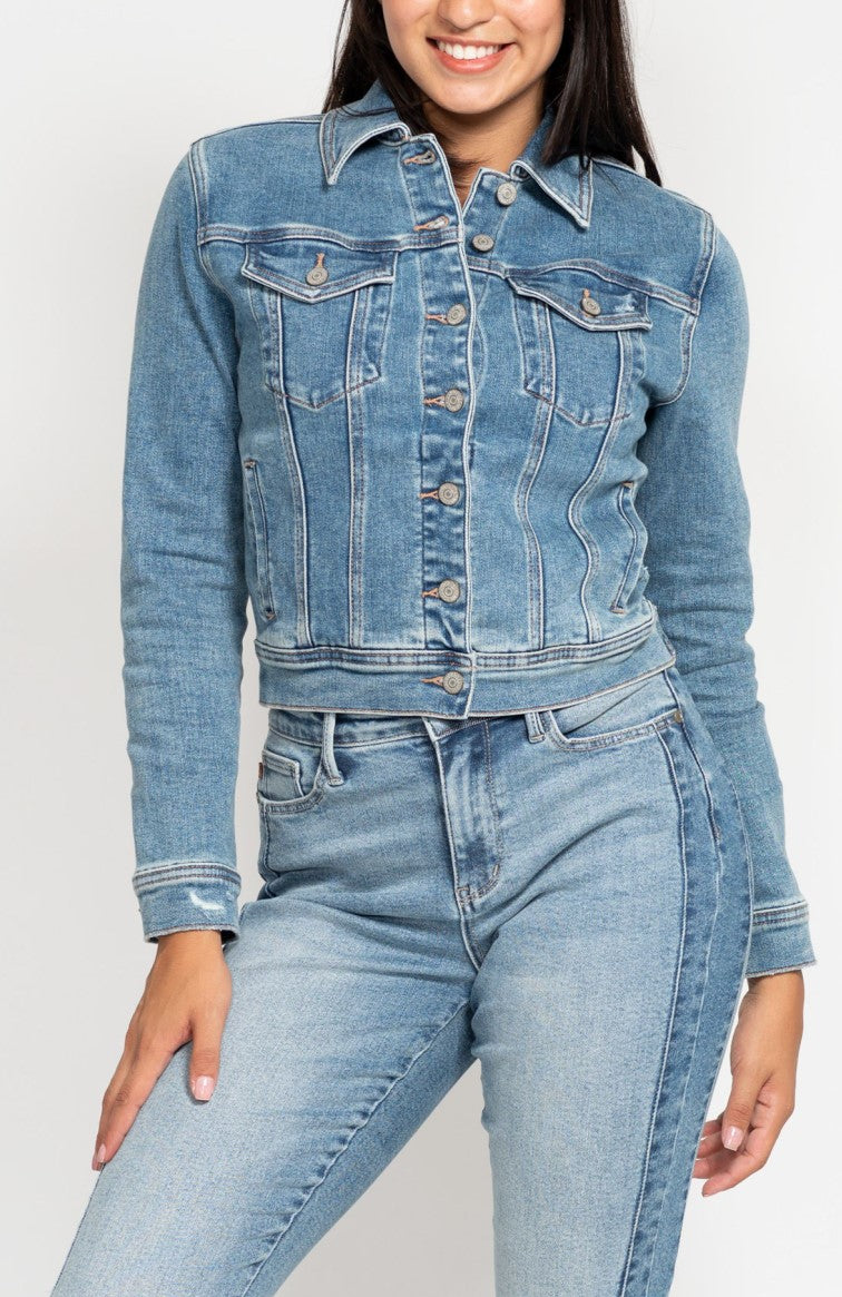 The NEW Judy Blue Classic Vintage Wash Denim Jacket is made with a blend of 76.2% cotton, 22.5% polyester, and 1.3% spandex, providing the stretchy comfortable fit that Judy Blue is FAMOUS for!