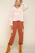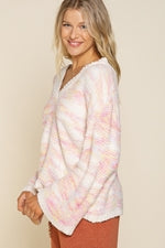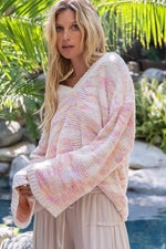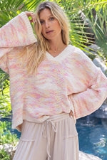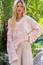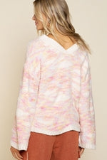 This sweater reminds us of strawberry swirl sorbet! Pink and ivory marbling adorn this sweater with ivory detail on the v-neck and bell sleeves.
