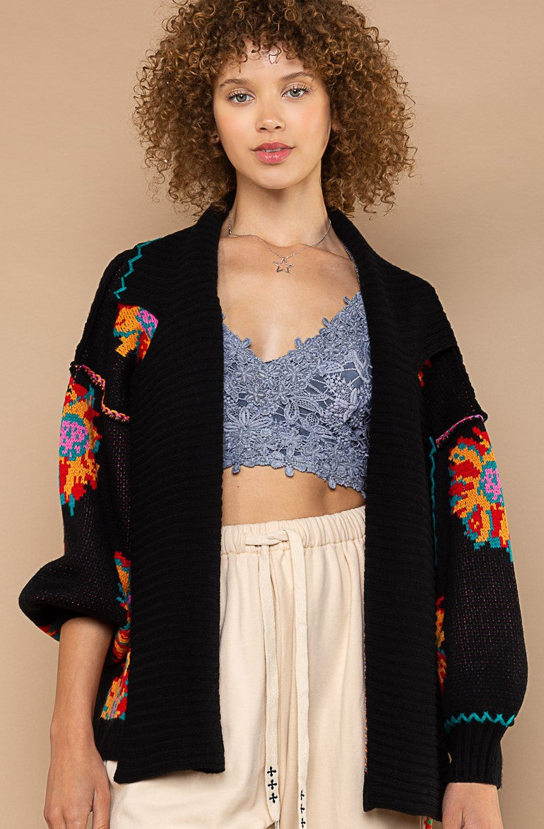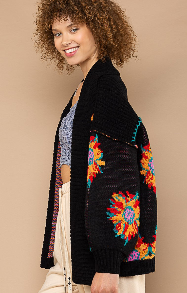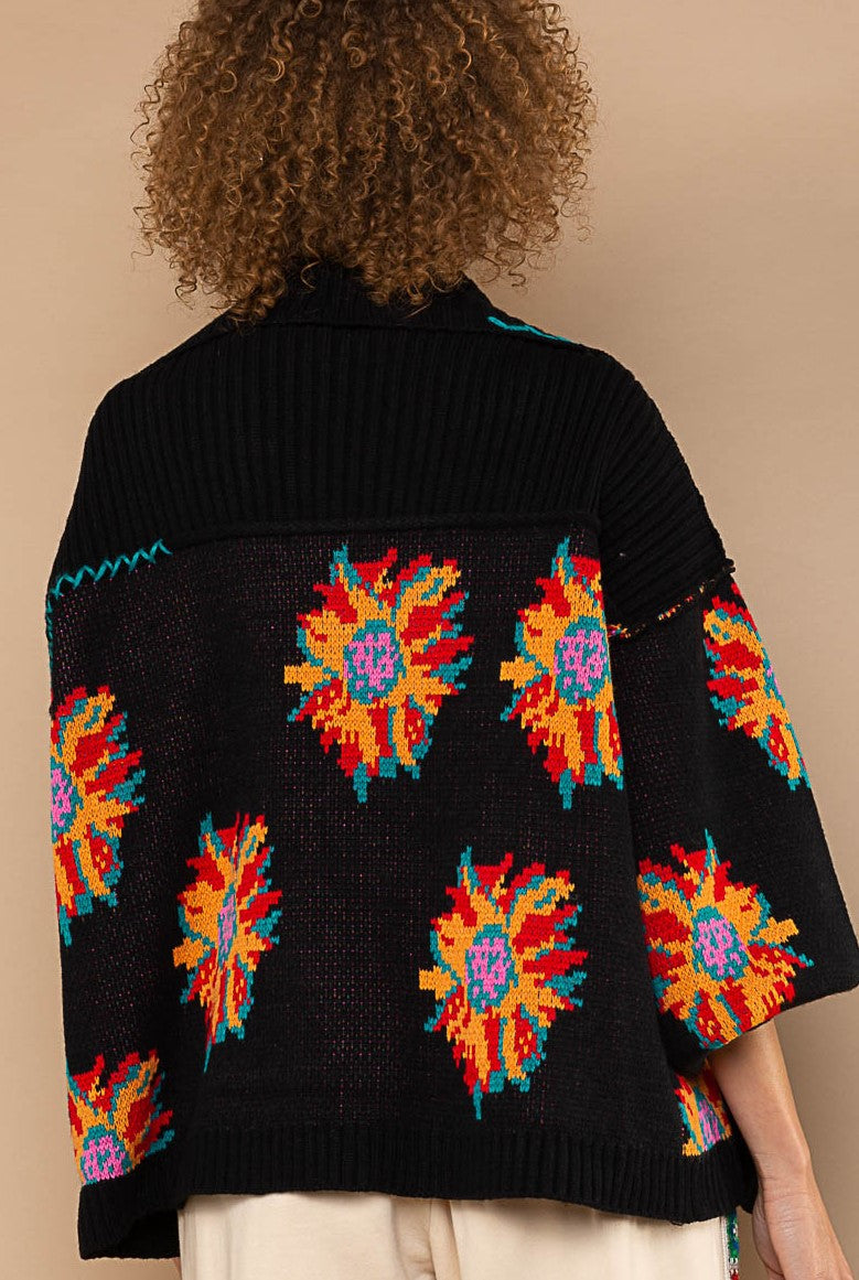 Designed in a oversized fit, long sleeves, sweater knit ribbing shawl collar, this POL sweater features a pixelated sunflower print details in turquoise, orange, red - with a pink/turquoise center on an black background.