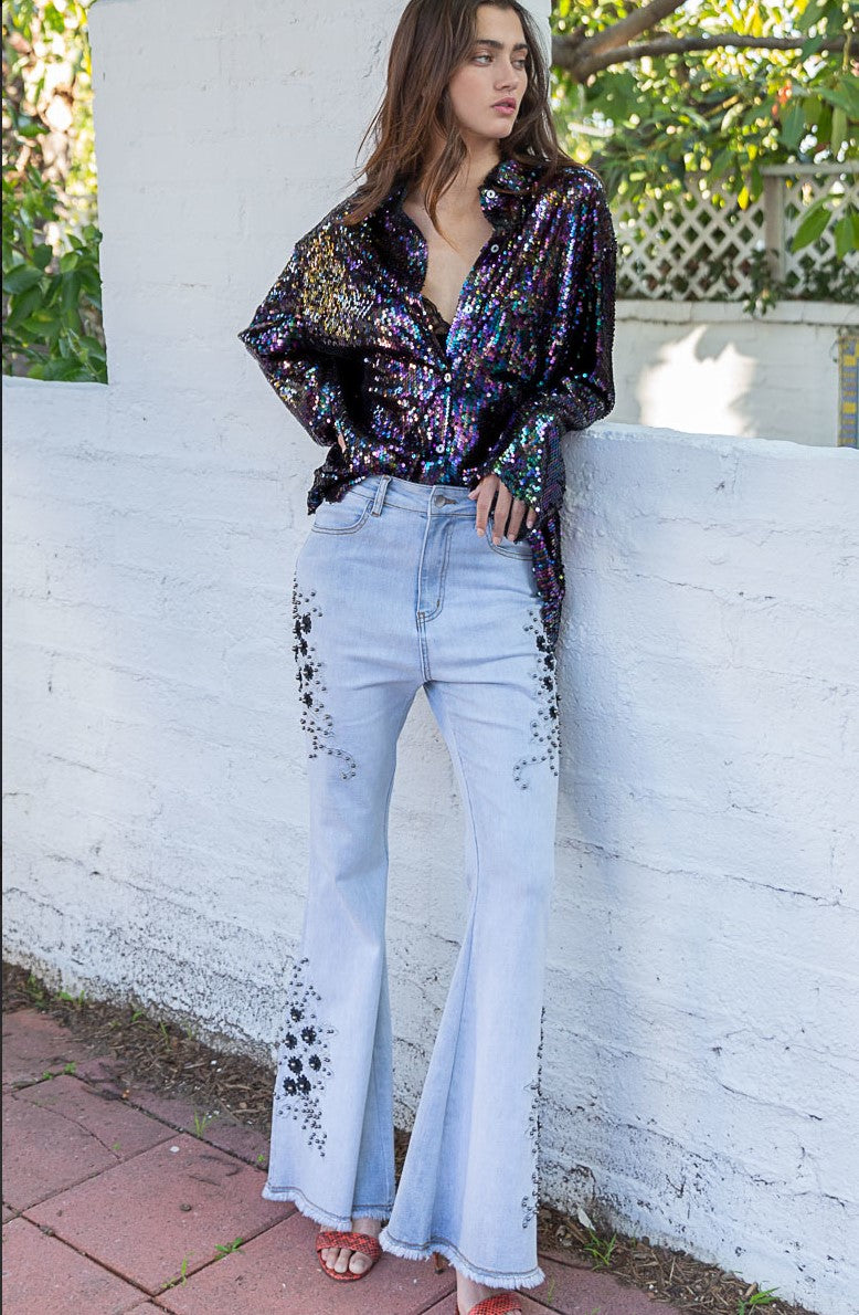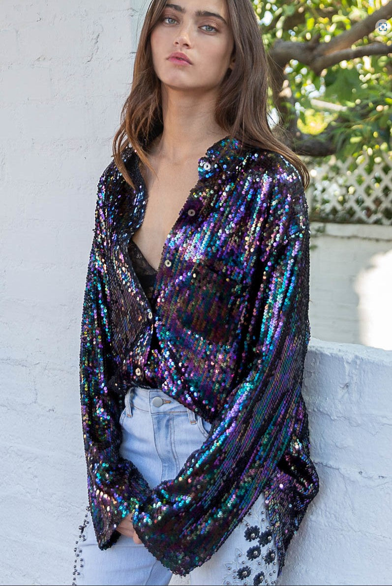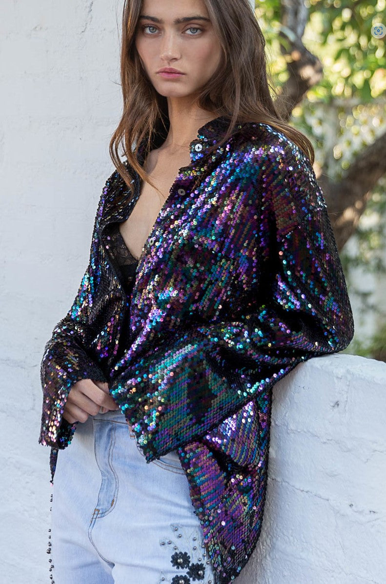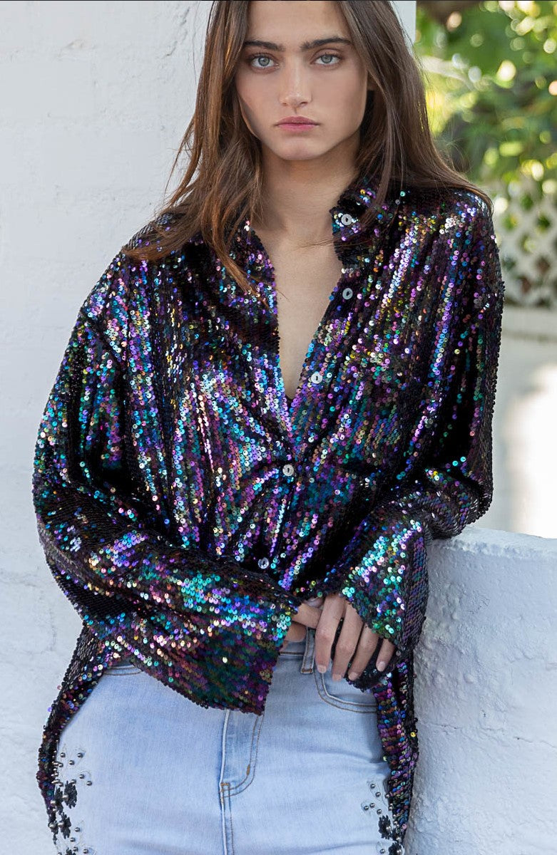 Designed in sparkling sequins, with a violet jewel tone spectrum, this top has an oversized fit with long sleeve, chest pocket, back yoke detailing. We love the iridescent glow of this shirt - and how the light dances off of the sequins during the day and night!