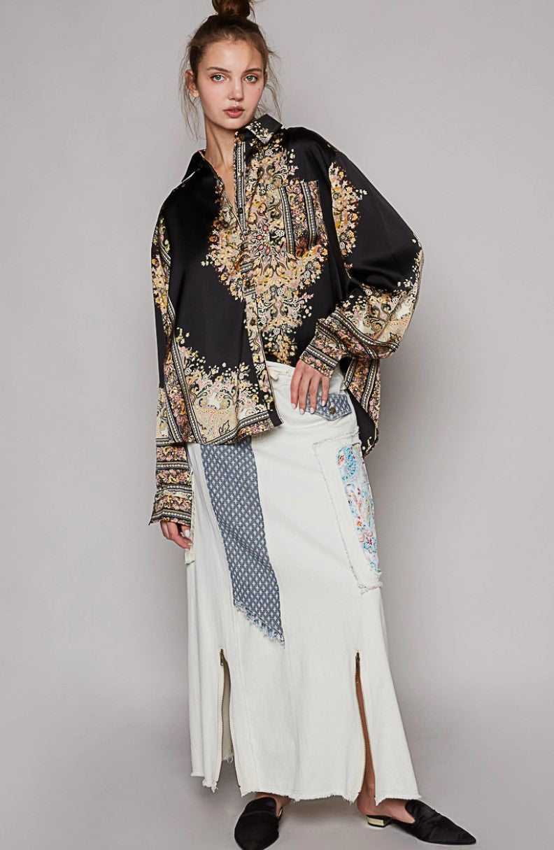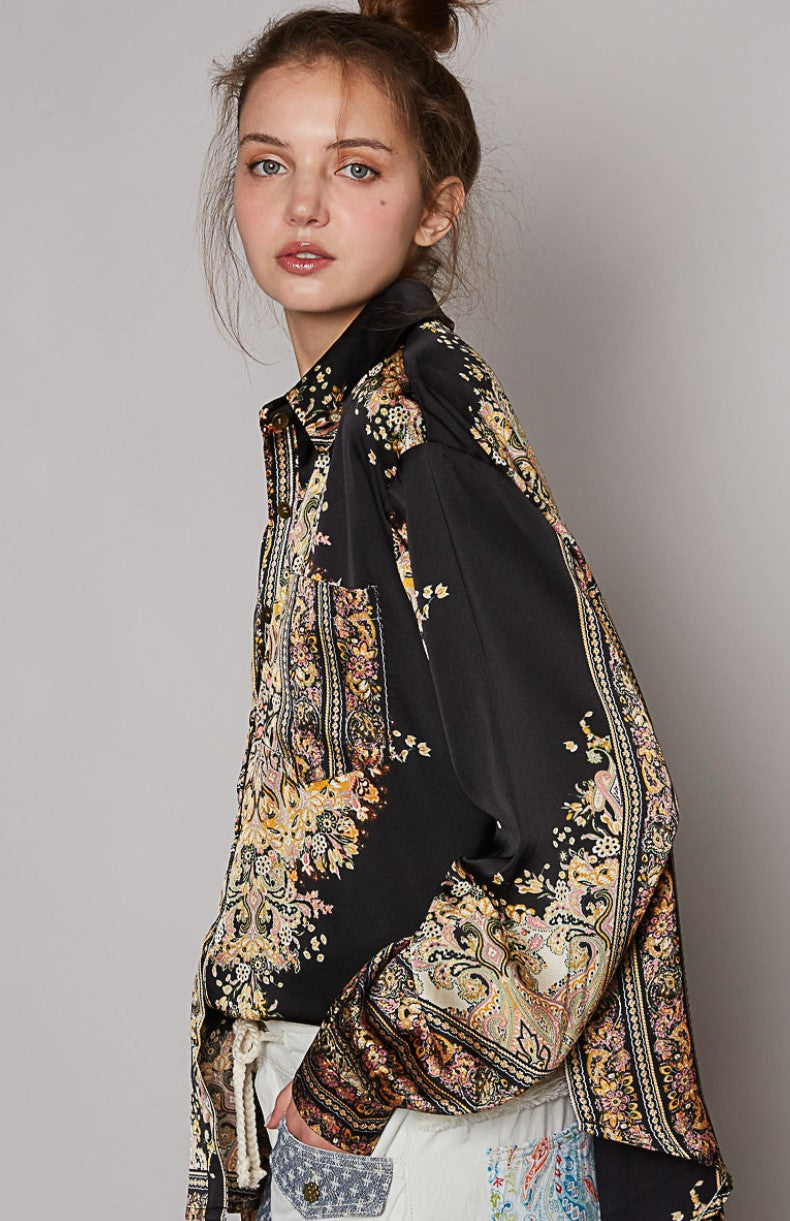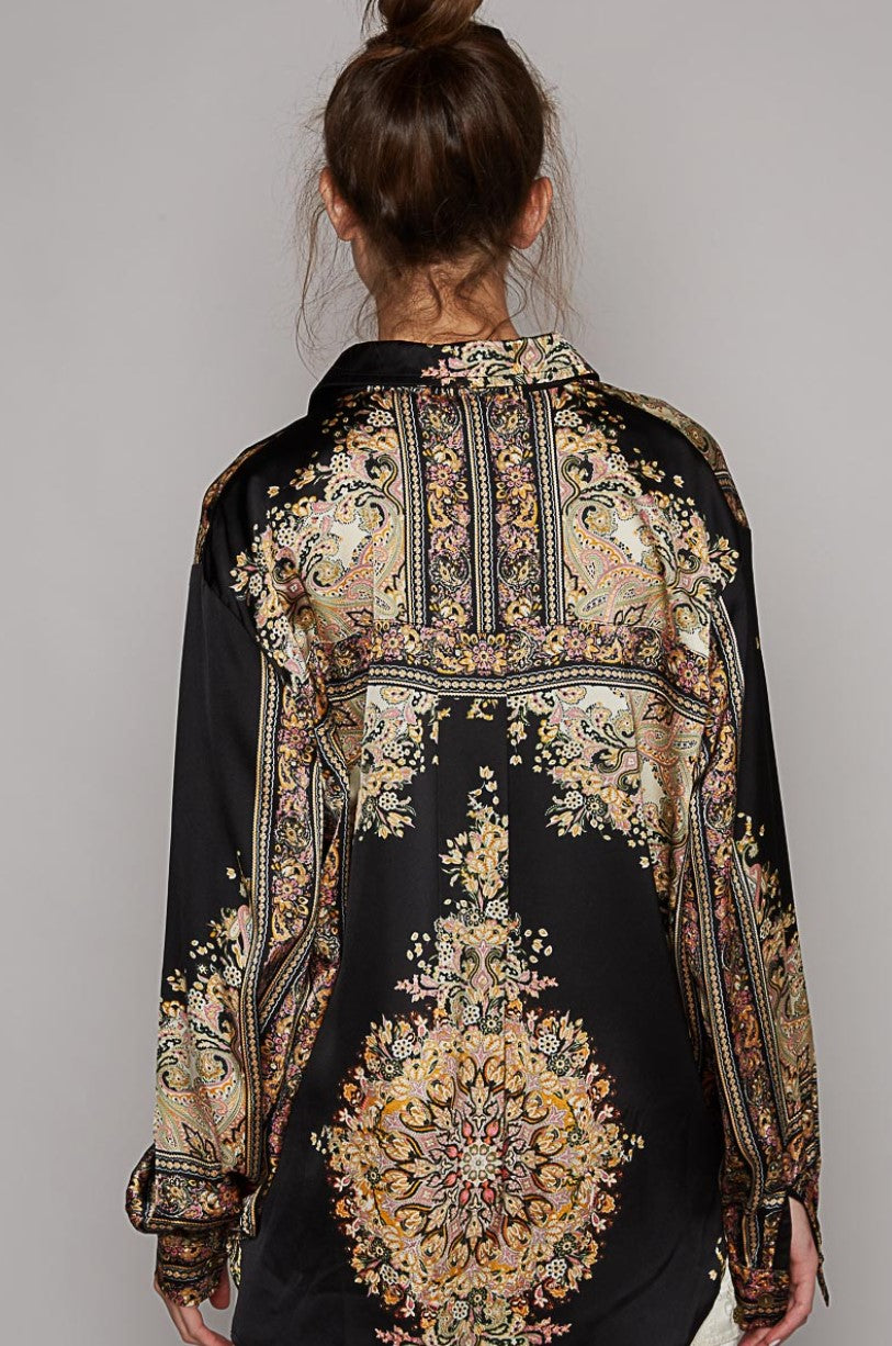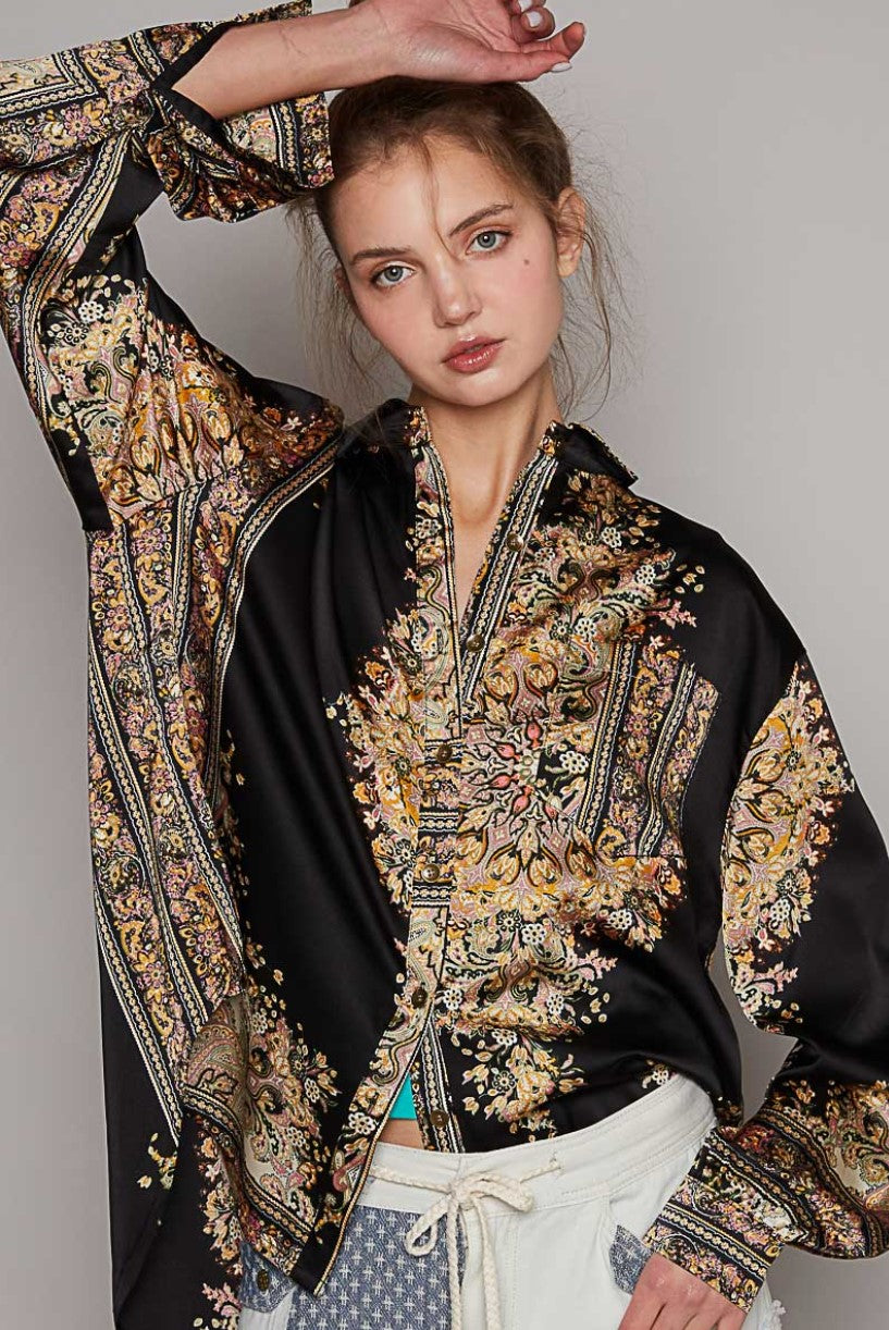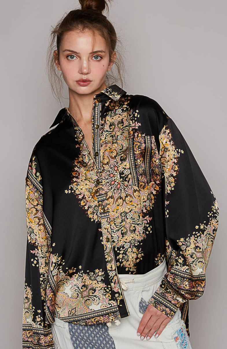 NEW ~ POL Satin Baroque Print Long Sleeved Relaxed Fit Shirt ~ BLACK!