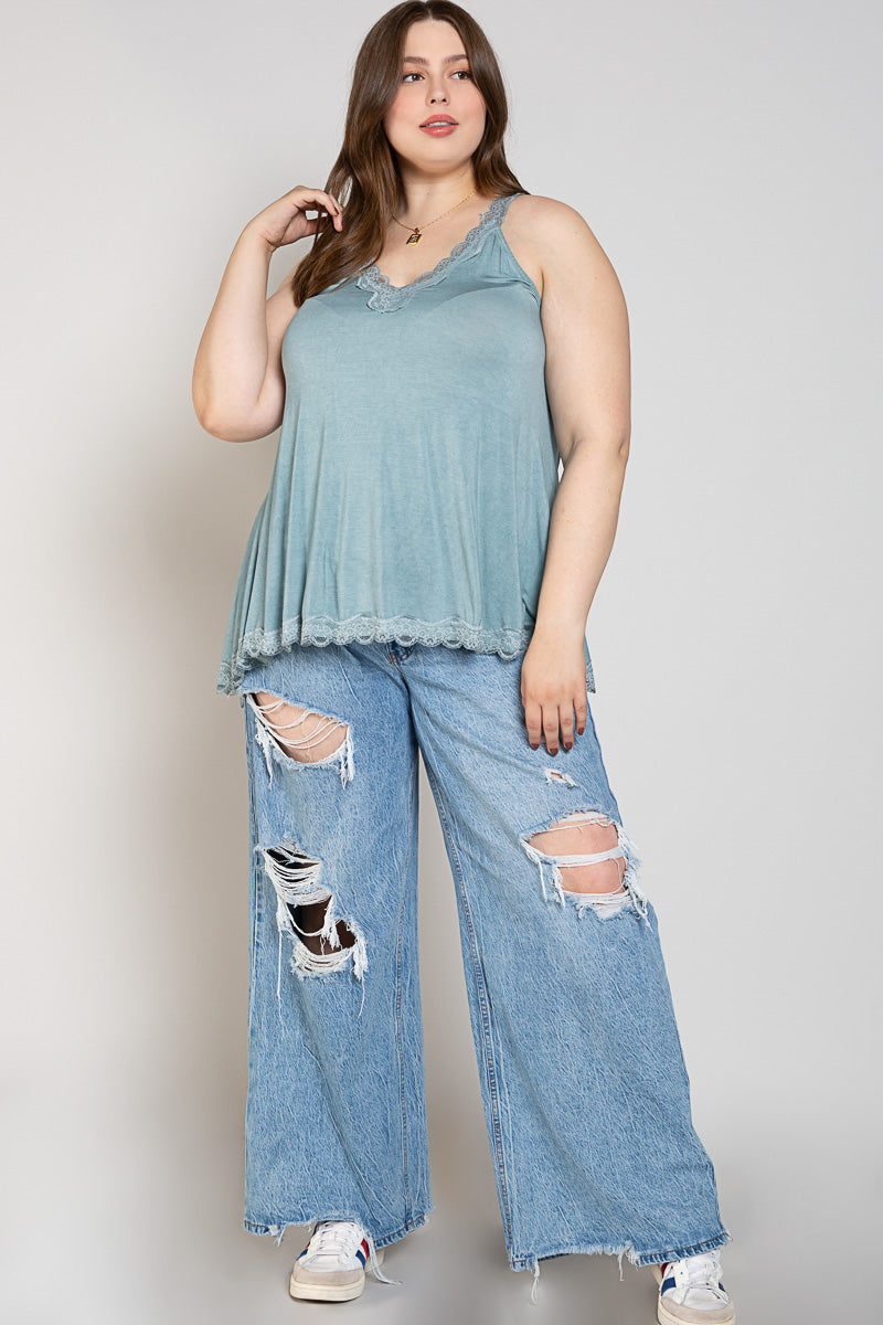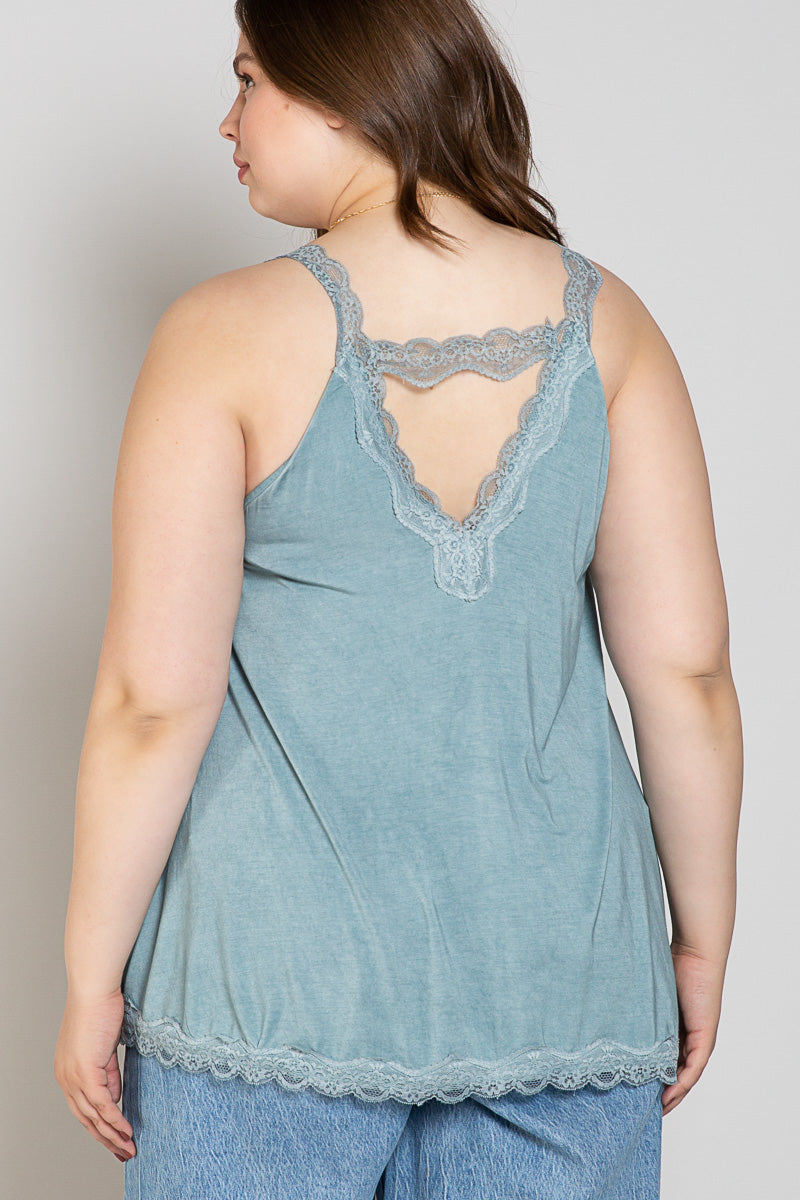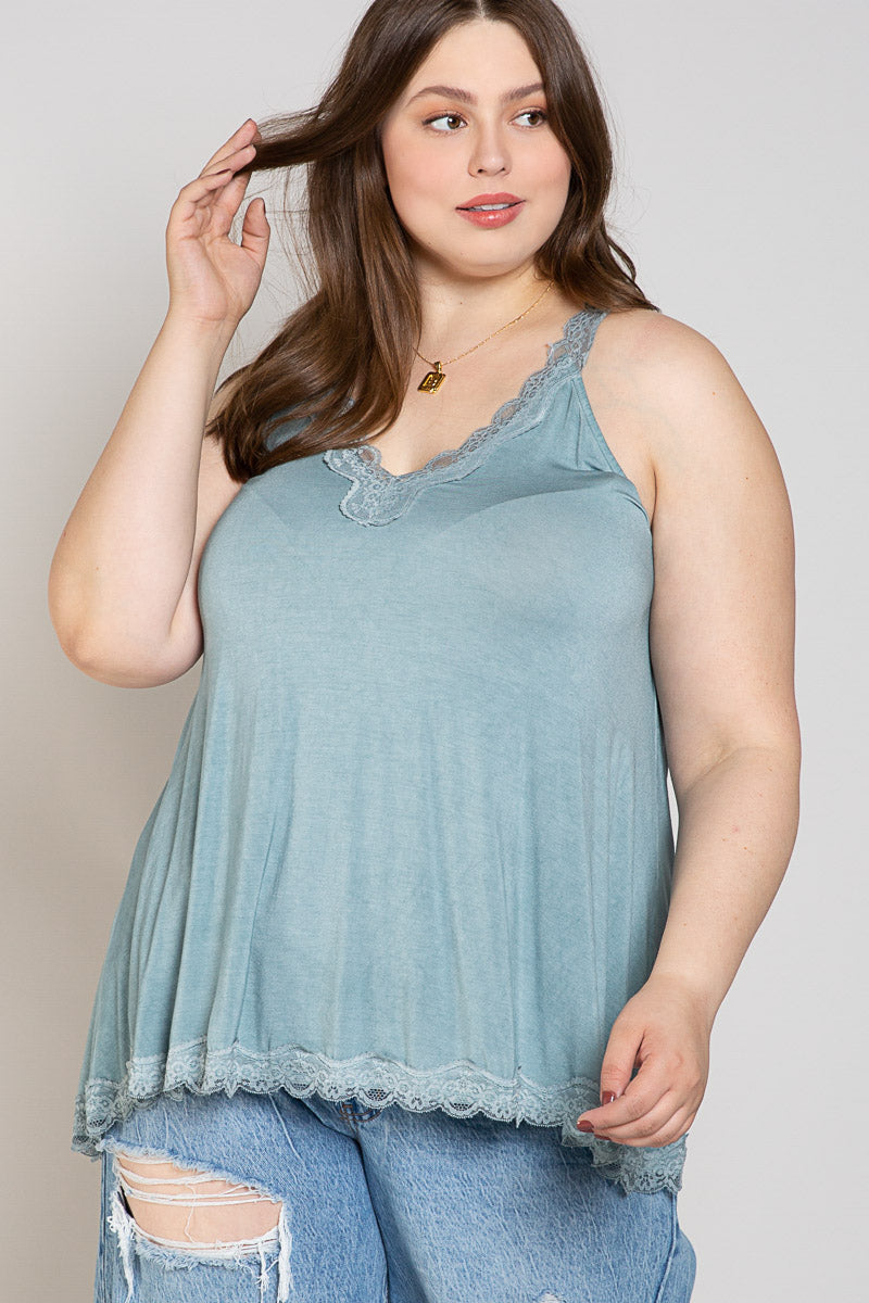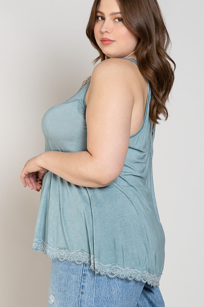 POL Curvy Blue Sage Lace Trim Halter Top