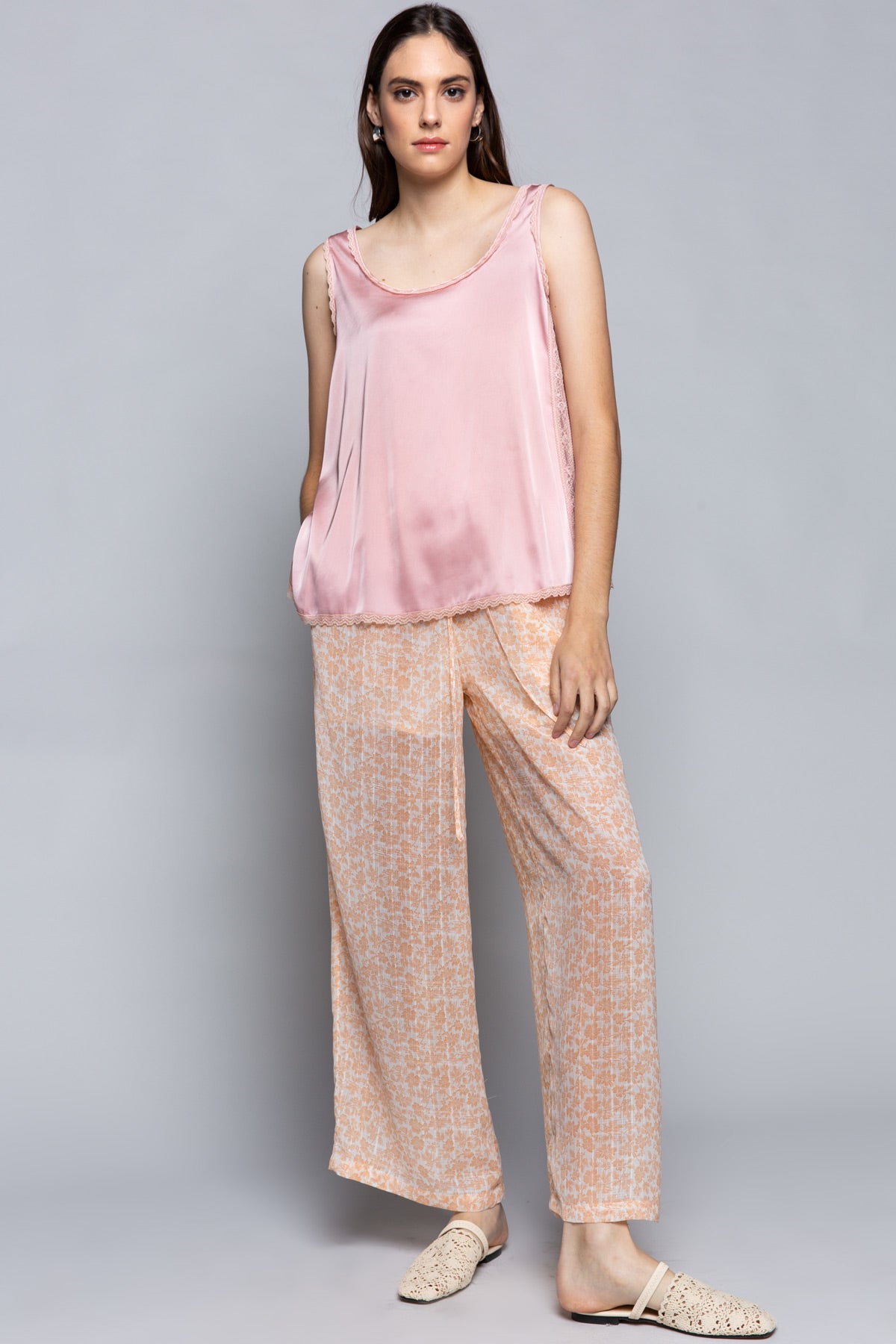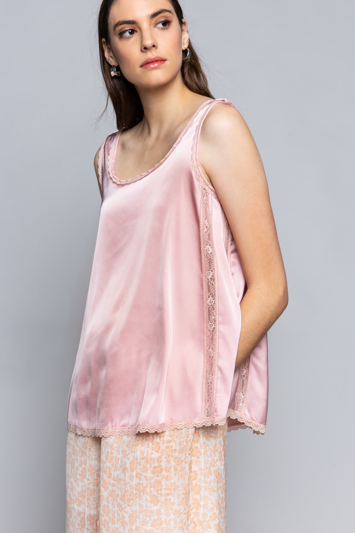 We have the perfect satin sleeveless top for you! This beautiful POL satin pink top is made with 100% polyester, and features delicate lace details on the side and seams.