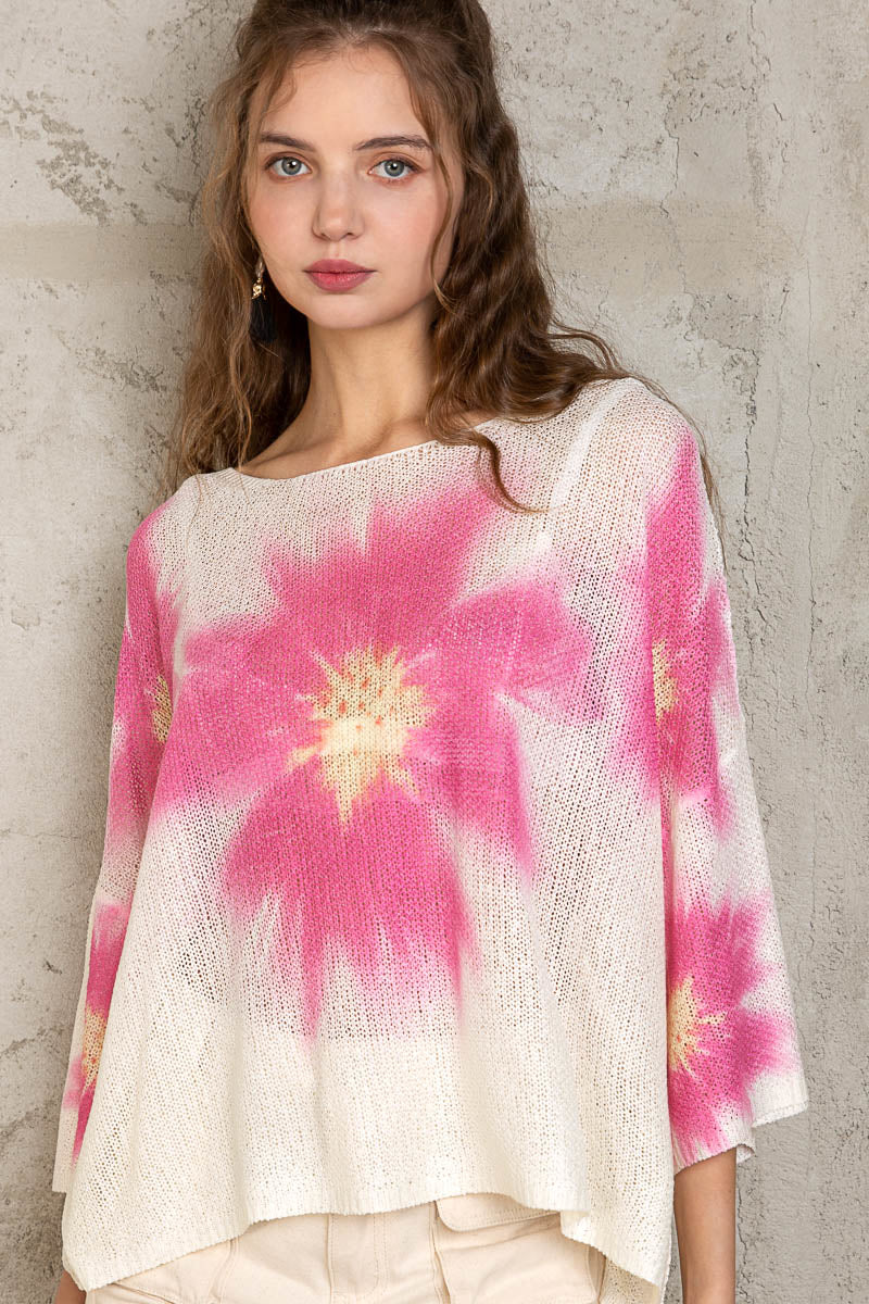 Soft, breathable, loose weave with a boxy fit with ombre pink flowers with yellow centers has flowy 3/4 sleeves. Wear a bralette or tank top underneath due to the loose weave.