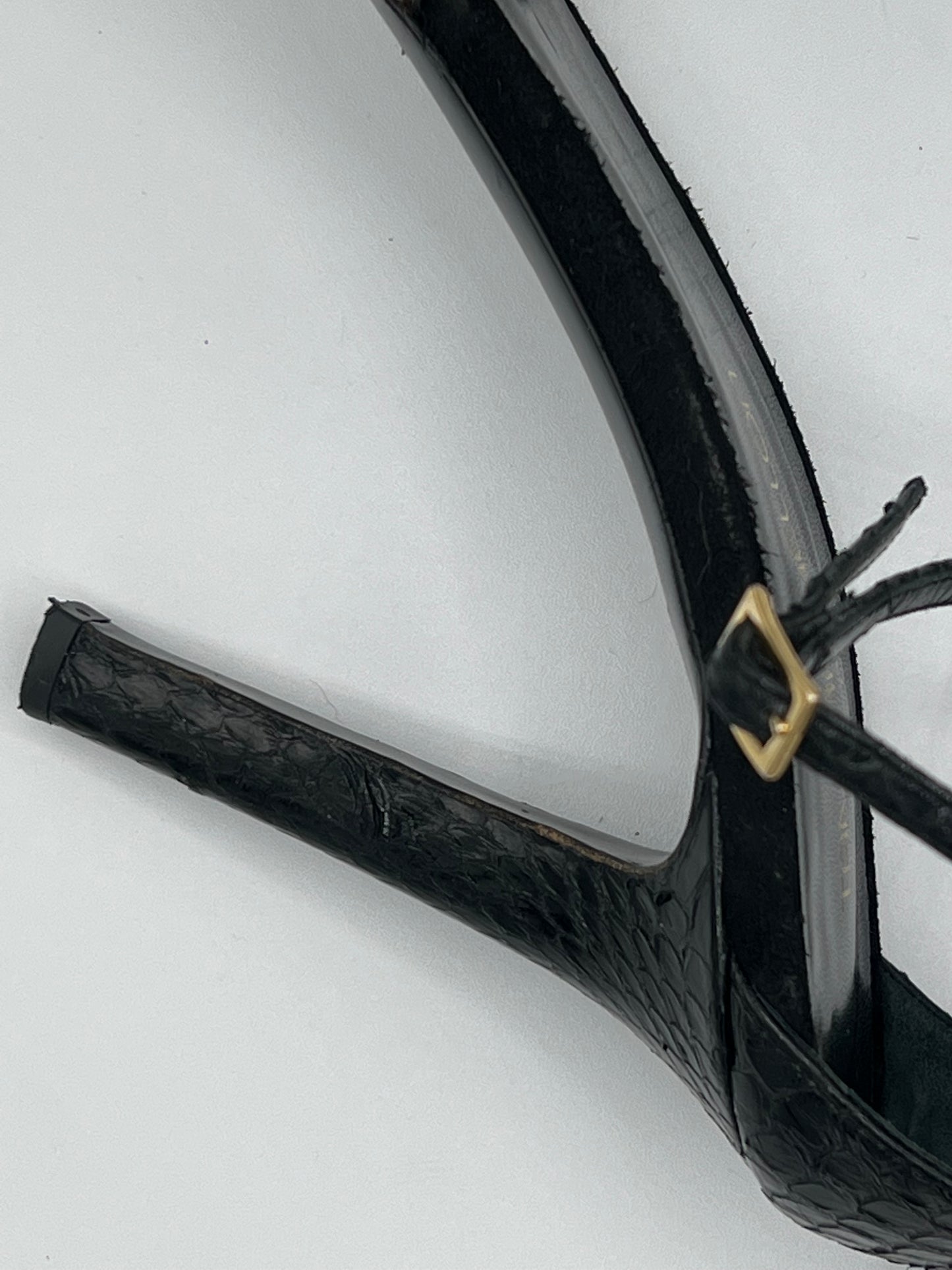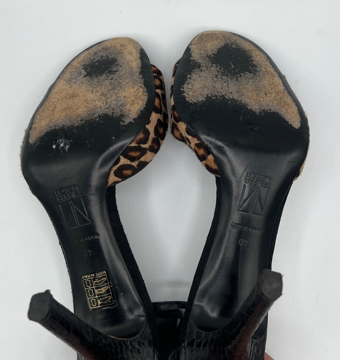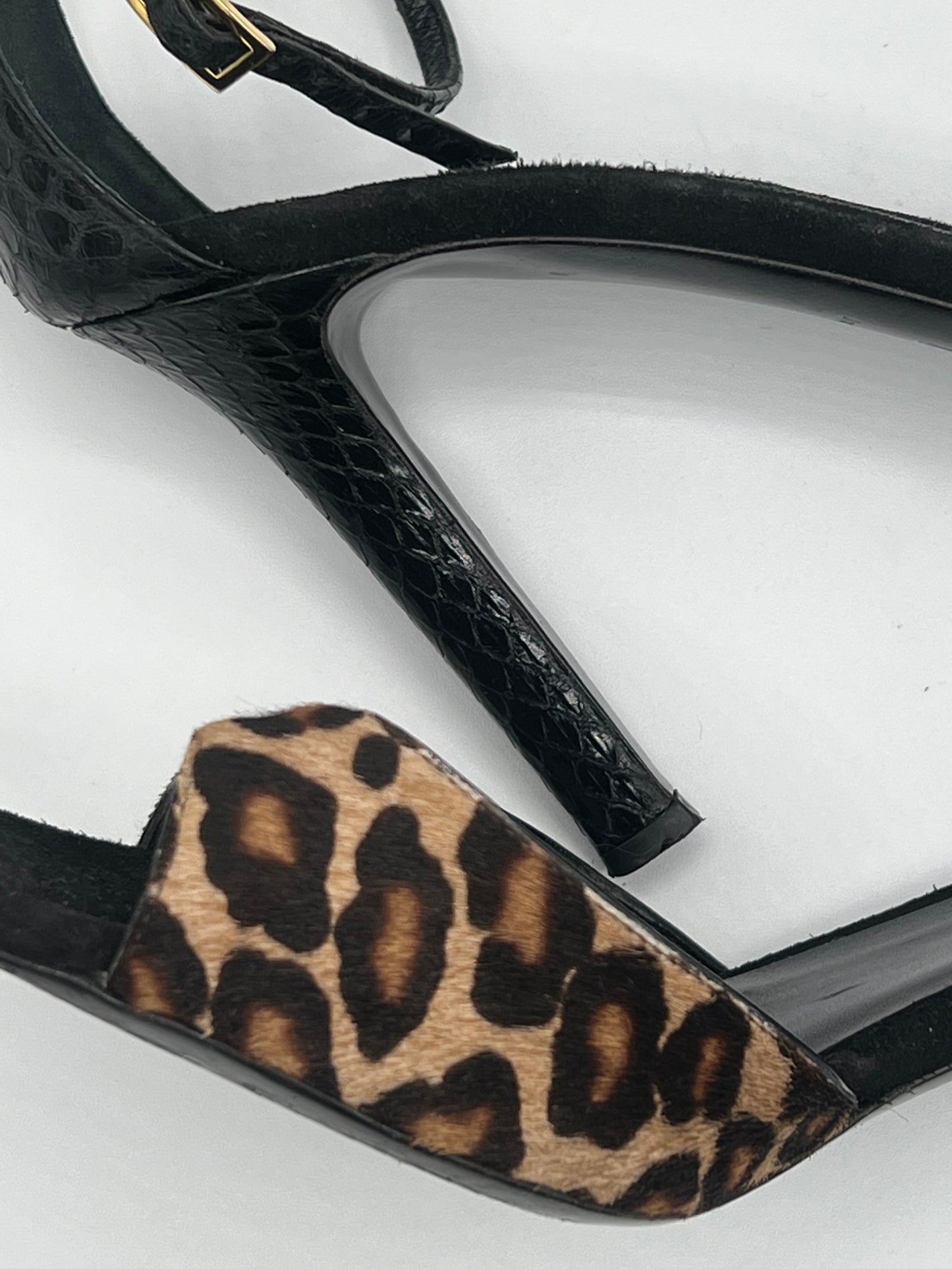 Black snakeskin embossed leather Tamara Mellon Wild Night sandals with leopard print ponyhair trim at vamps, covered heels and gold-tone buckle closure at ankles.