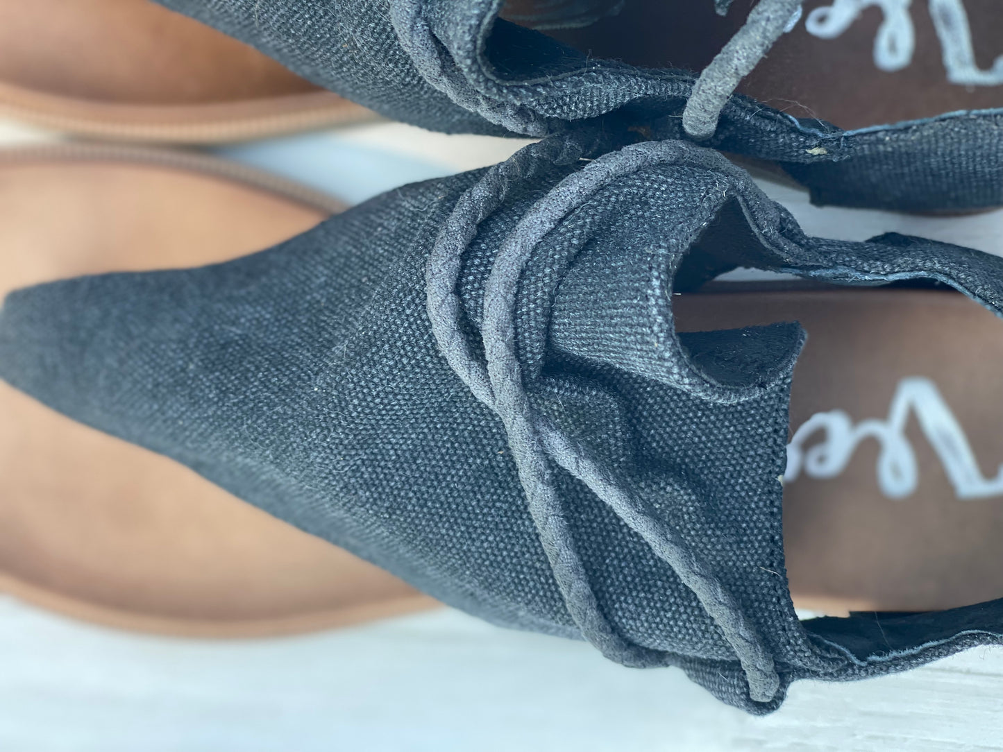 Charcoal fabric with braided rope detail on the front. Zip back.