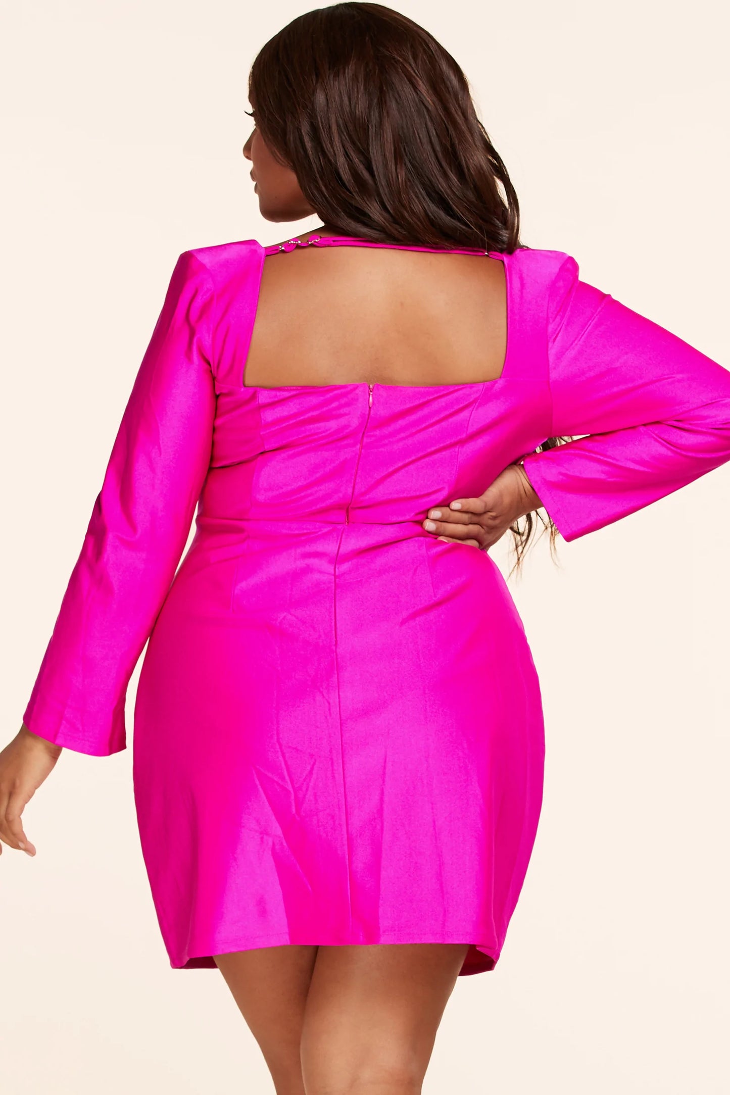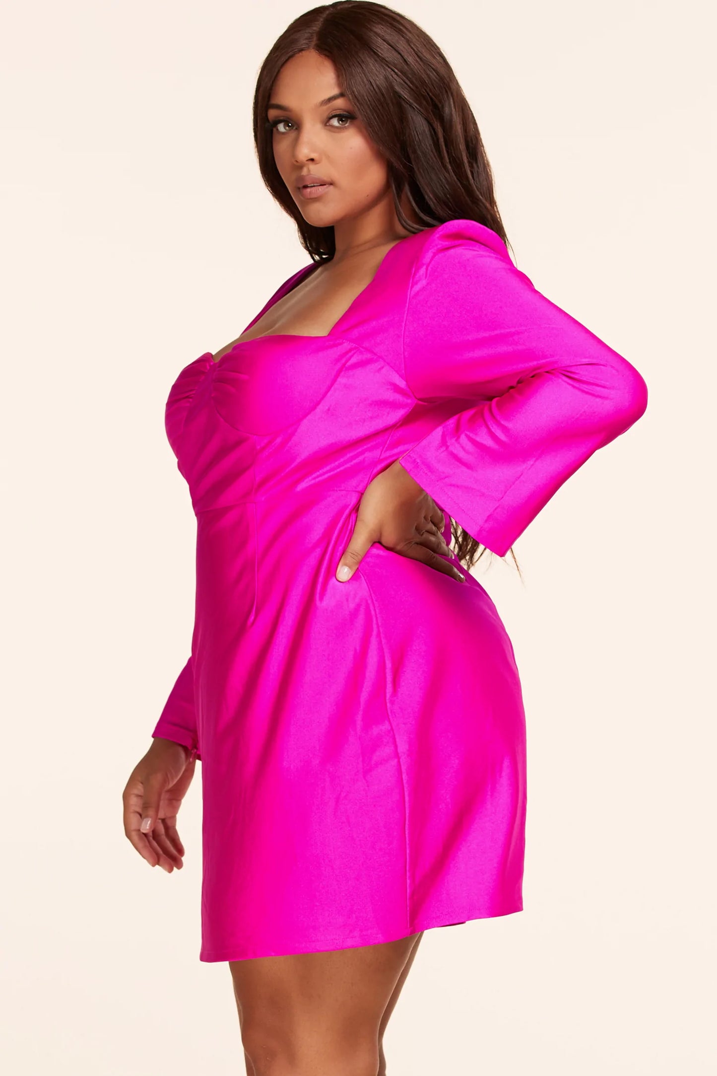 Neon fuchsia midi dress features a sweetheart neckline, sleek long sleeves, and a bodycon fit with a sexy open back. This is the perfect sizzling dress for a night out!