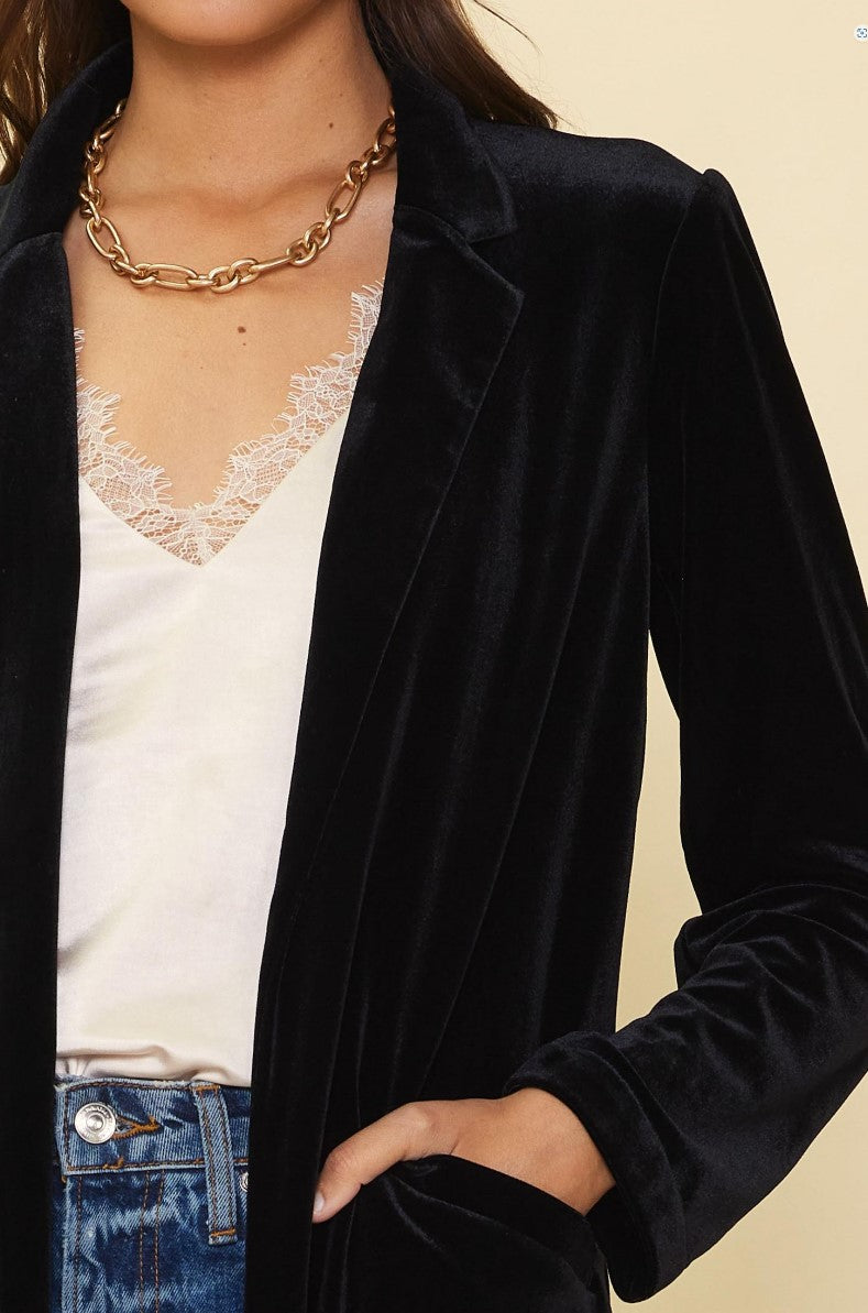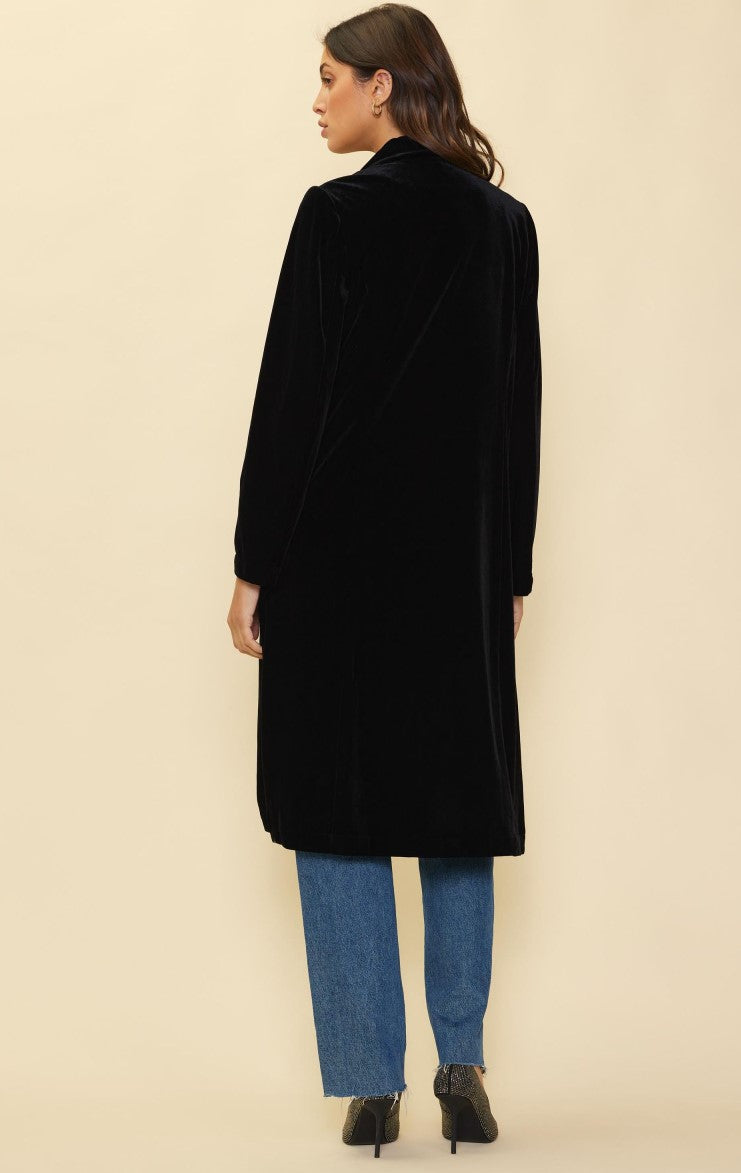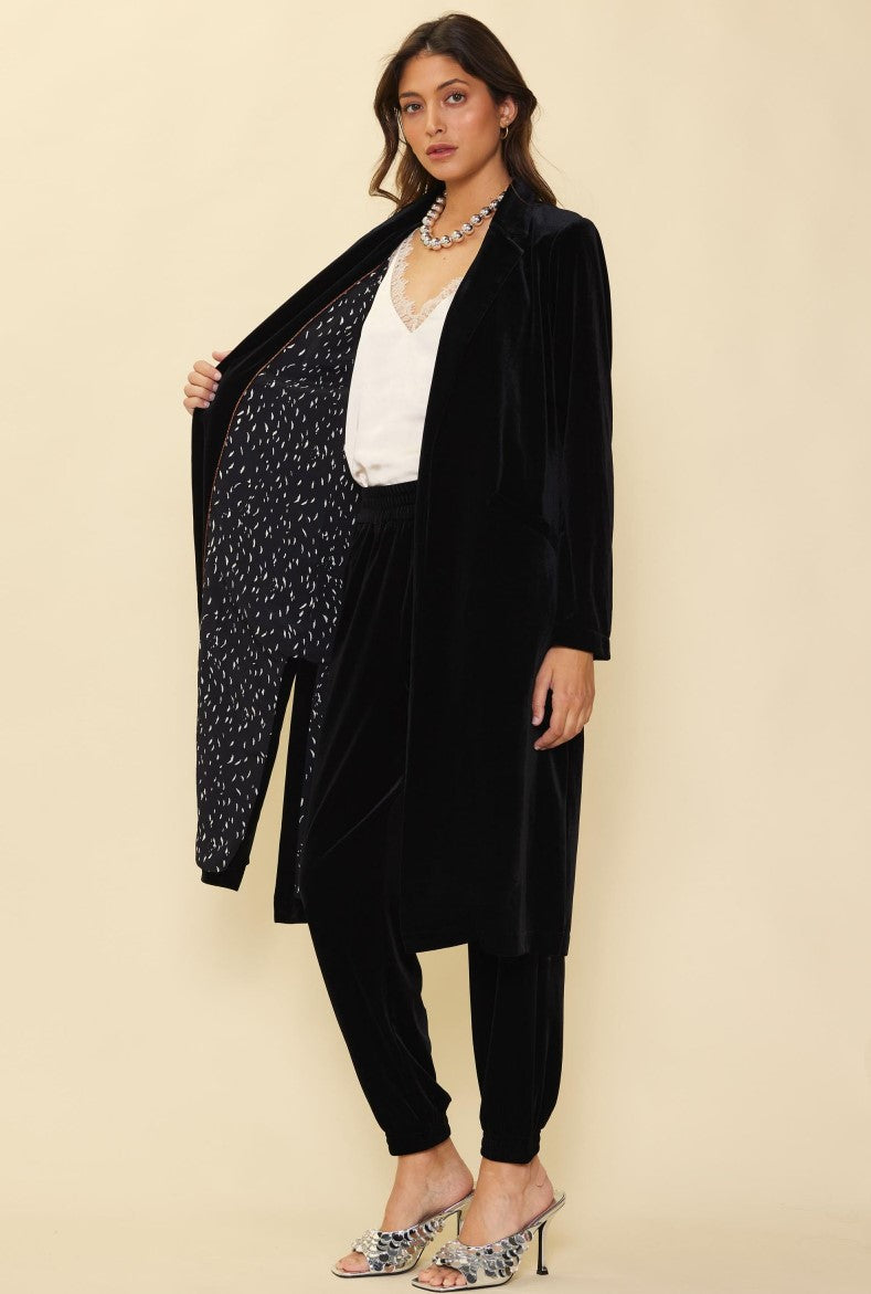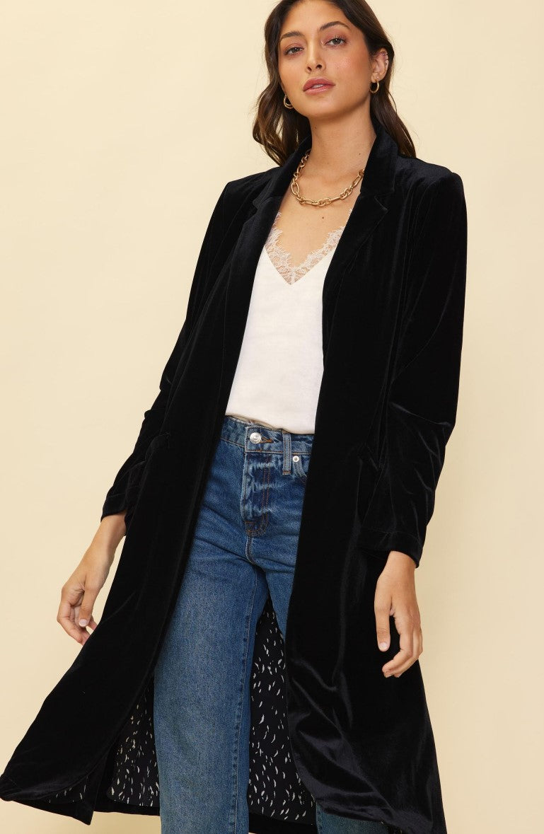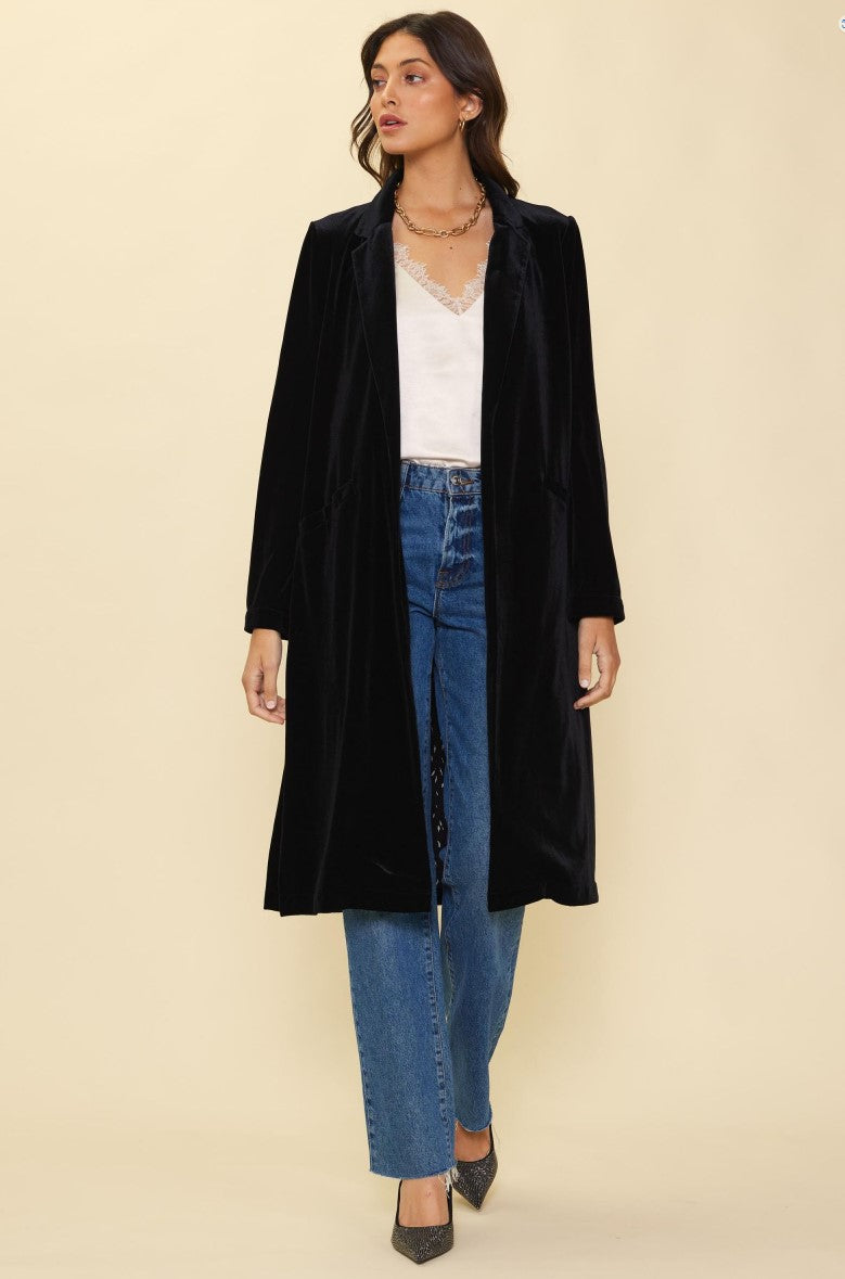 Skies are Blue ~ Plush Velvet Duster Coat in BLACK! This duster can be dressed up with a skirt, dress pants or down with your favorite denim (our pick would be Judy Blue!).