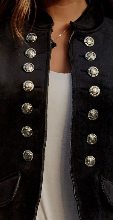 We've got the perfect jacket for you - the Venti6 Sgt Pepper jacket in black velvet! We love Venti6 Sgt Pepper Jacket collection - this velvet edition is unique and looks amazing with jeans or skirt! Button detail in silver.