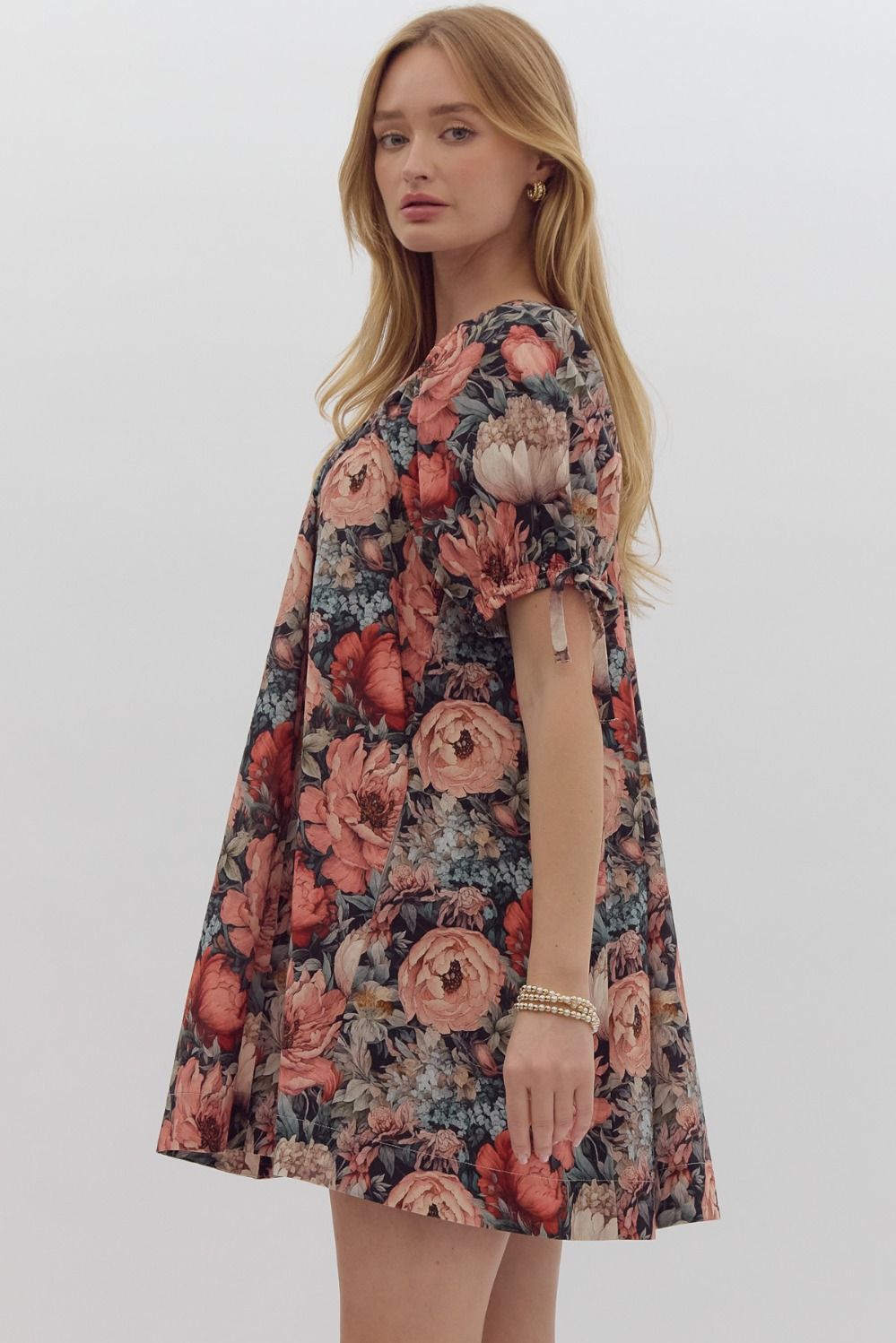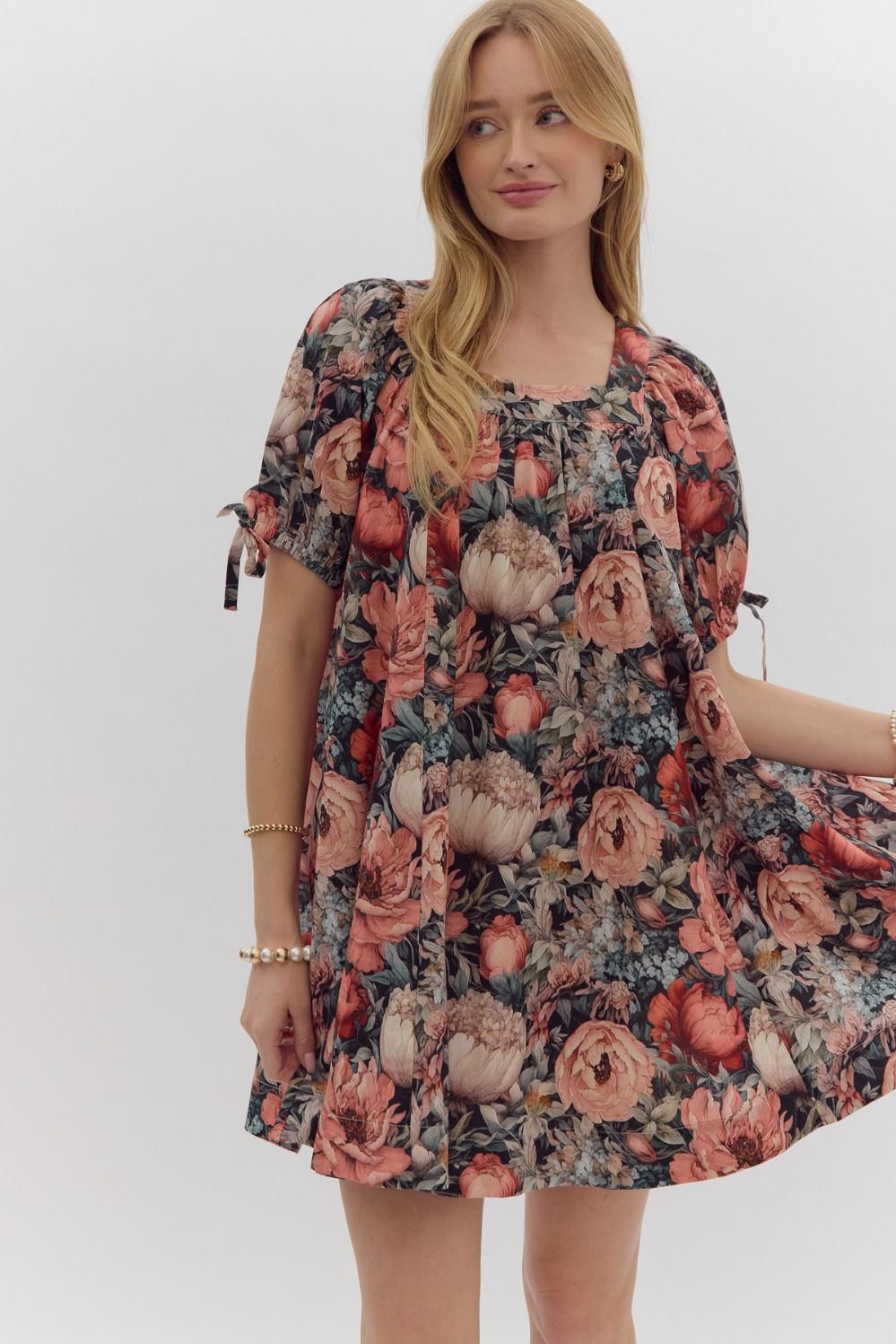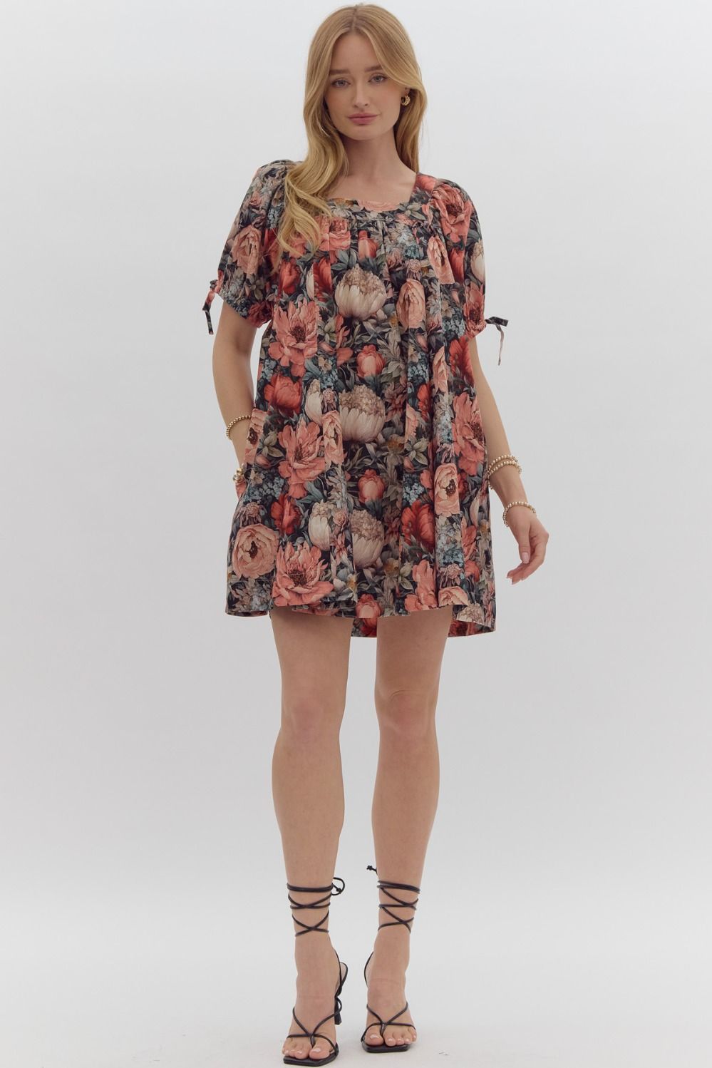 Introducing the ENTRO Black Floral Dress! We love the gray/black background with various shades of peach and orange flowers. Absolutely STUNNING!