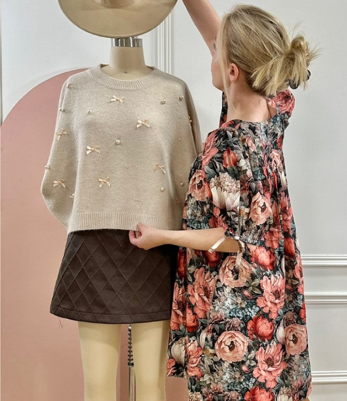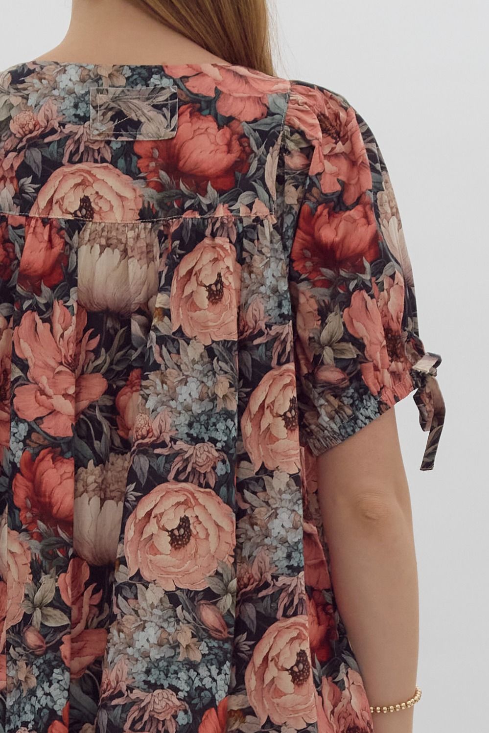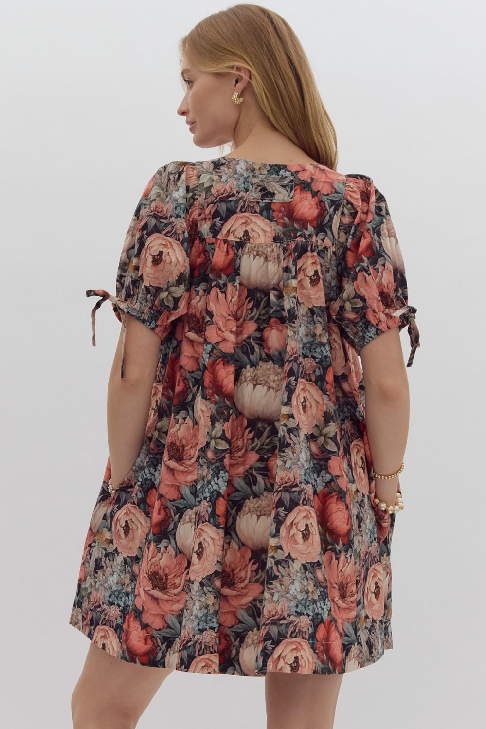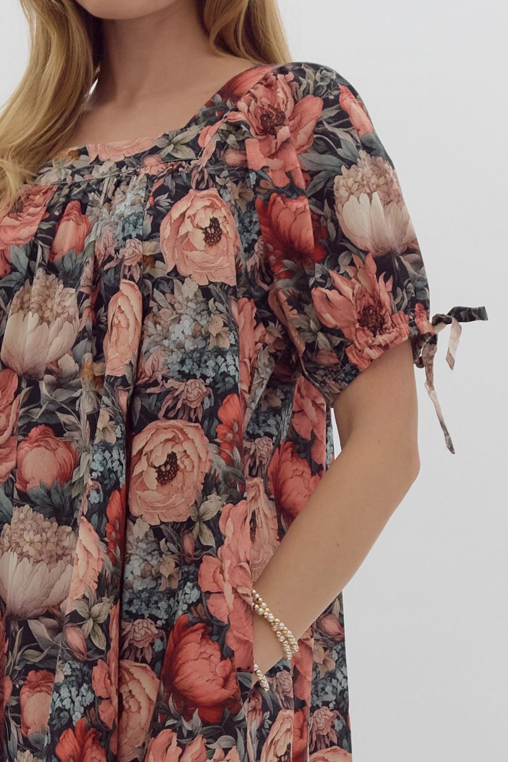 Introducing the ENTRO Black Floral Dress! We love the gray/black background with various shades of peach and orange flowers. Absolutely STUNNING!