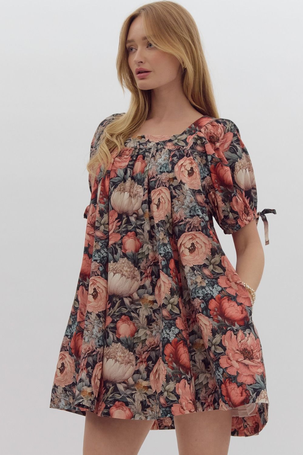 This dress showcases delicate short sleeves, a square neck, and falls above the knee in a mini style. It also includes adjustable self-tie details at the cuffs and convenient side pockets. Lined and woven with a non-sheer but lightweight material, this dress is the perfect addition to your wardrobe! We LOVE the quality of the workmanship, color and style of this dress. Pair with strappy sandals in the warmer months and tights with booties or boots in the cooler months!