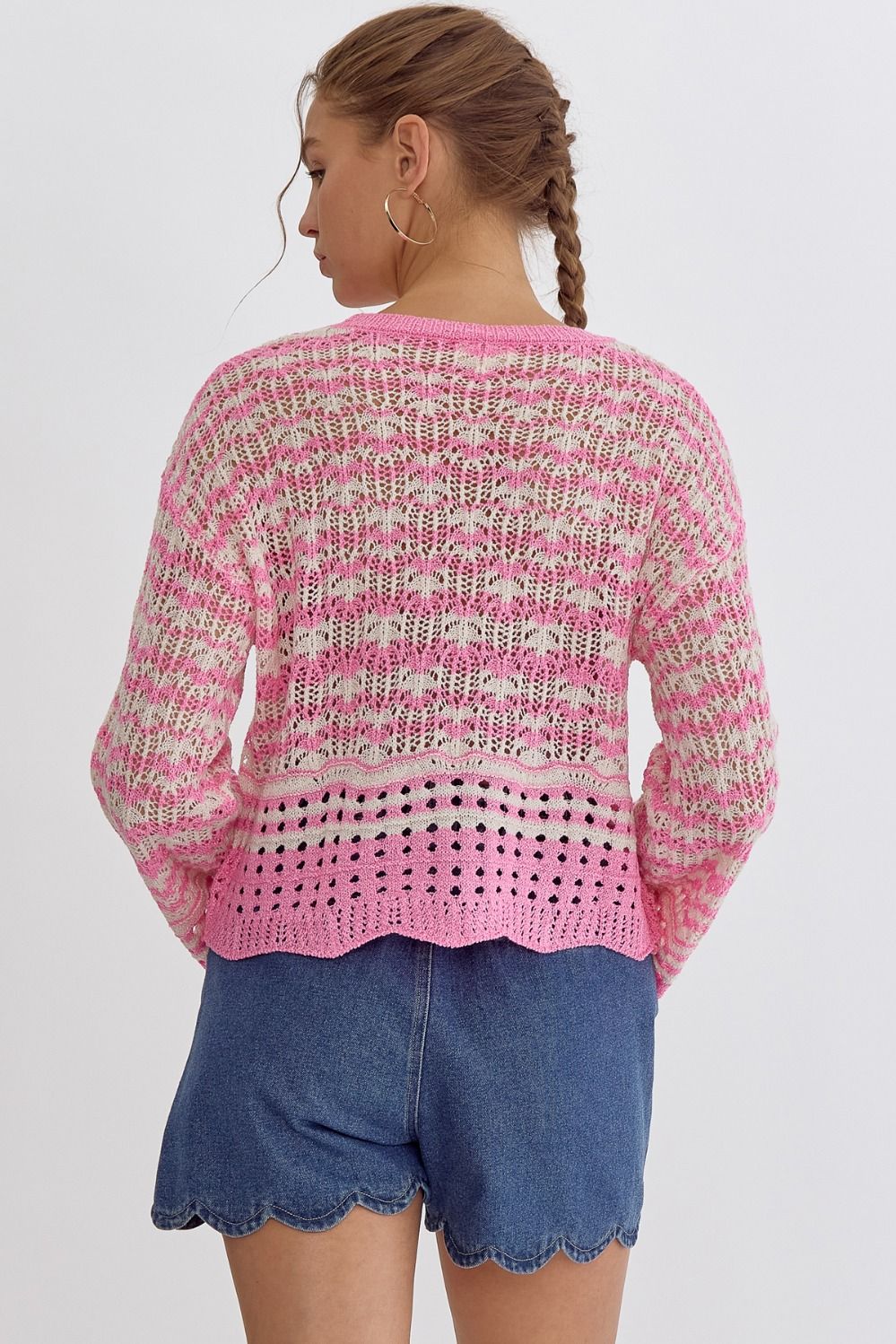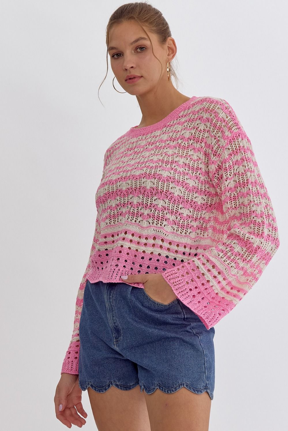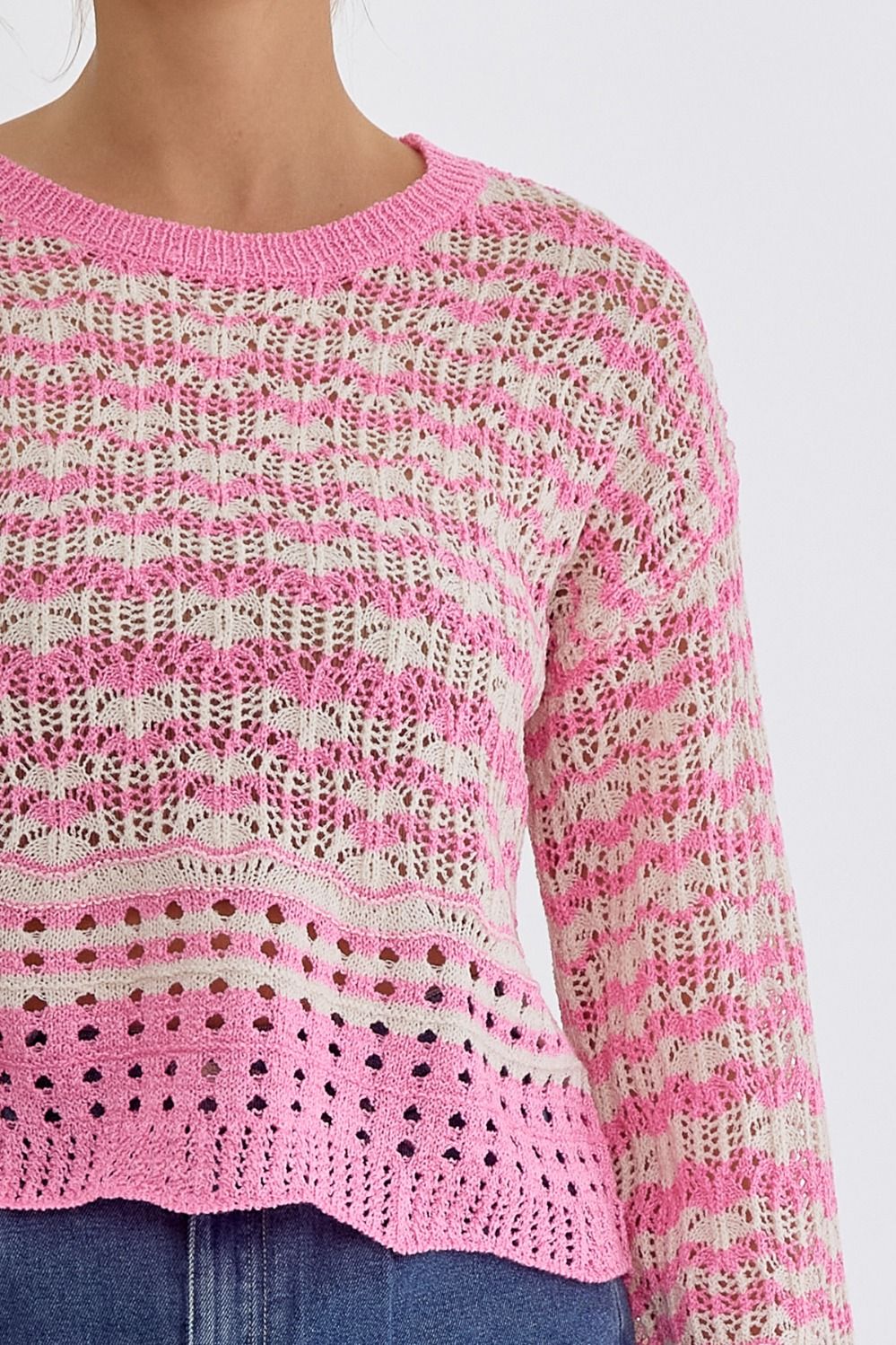 NEW ~ Entro Cotton Candy Pink Striped Round Neck Long Sleeve Crochet Knit Top