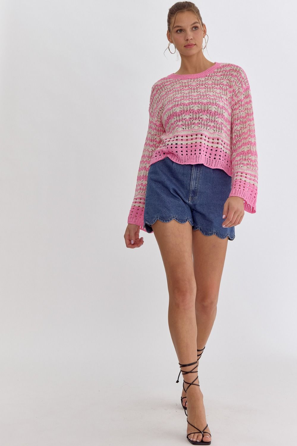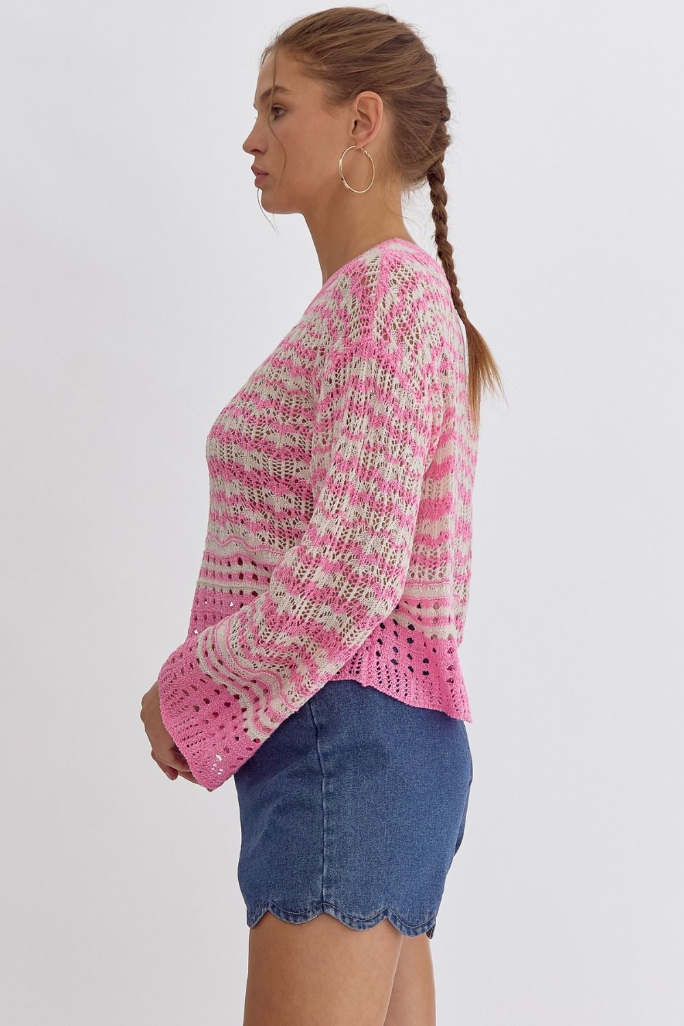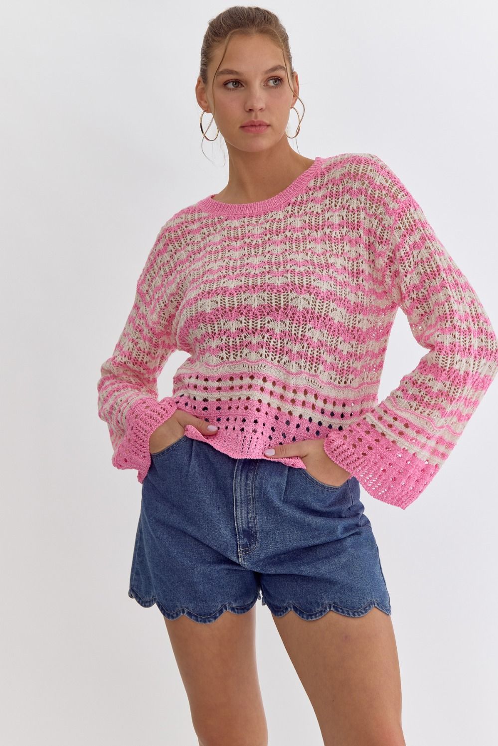 NEW ~ Entro Cotton Candy Pink Striped Round Neck Long Sleeve Crochet Knit Top