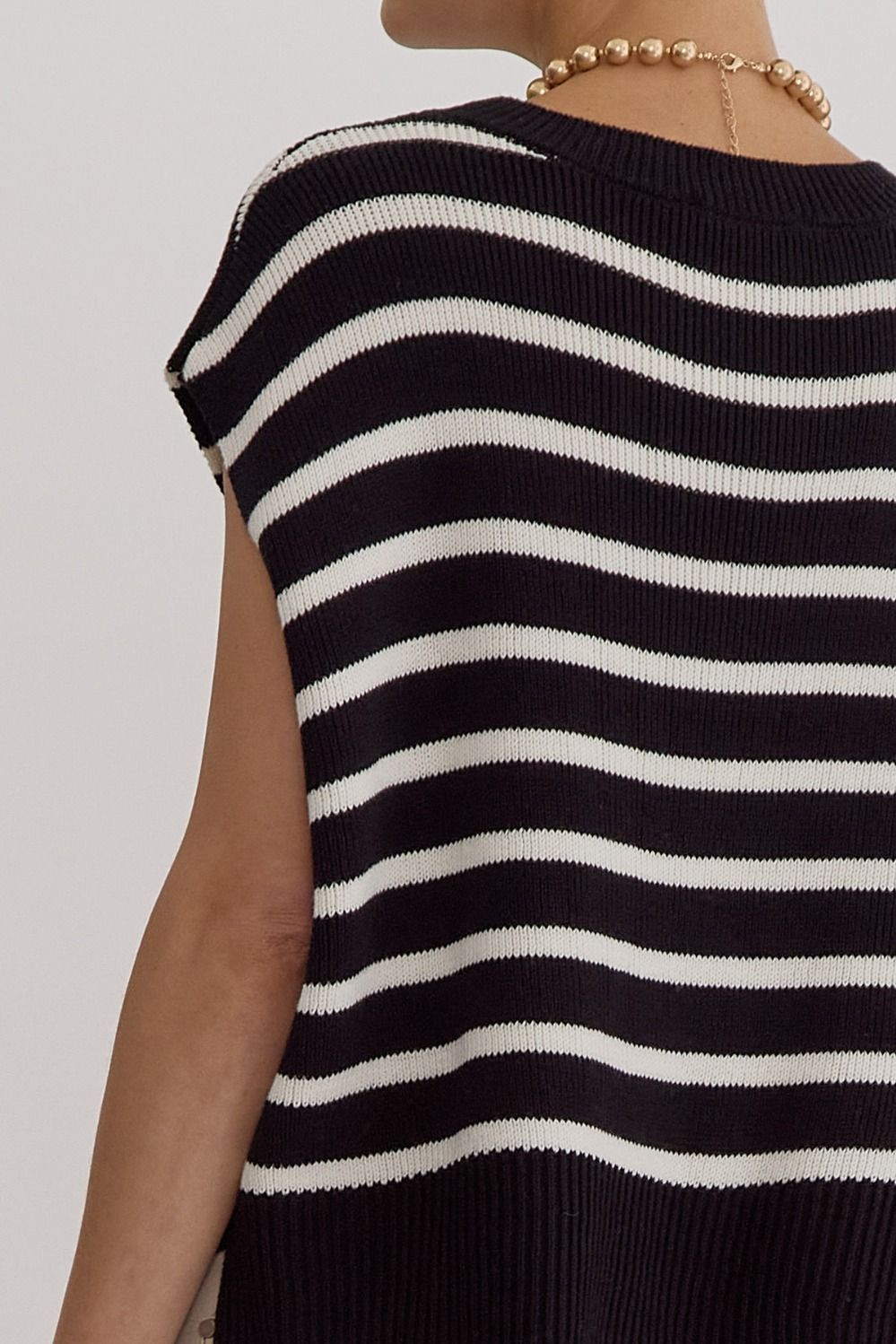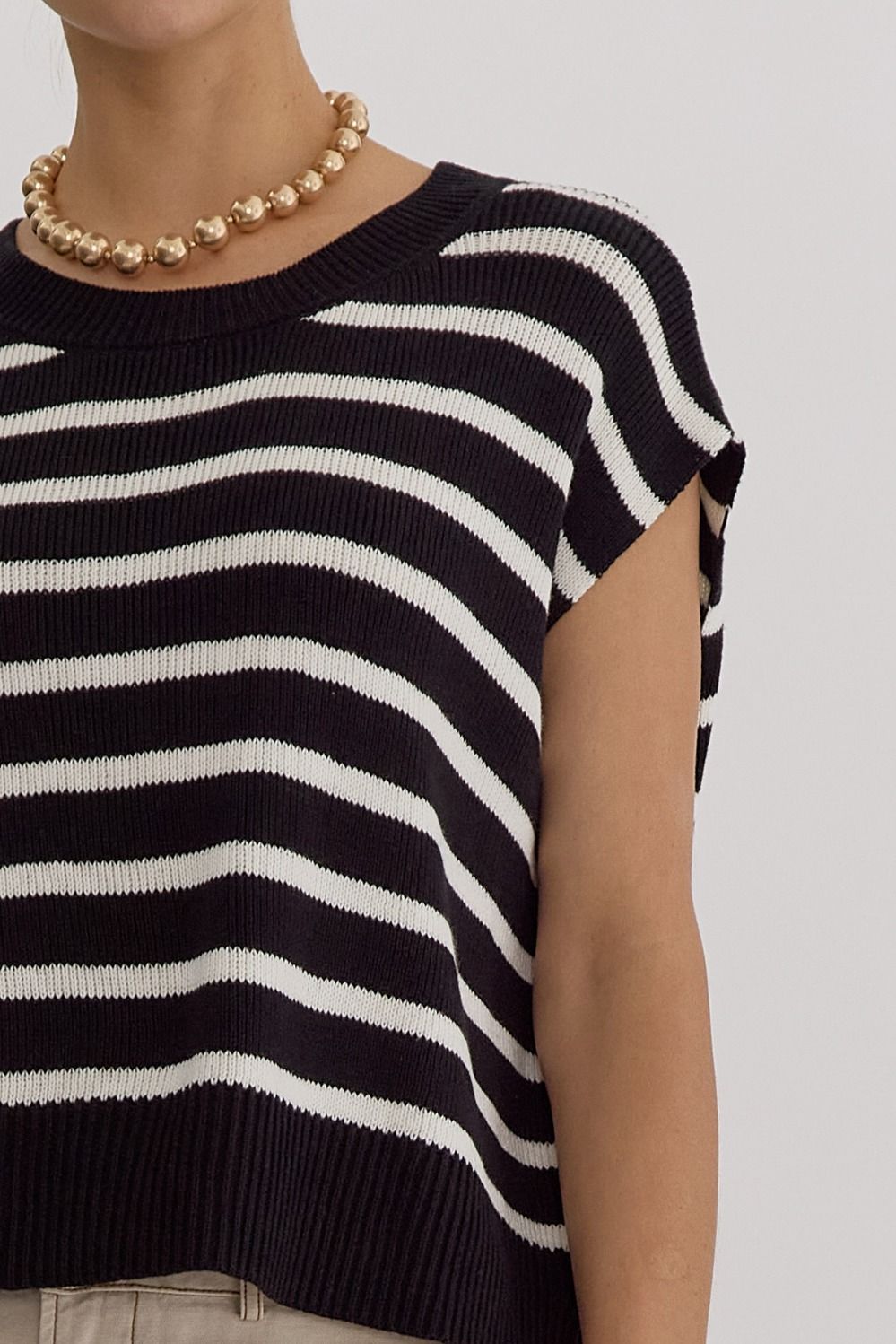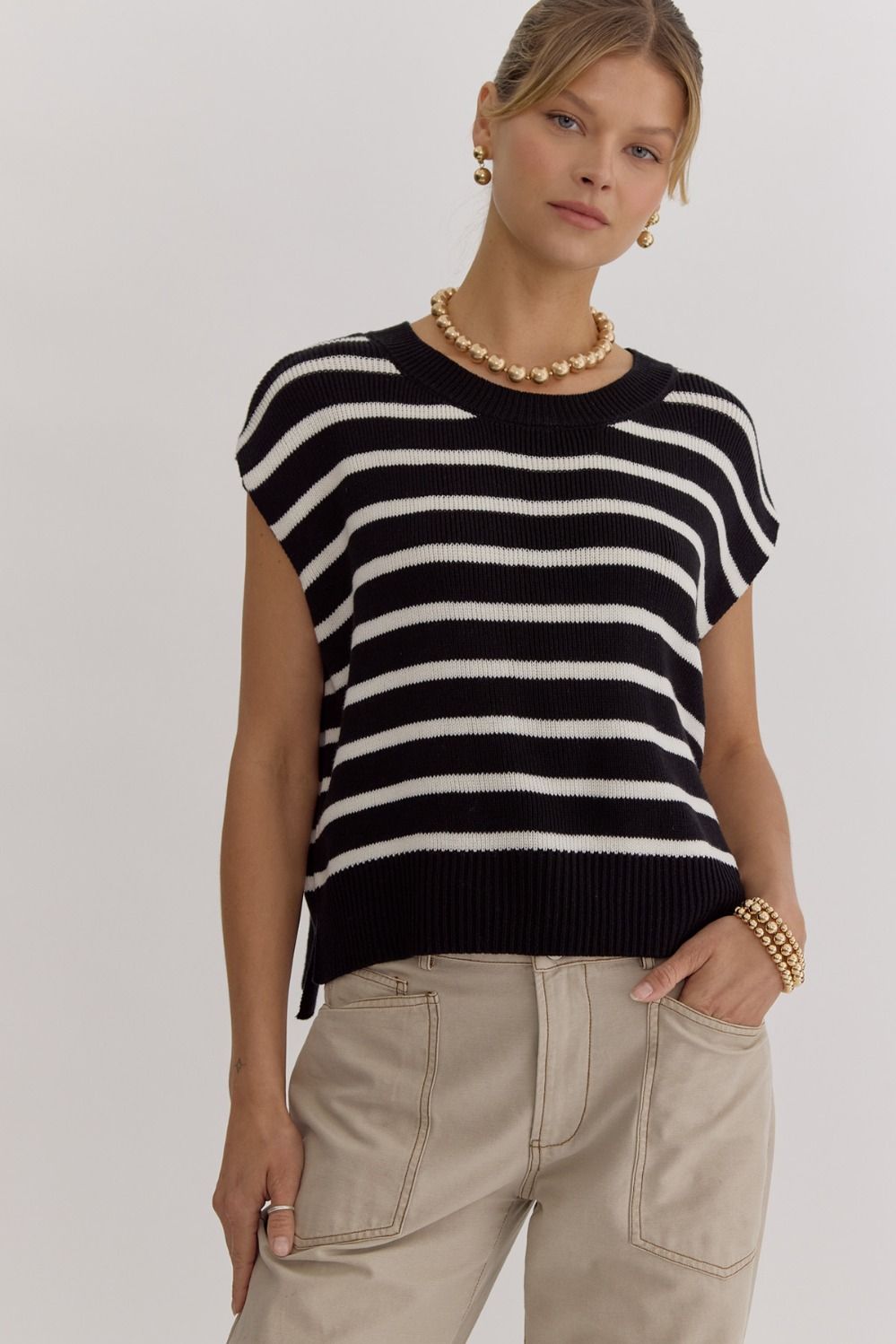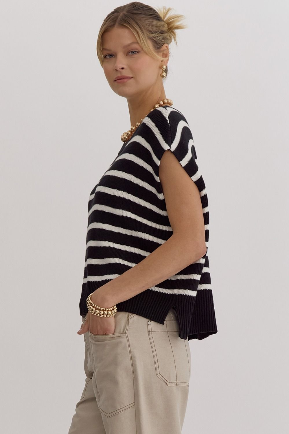 Our NEW ENTRO Stripe Print Round Neck Short Sleeve Knit Top is perfect for any season. Designed with a stylish slit at the sides, this top provides both comfort and fashion. Wear it alone or layer it with your favorite accessories, the options are endless with its versatile design. Non-sheer - medium weight and soft, this knit top is perfect for any occasion.