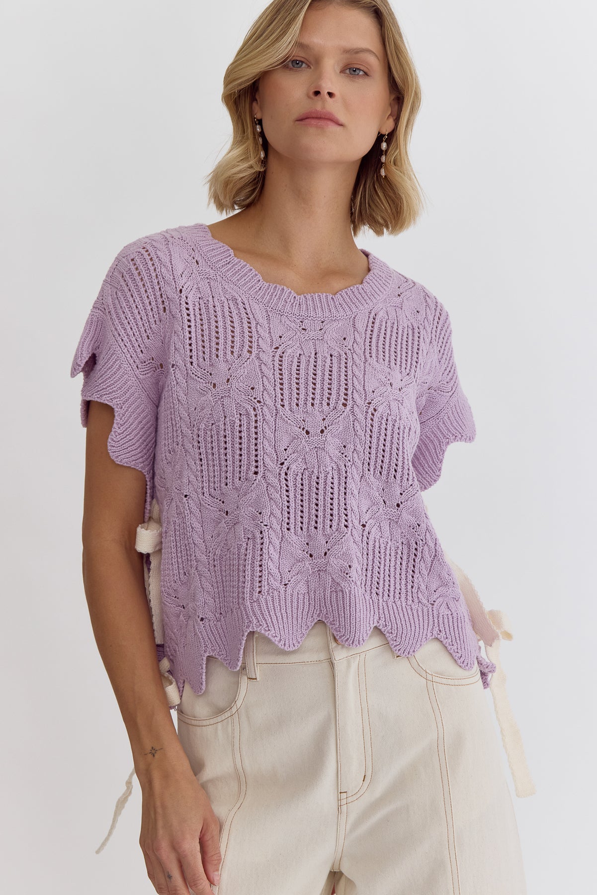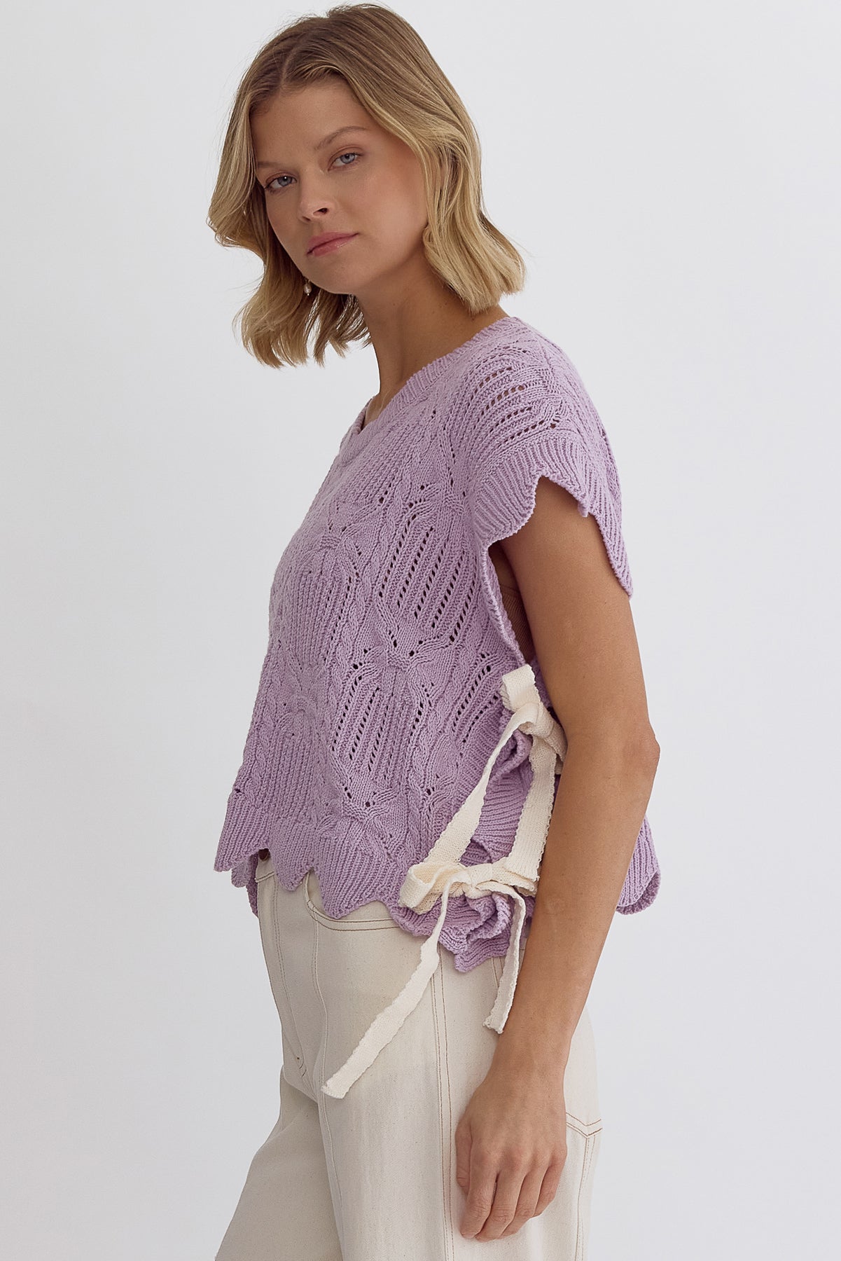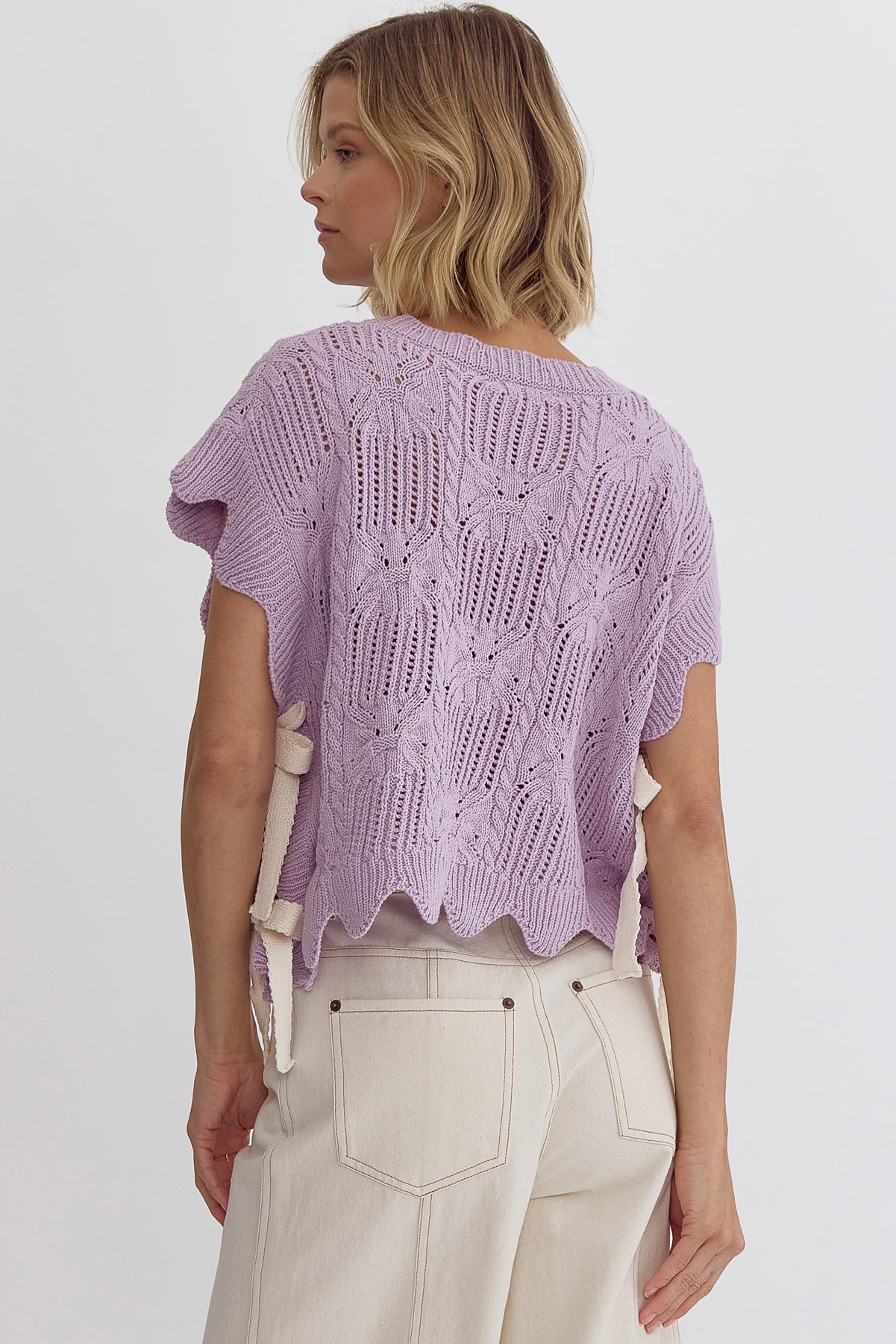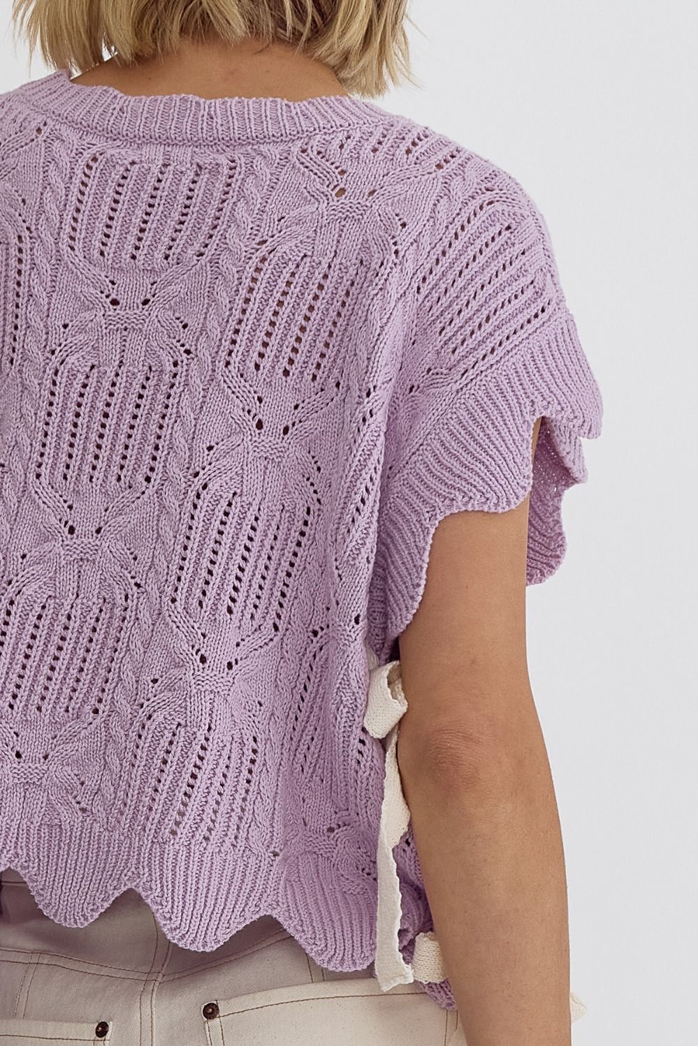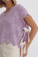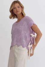 Entro's LAVENDER Crochet Knit Short Sleeve Crop Top Sweater is the perfect way to embrace spring fashion. The scalloped hem and self-tie bow detail at the sides add a delicate touch to this lightweight, non-sheer knit top. With its unlined design, you can easily layer it with a cami or bralette for added versatility. The epitome of spring vibes, this top is a must-have for any fashionista's wardrobe!