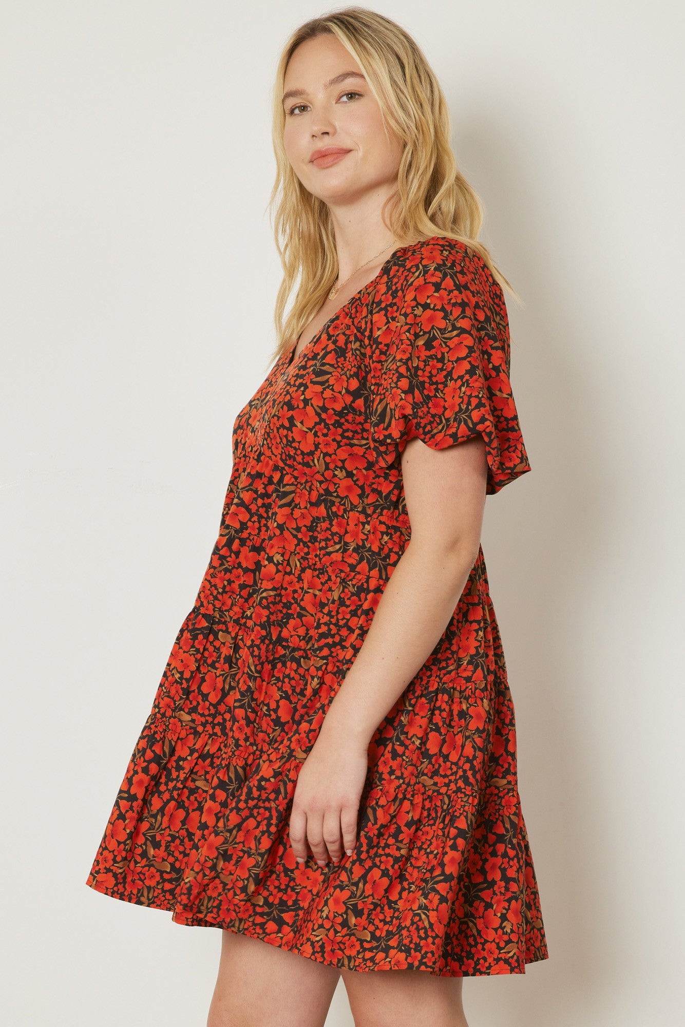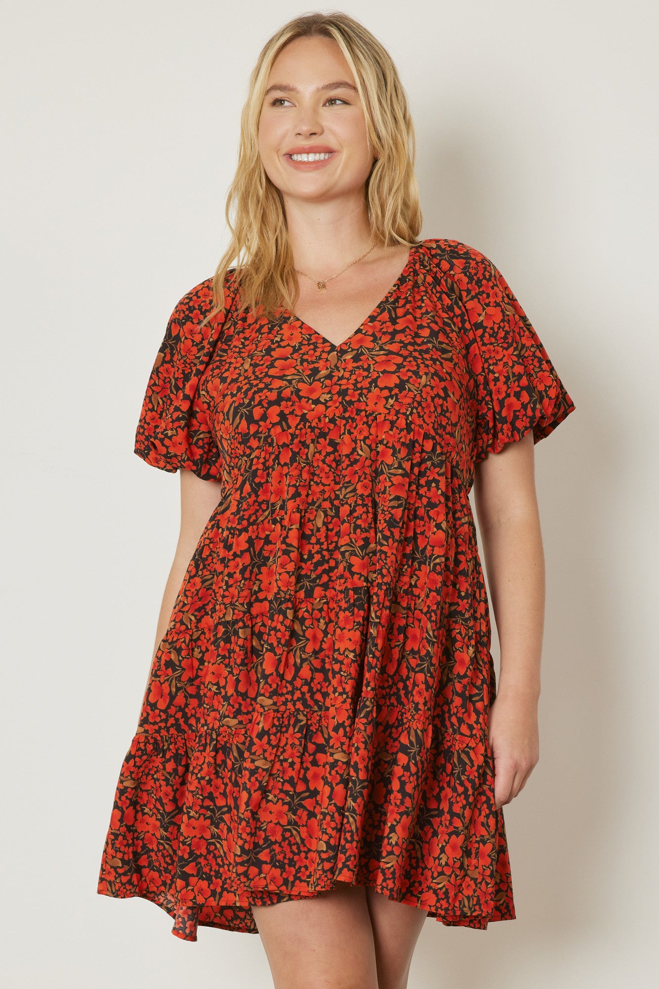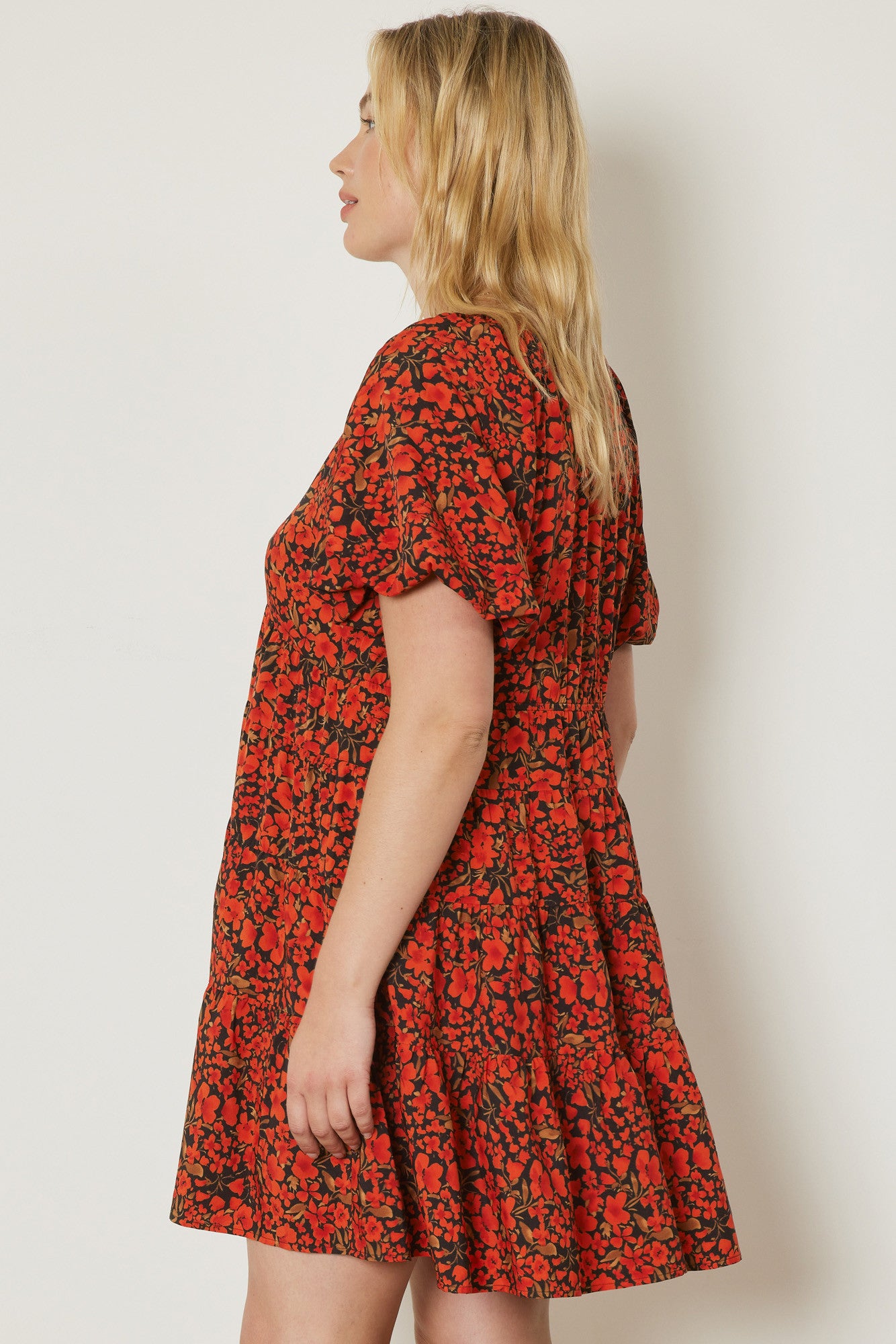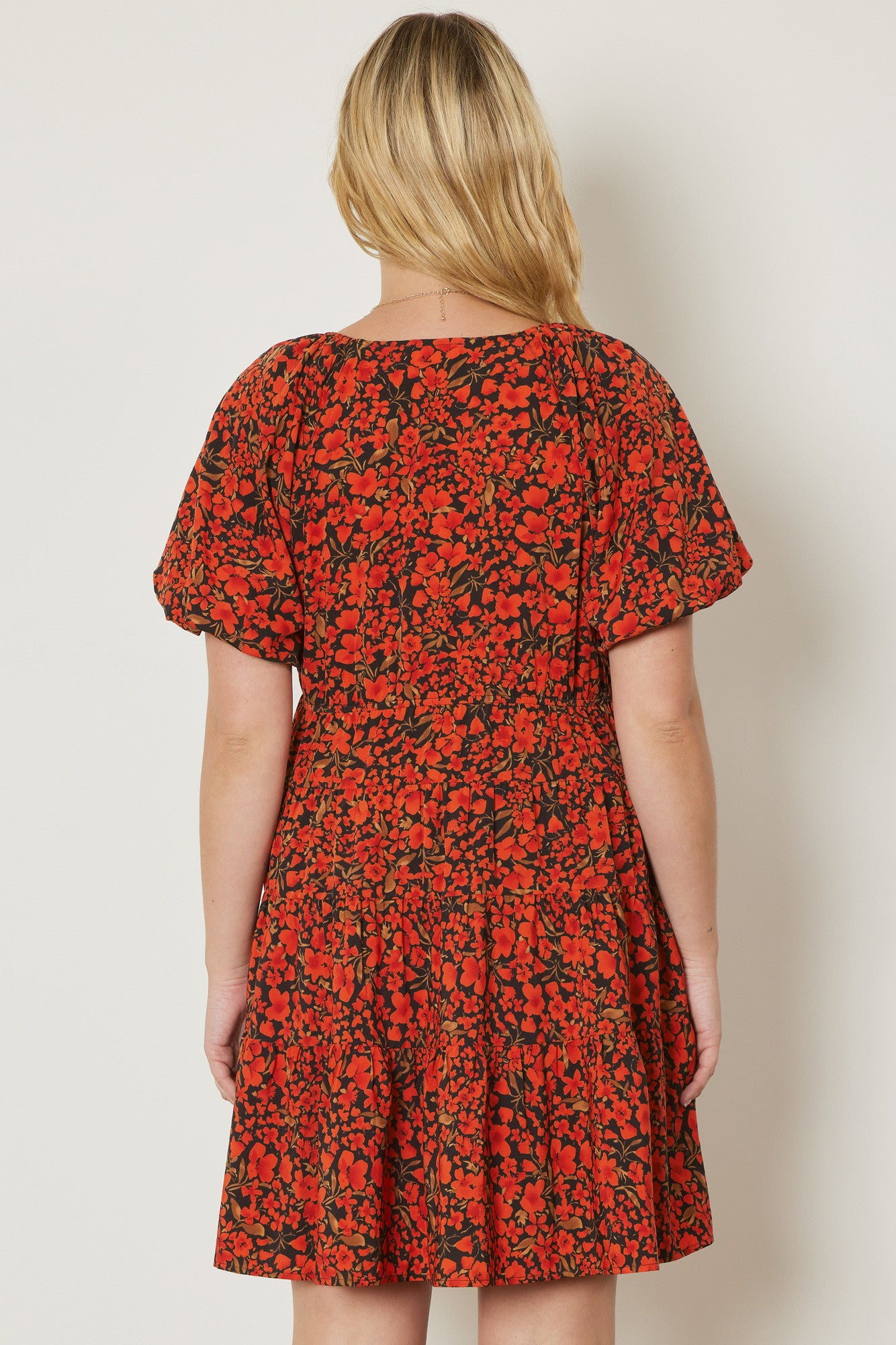 Floral print v-neck bubble sleeve tiered mini dress featuring elastic at back waist. Lined. Woven. Non-sheer. Lightweight.