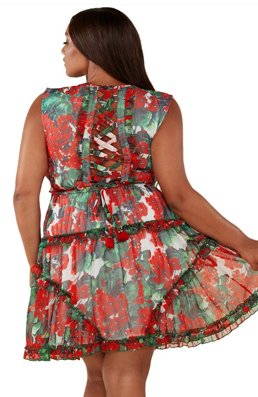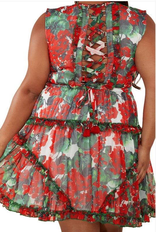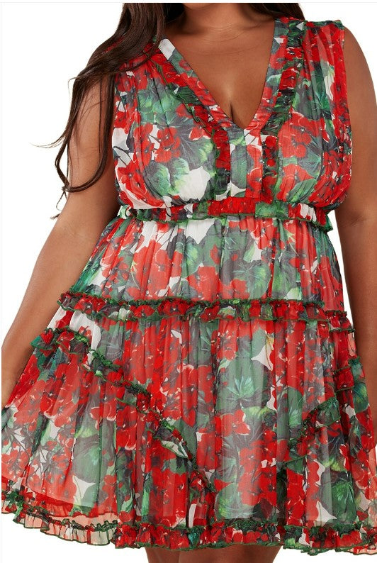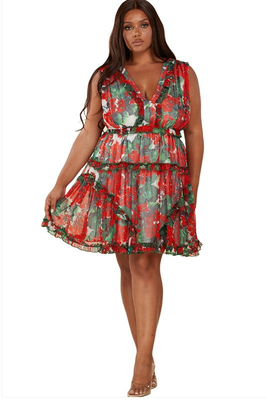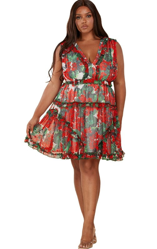 Latiste - Red and Green Floral Print Chiffon Dress Mini Dress ~ CURVY