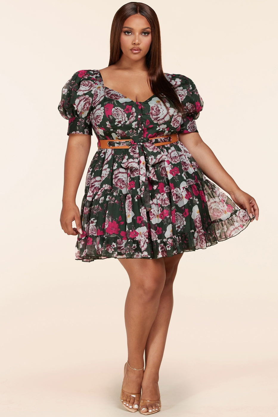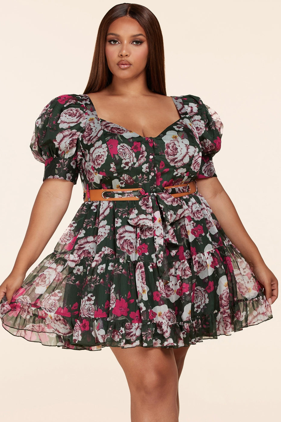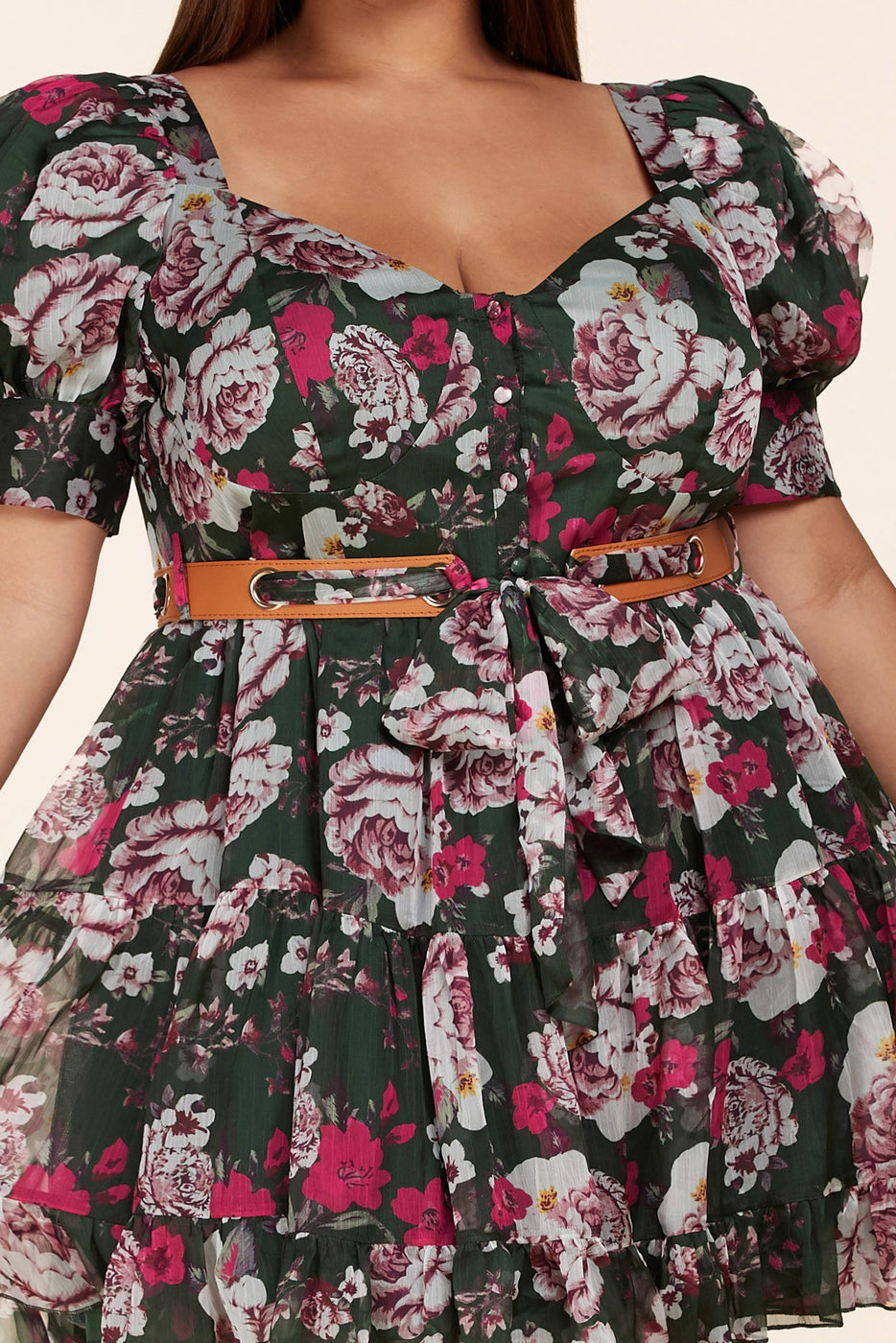 Latiste Forest Green Mini Dress features a multishade pink floral print with an alluring sweetheart neckline, puff sleeves and a tiered skirt with a ruffled hem. Dress buttons up the front with fabric buttons and a leather-esque+ fabric belt which ties and cinches your waist!