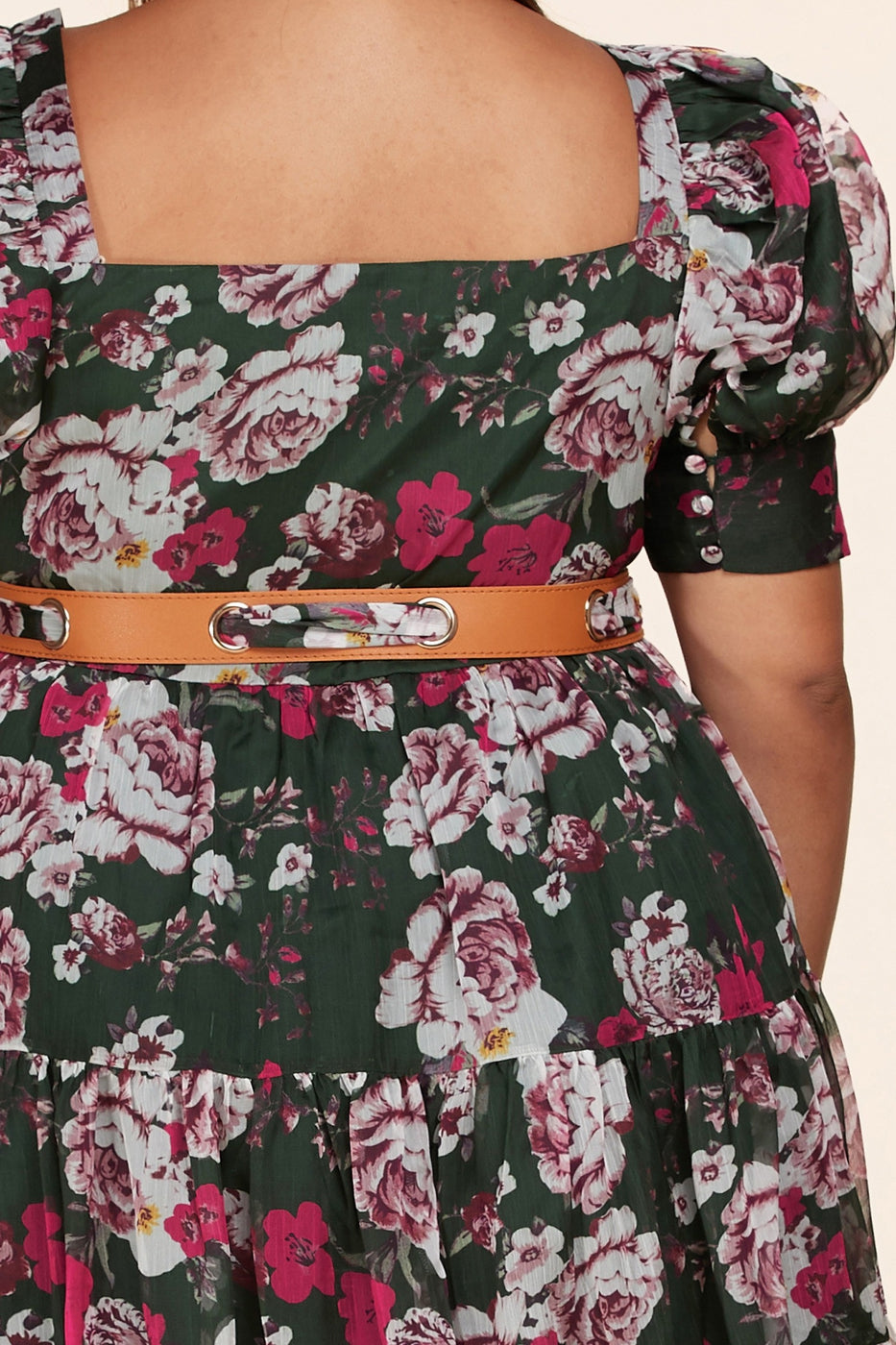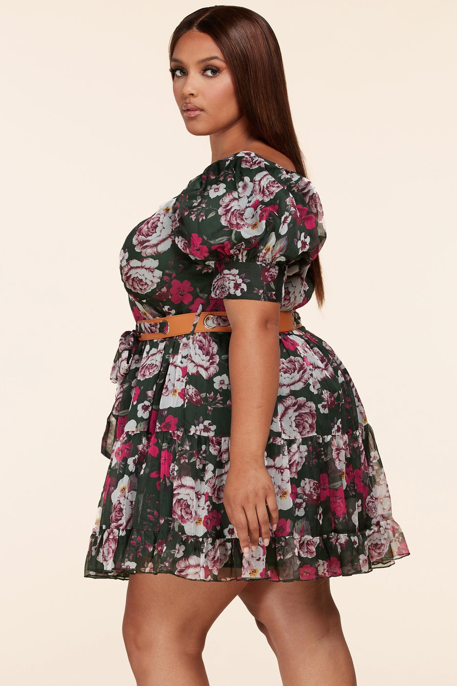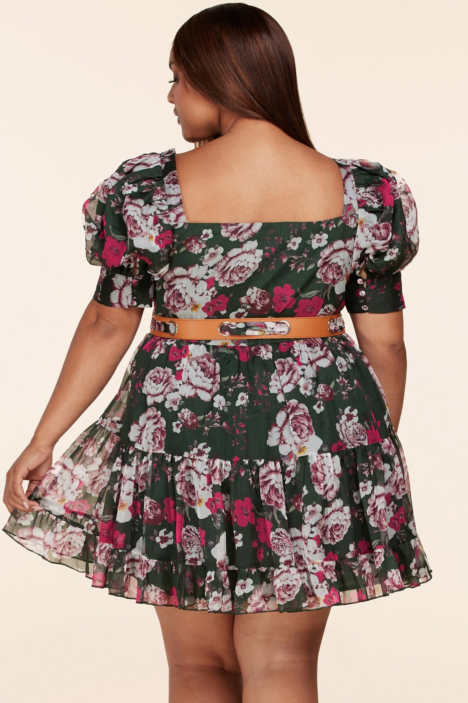 Latiste Forest Green Mini Dress features a multishade pink floral print with an alluring sweetheart neckline, puff sleeves and a tiered skirt with a ruffled hem. Dress buttons up the front with fabric buttons and a leather-esque+ fabric belt which ties and cinches your waist!