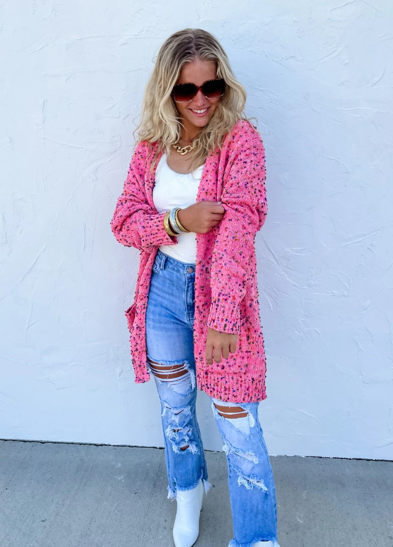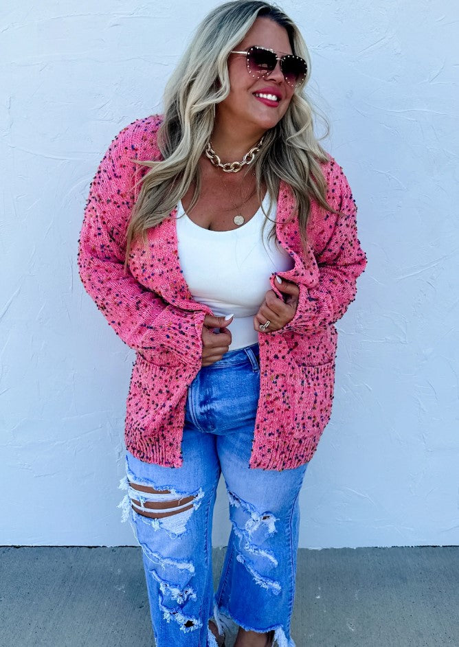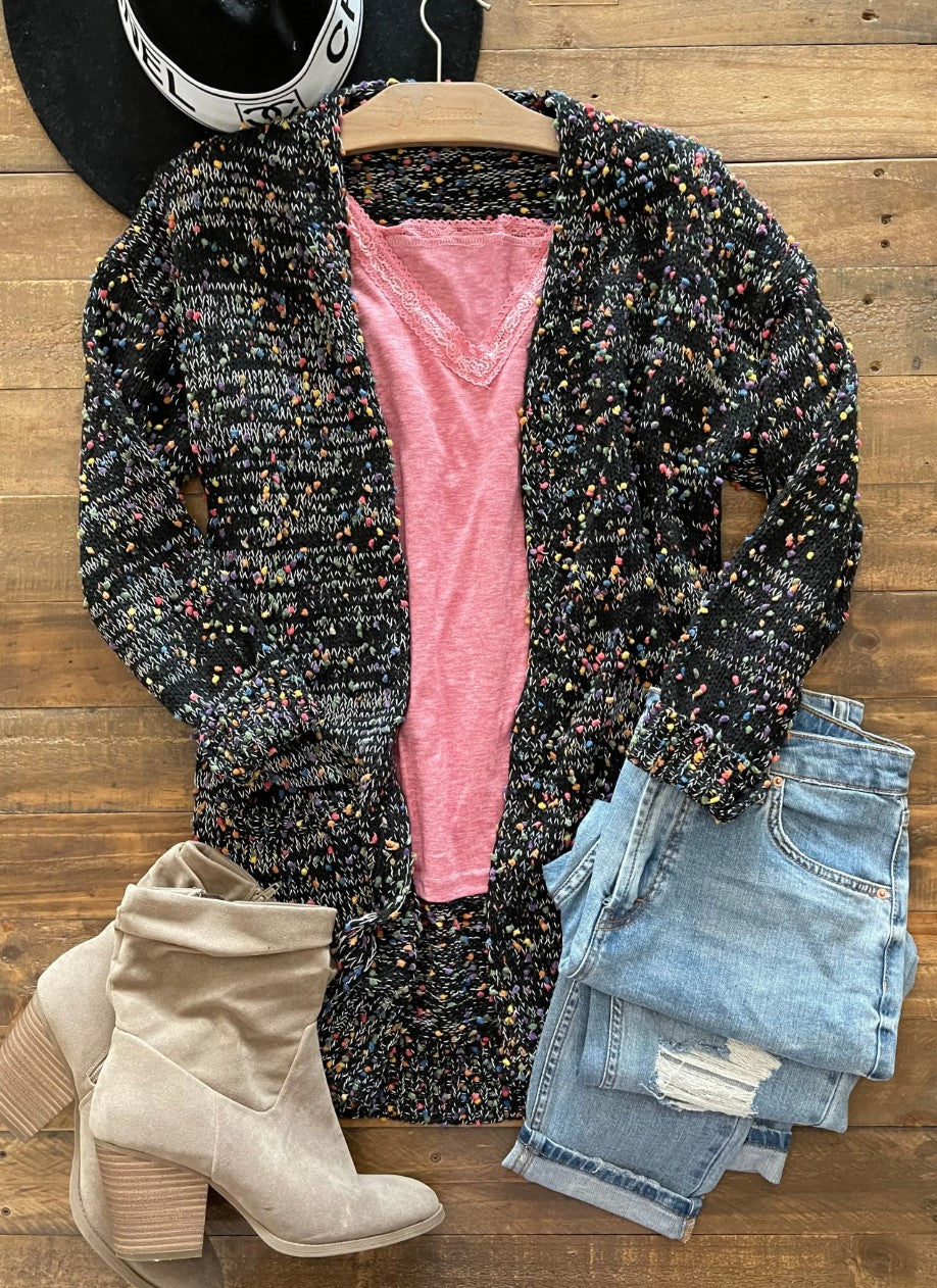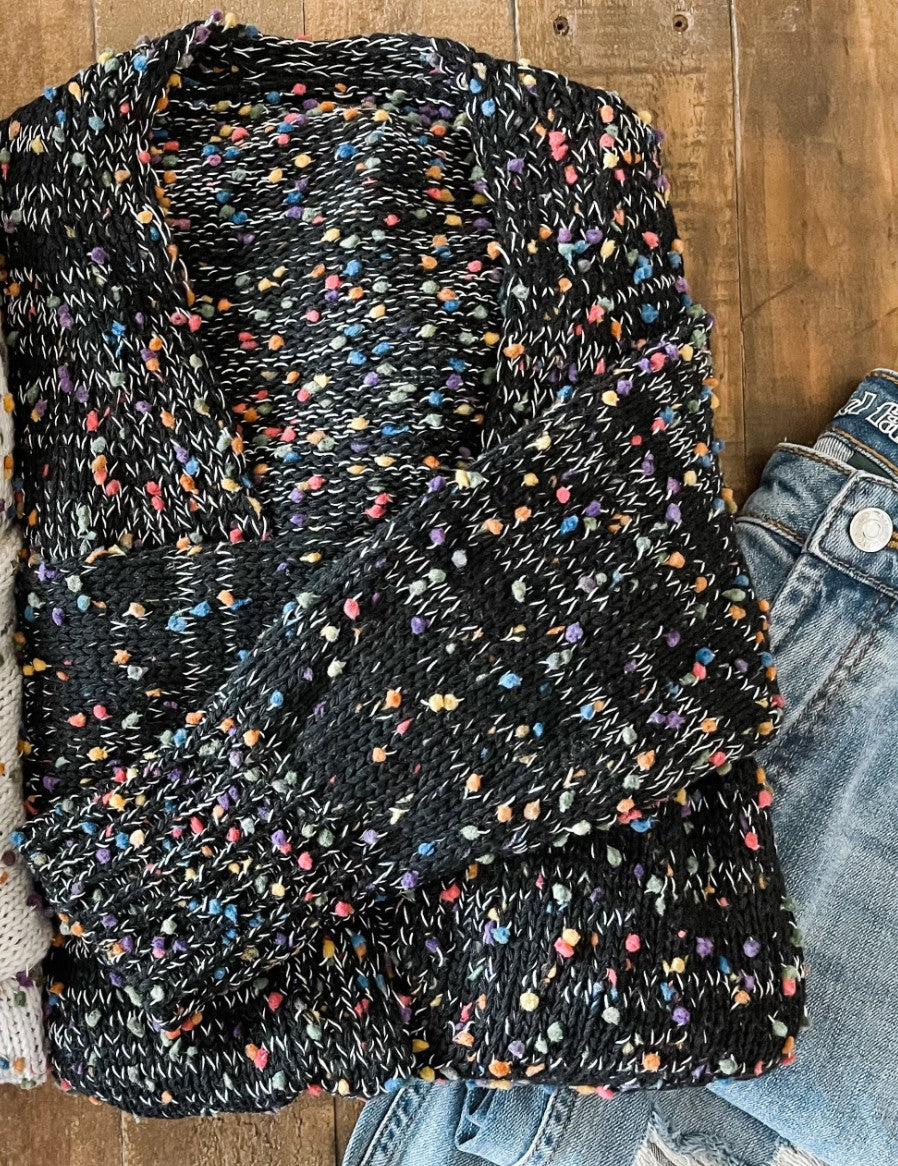 Our Celebrations Confetti Cardigan is a chunky sweater knit fabric that is cozy and oh sooooo soft! Features side pockets and multi-color "confetti" dots throughout.