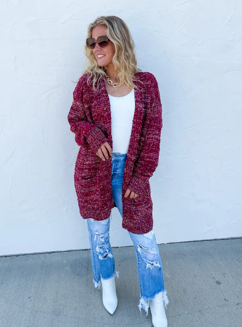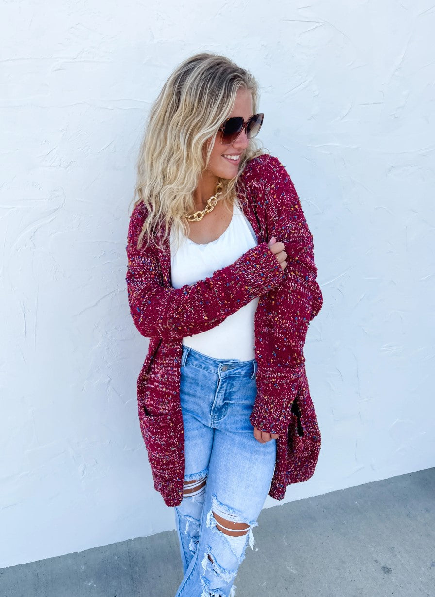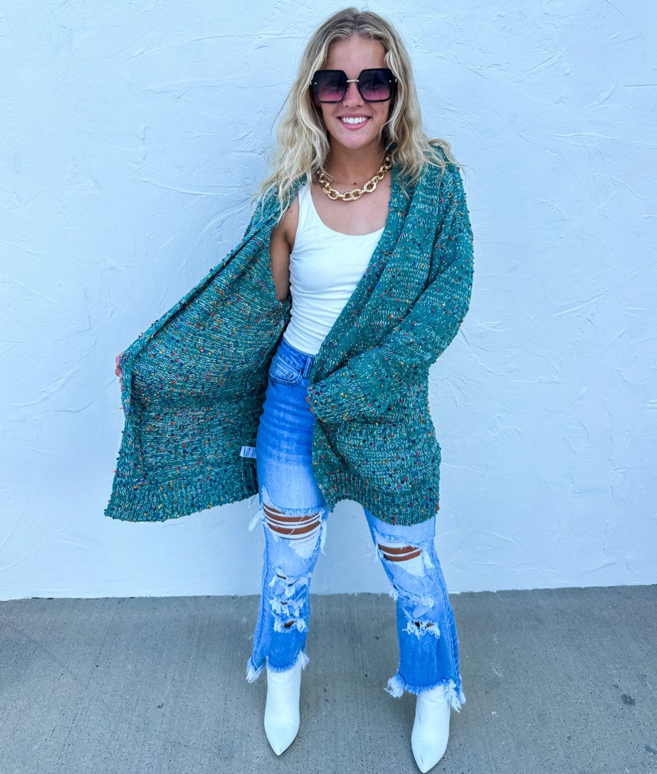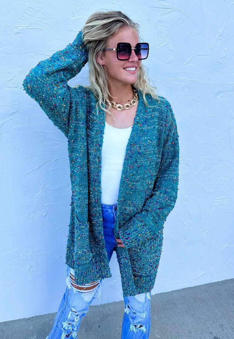 Our Celebrations Confetti Cardigan is a chunky sweater knit fabric that is cozy and oh sooooo soft! Features side pockets and multi-color "confetti" dots throughout.
