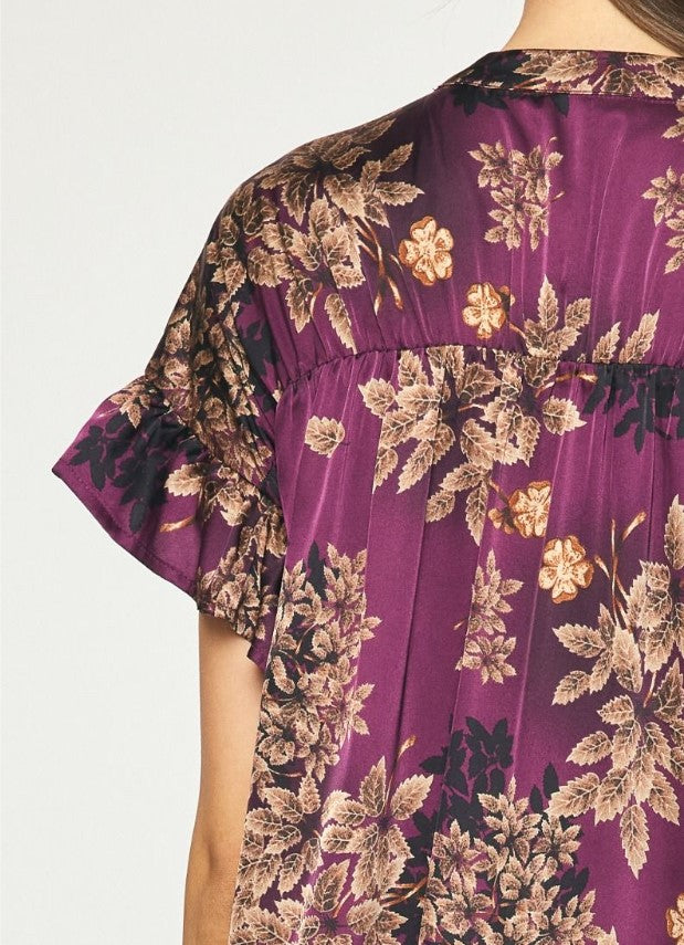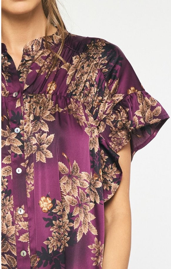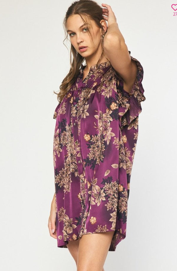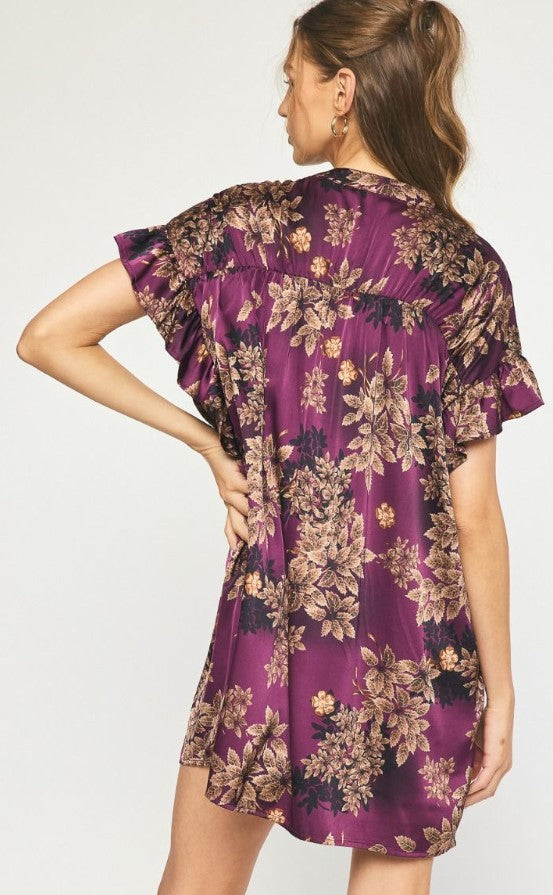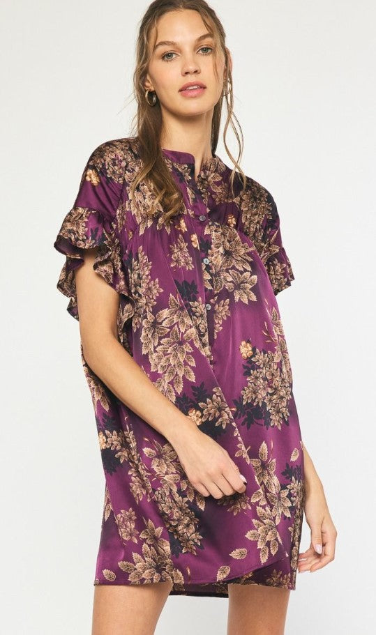 ENTRO Satin Floral Print Button Up Mini Dress - Deep Eggplant!