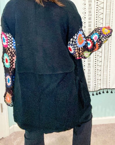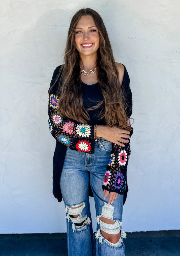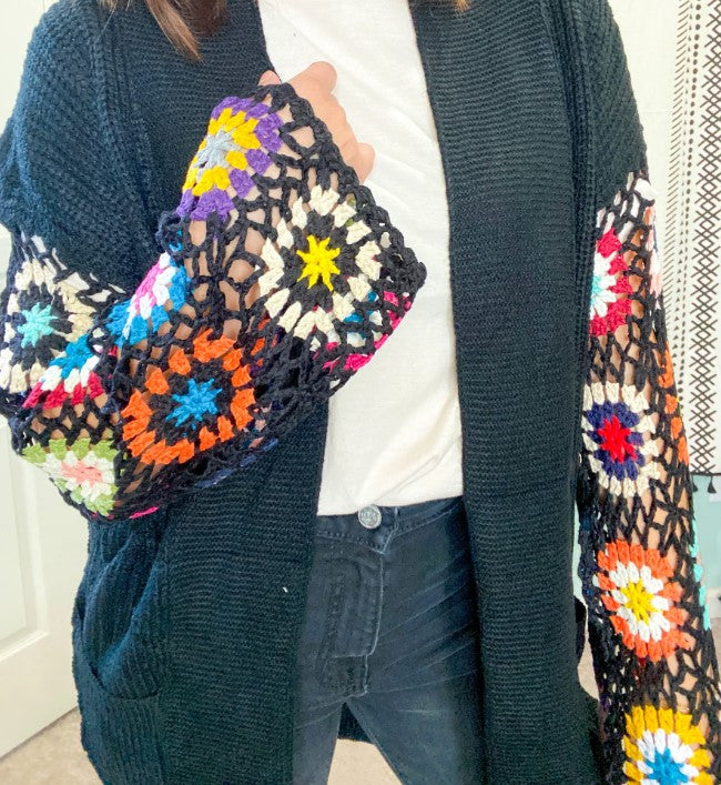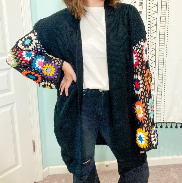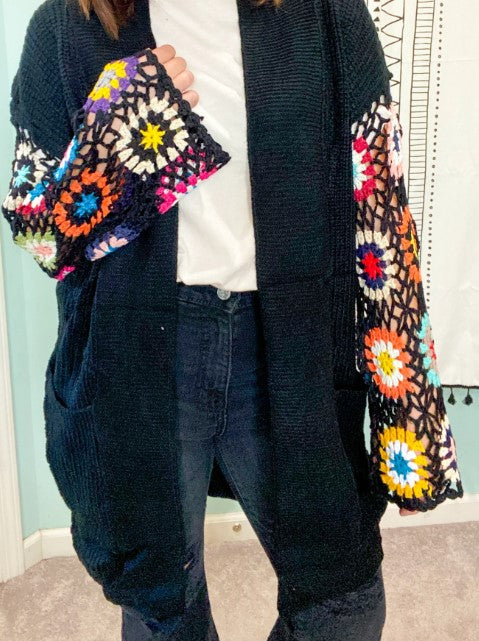 Rita Rainbow Crochet Sleeve Black Cardigan - Available in Curvy!