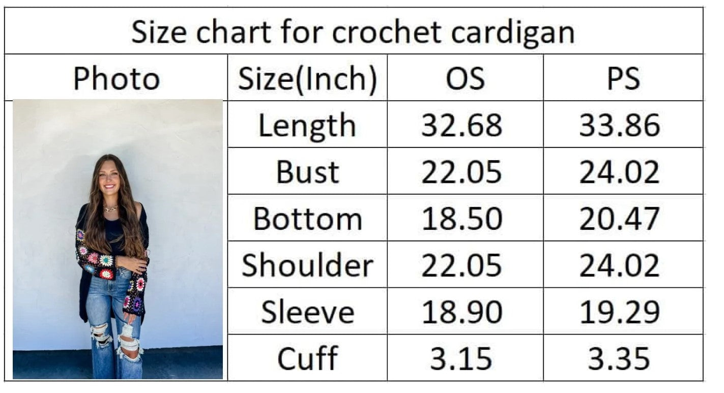 True to size with a relaxed cut.  Cardigan body has mild stretch, crochet sleeves do not stretch