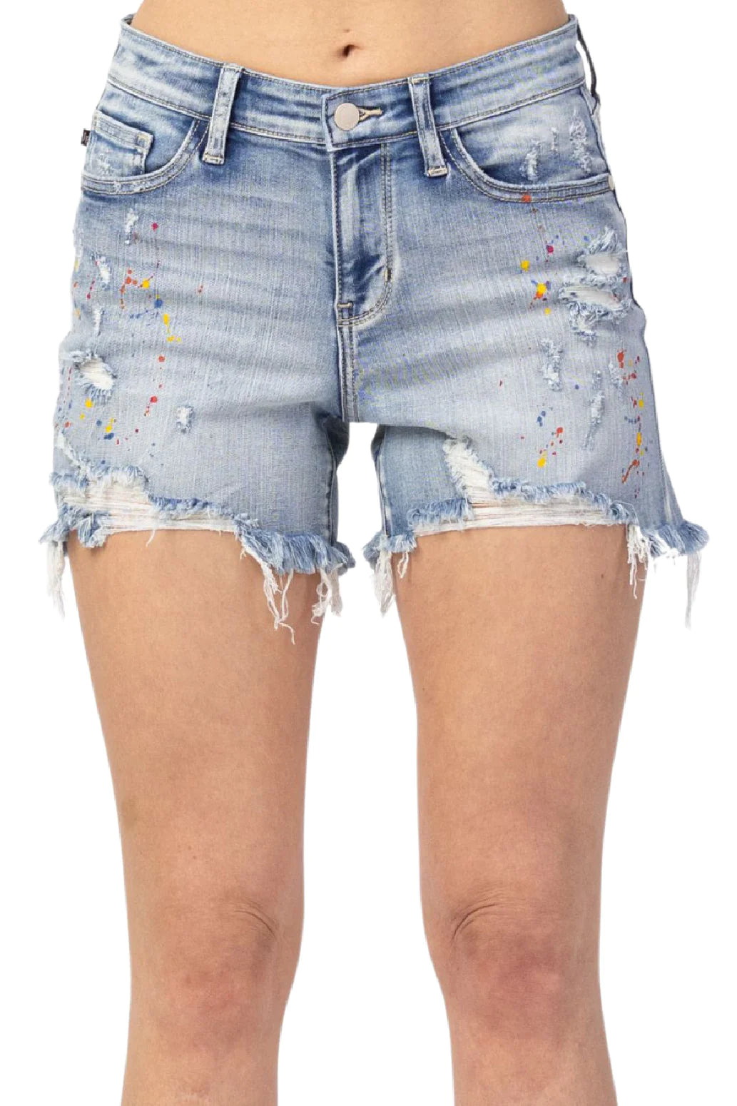 Judy Blue ~ Mid-Rise Rainbow Paint Splash Cutoff Shorts ~ Style 15245
