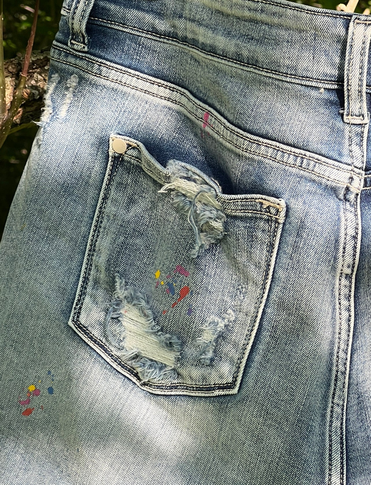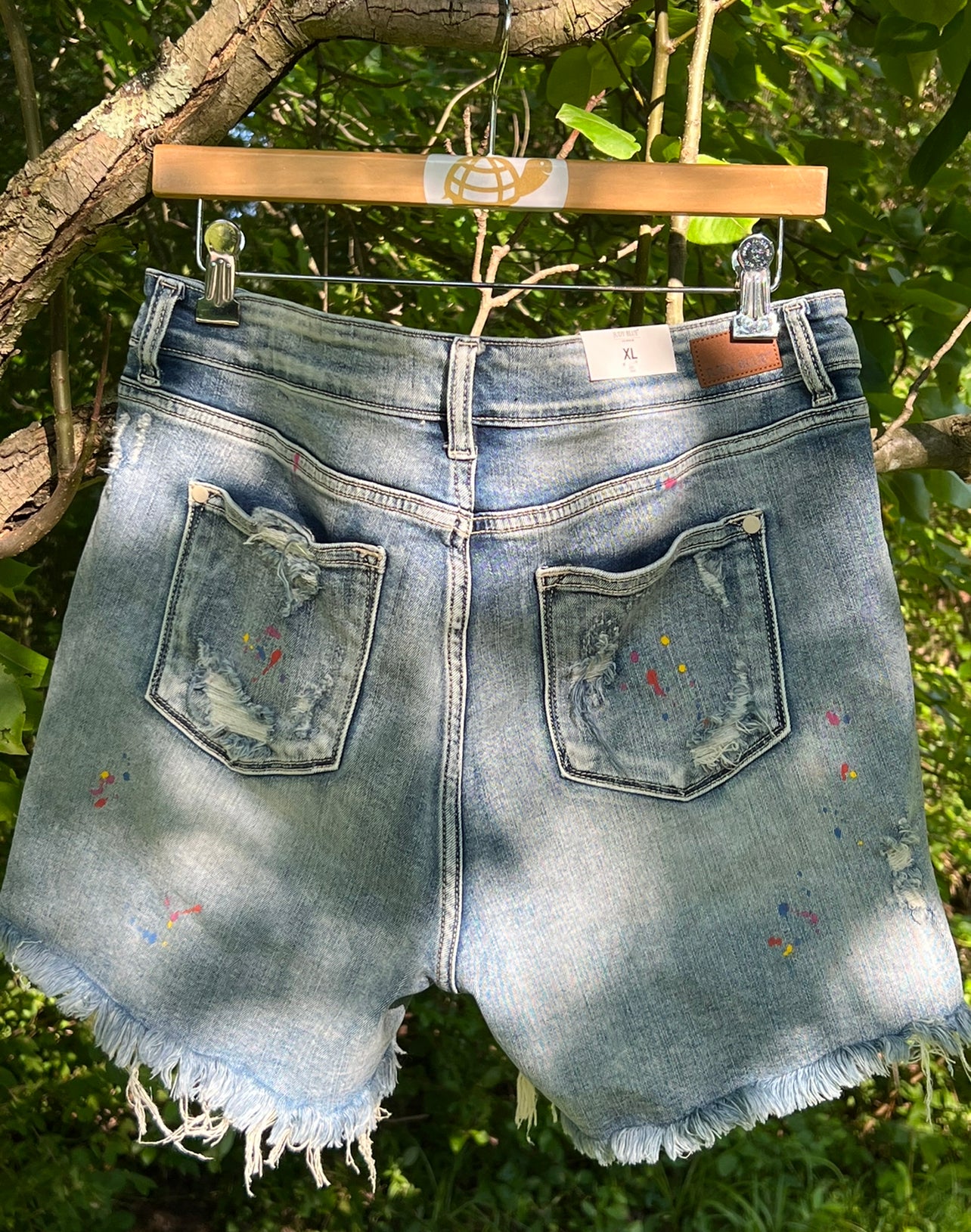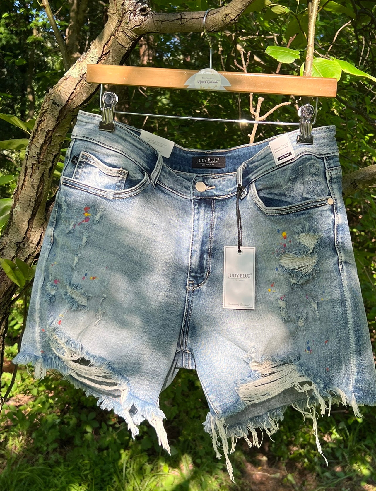 Judy Blue Mid-Rise Rainbow Paint Splash Cutoff Shorts - LOVE the distressing and the rainbow paint splatter and the signature stretch!