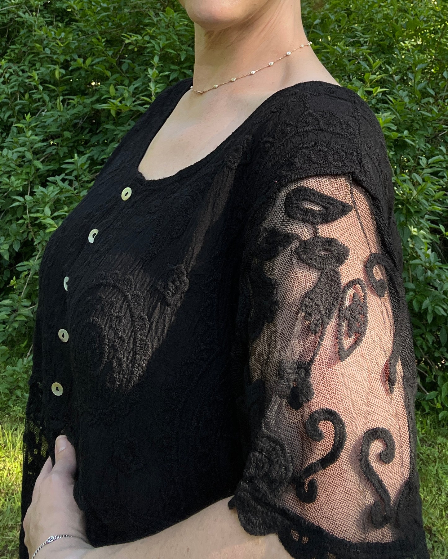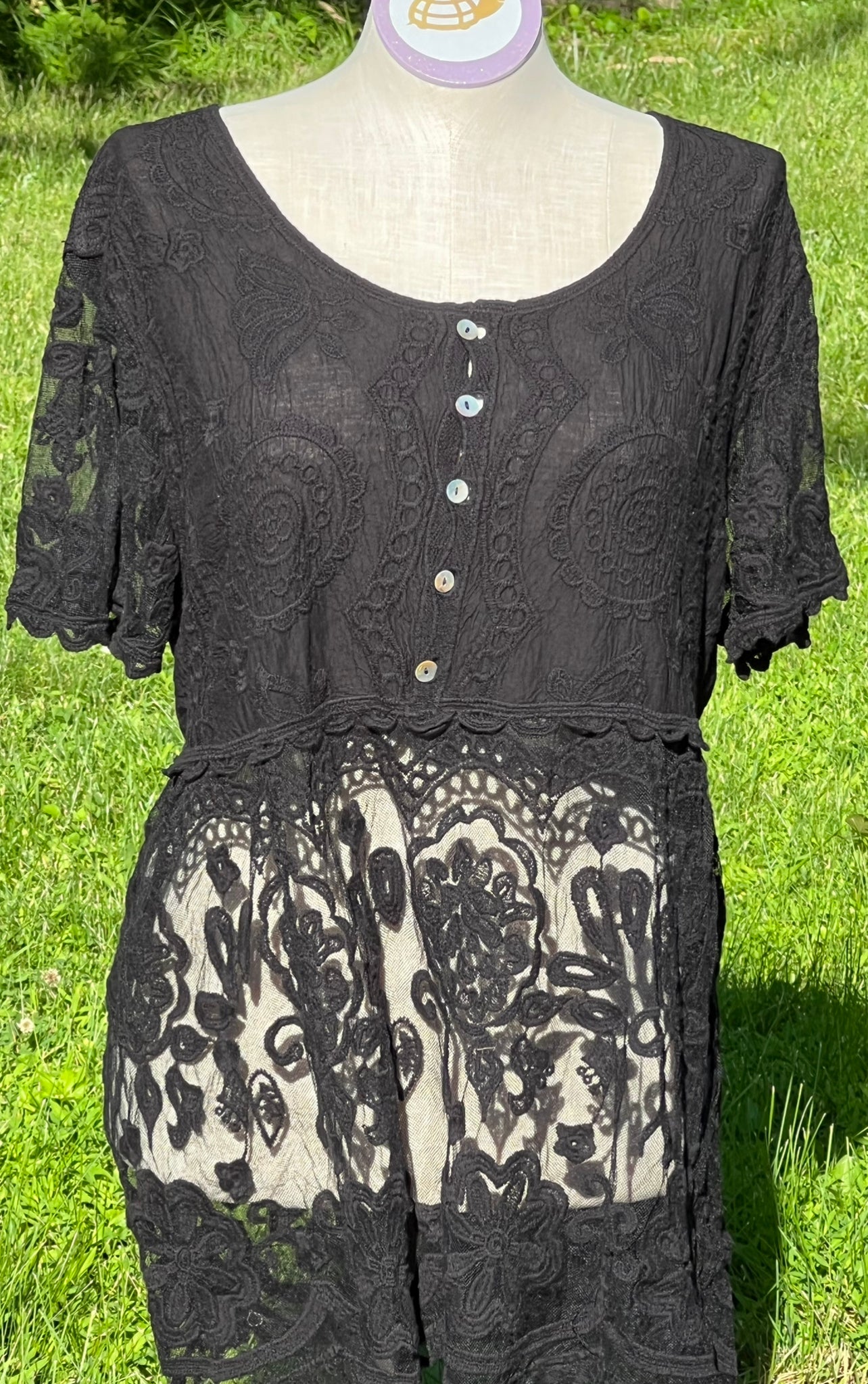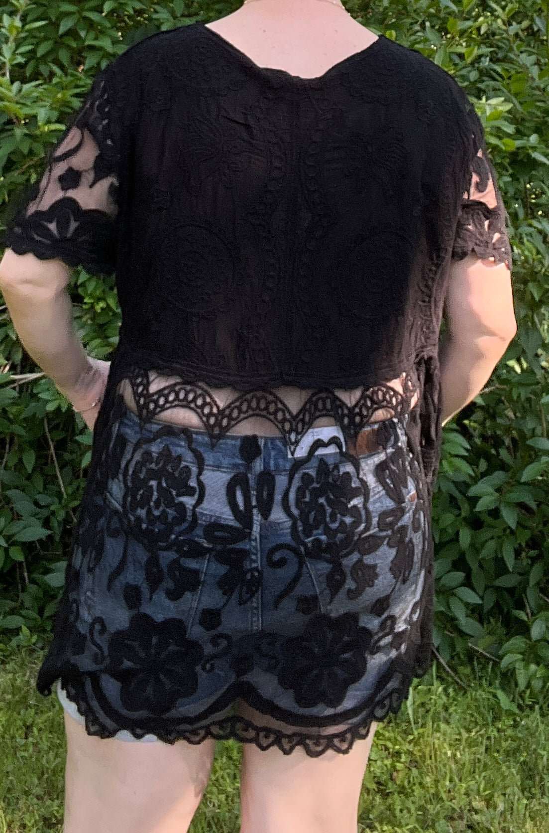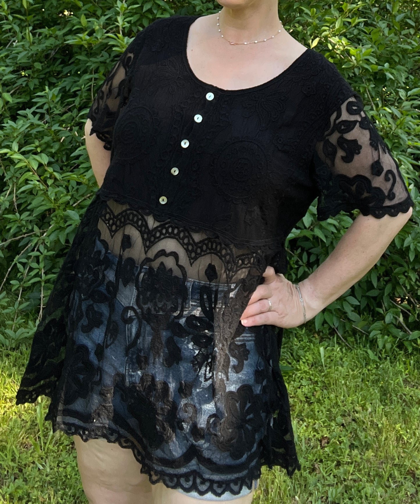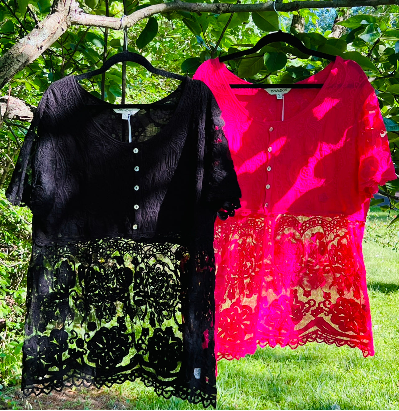 Introducing the Crochet and Sheer Tulle Button Down Top - Both Fuchsia and Black are available! There are so many intricate details in this top - from a crocheted design on the top - to the sheer tulle-like (much softer than tulle!) short sleeves and bottom panel.