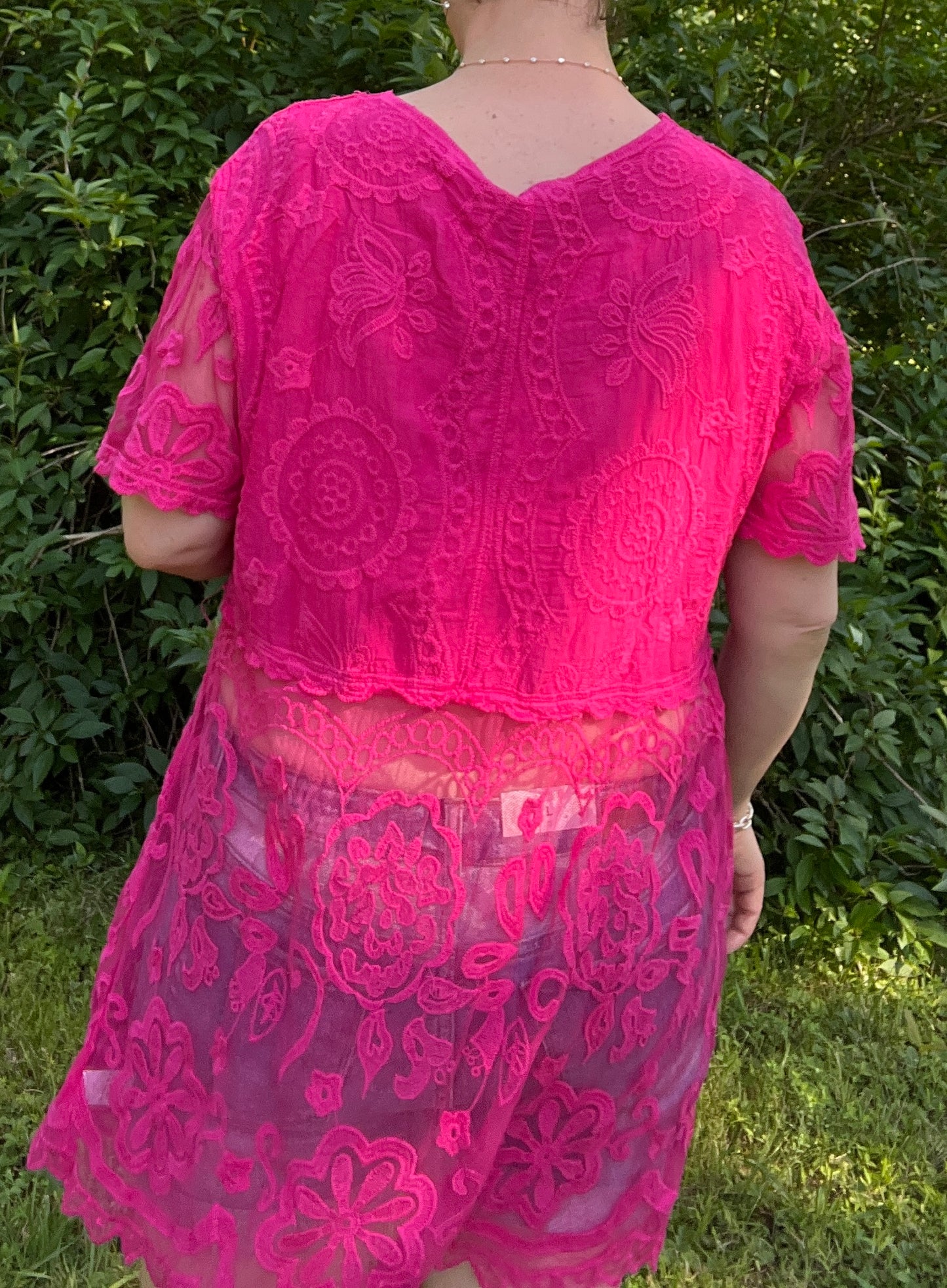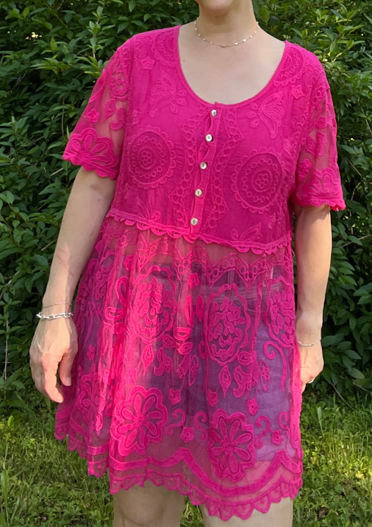 Crochet and Sheer Tulle Button Down Top ~ Fuchsia & Black ~ Available in Curvy too!